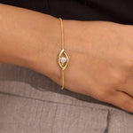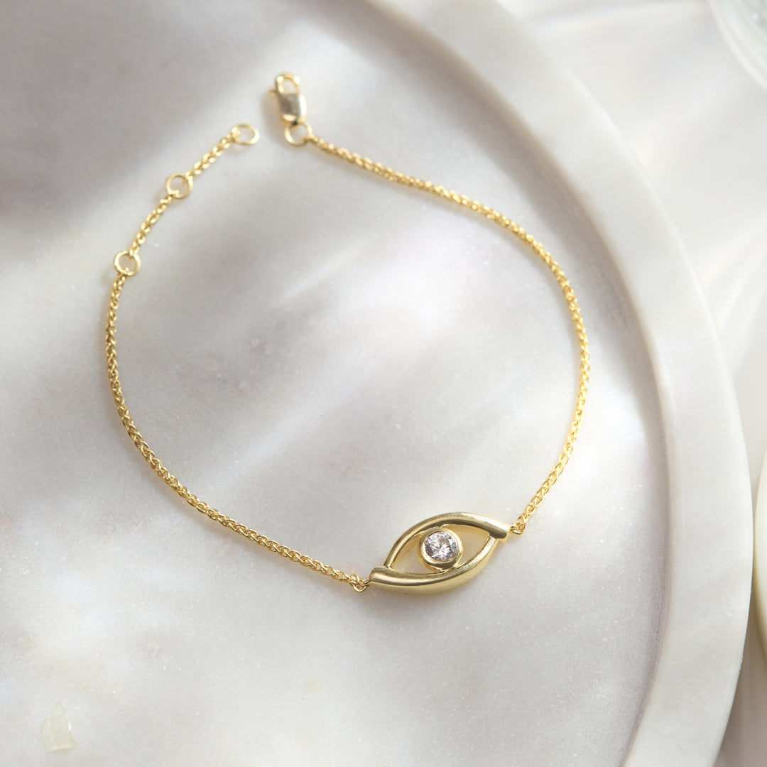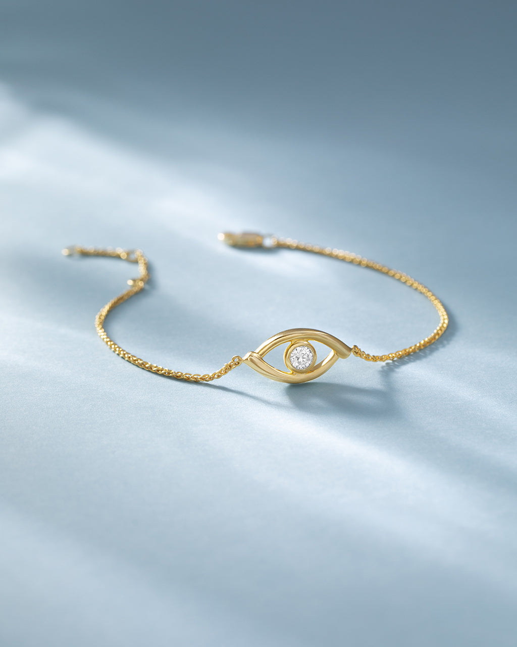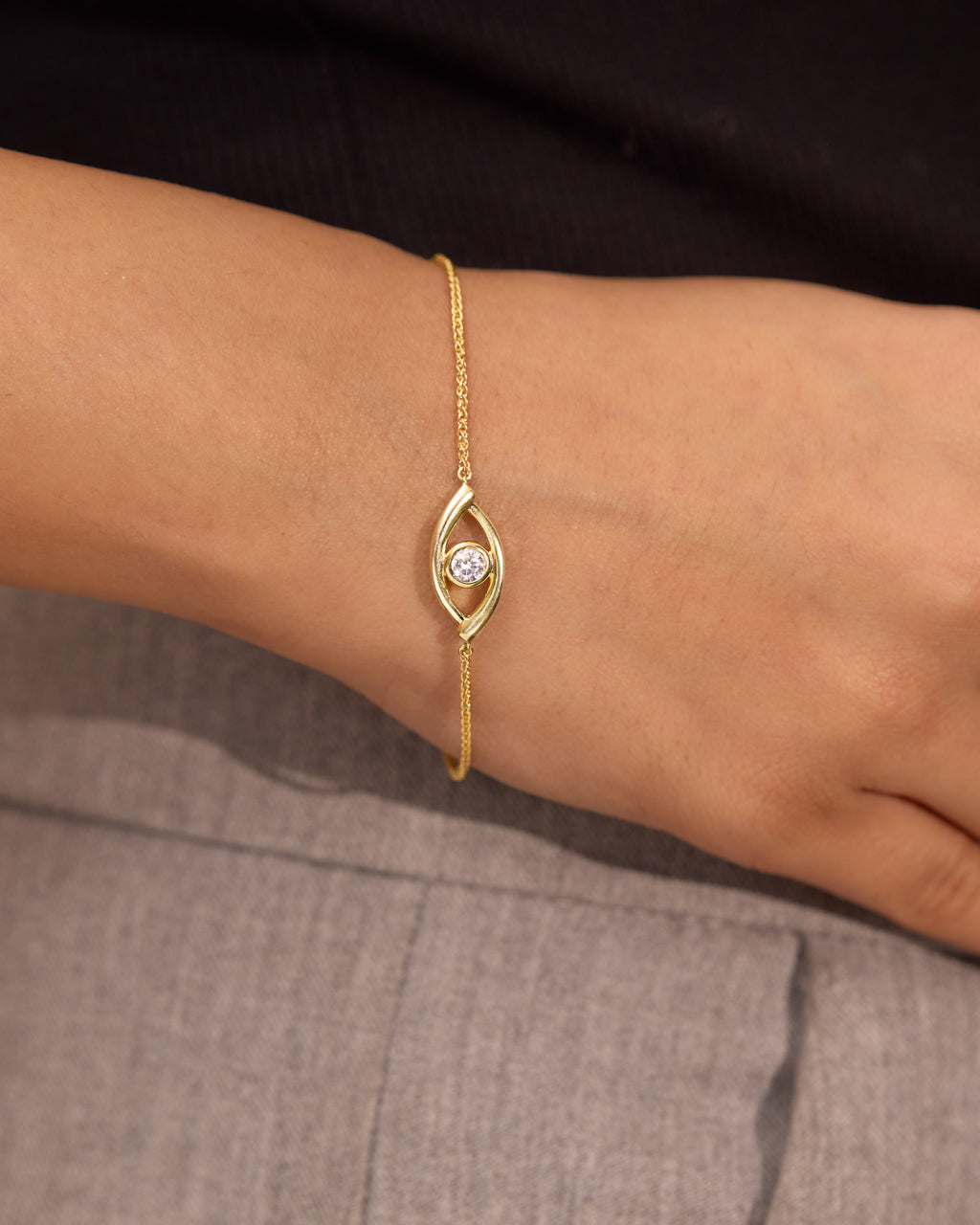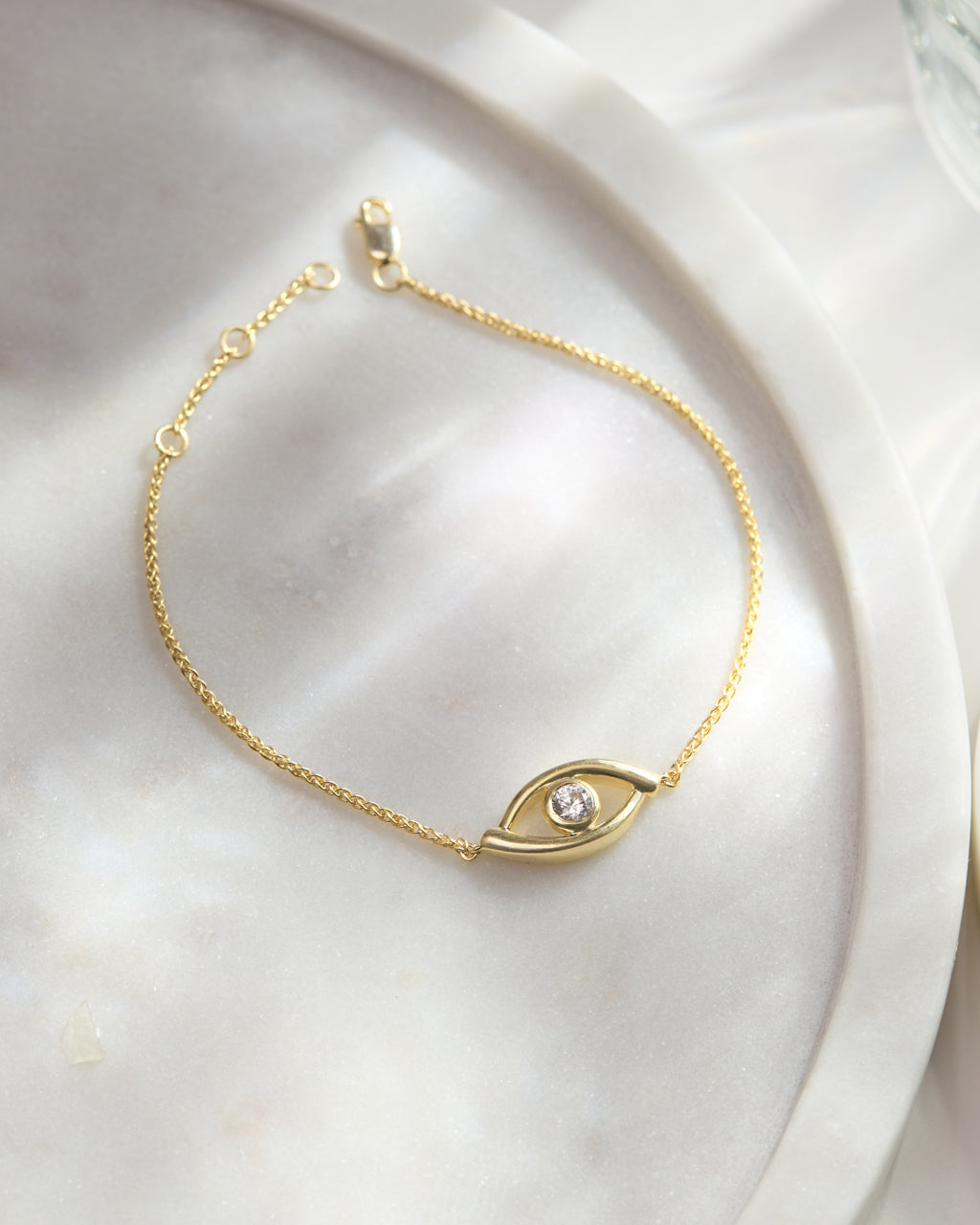 This bracelet features a diamond-set Evil Eye at its center, symbolizing protection and strength. Crafted in 14kt gold vermeil, it’s designed with a delicate chain that feels as effortless as it looks. A style piece you’ll never want to take off, perfect for stacking or wearing solo.