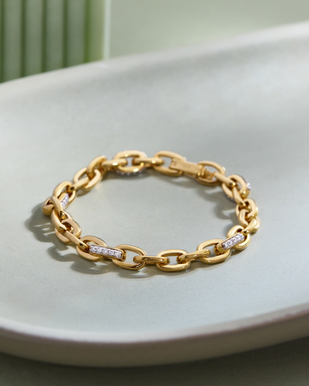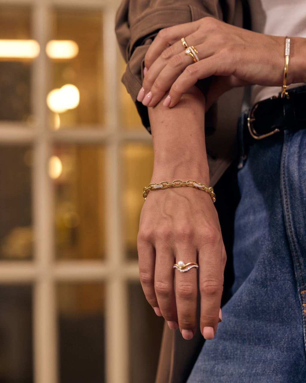 The Statement Diamond Link Bracelet pairs oversized gold links with diamond accents for a modern yet timeless silhouette. Its perfect for those who like their jewelry to feel as powerful as it looks. Crafted in 14kt gold vermeil, it’s a bracelet that elevates every occasion.