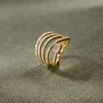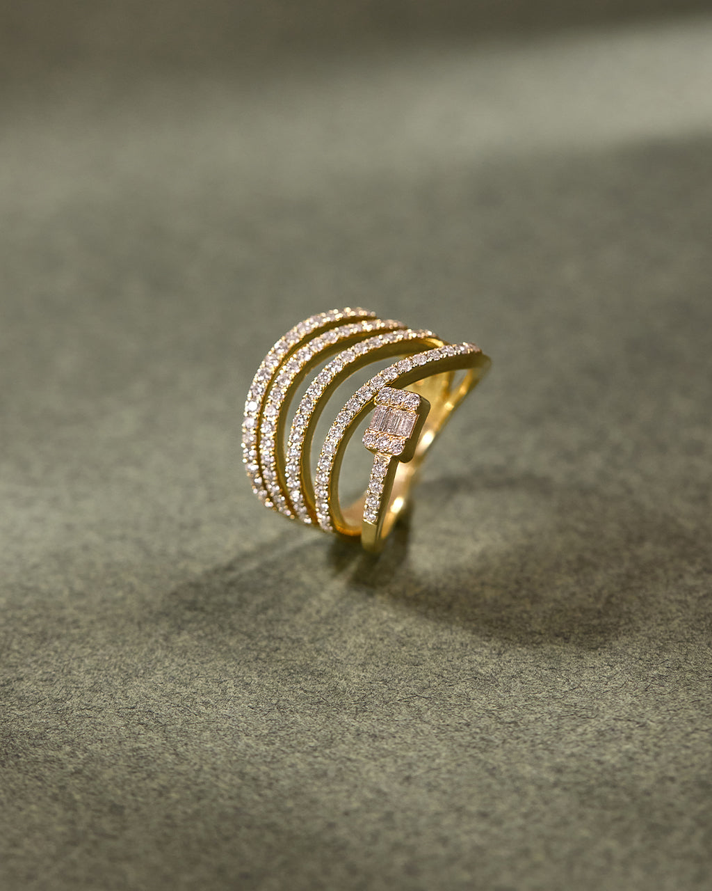 The Wrap-Around Diamond Ring curves gracefully around the finger, with rows of pavé-set diamonds flowing into a baguette-cut centerpiece. Crafted in 14kt gold vermeil, it’s a statement of movement, glamour, and unapologetic presence.
