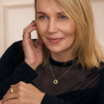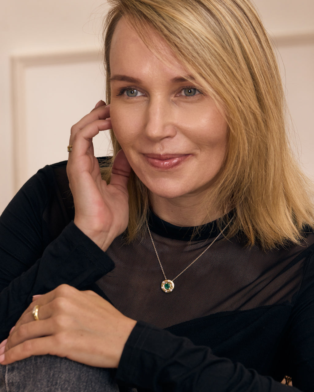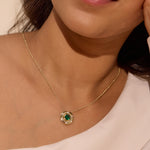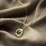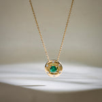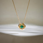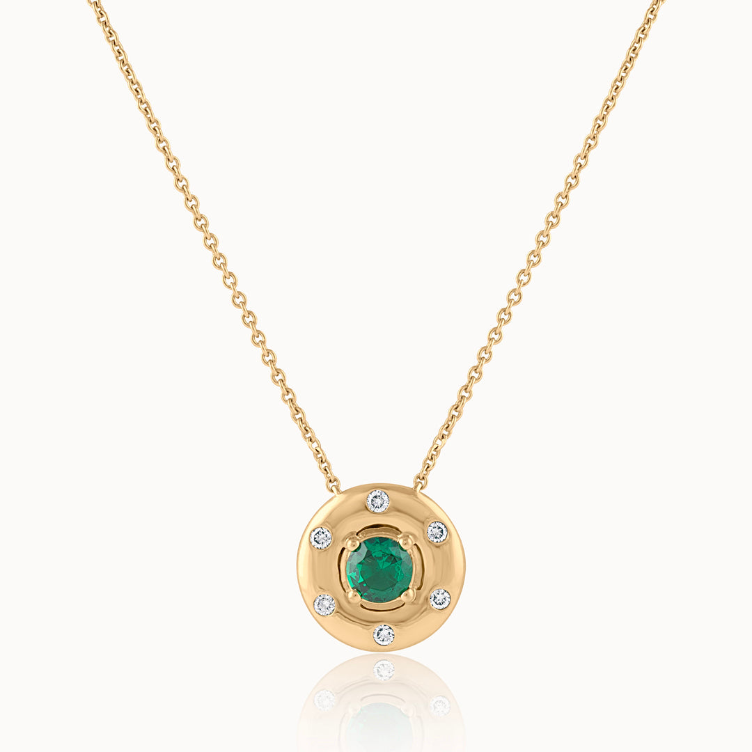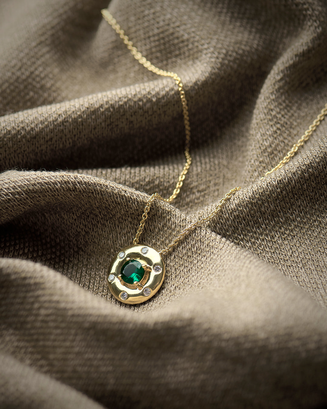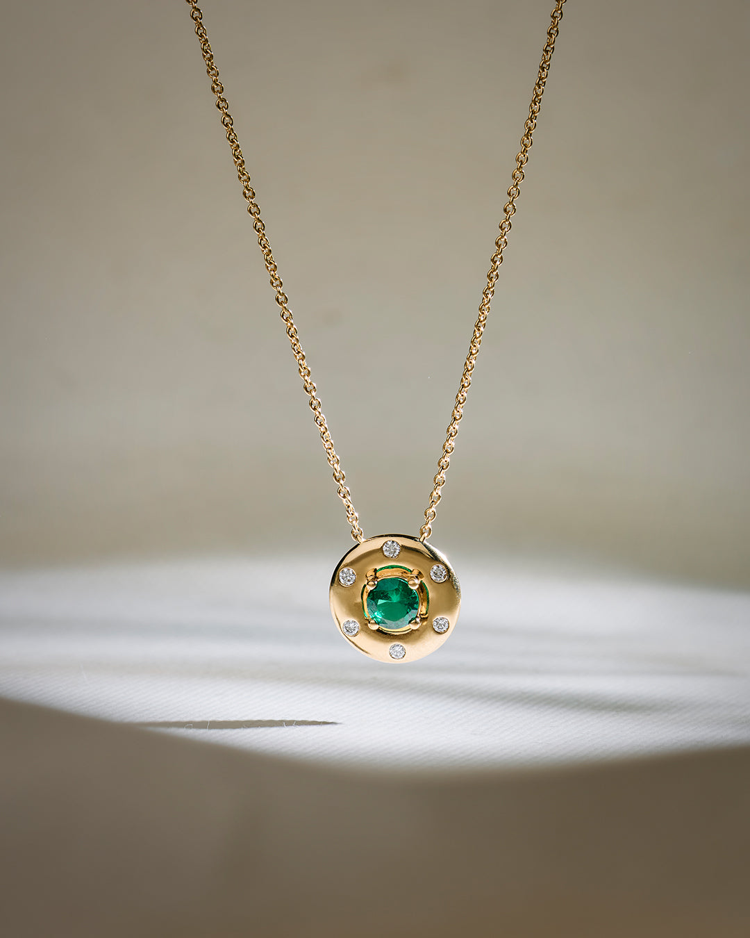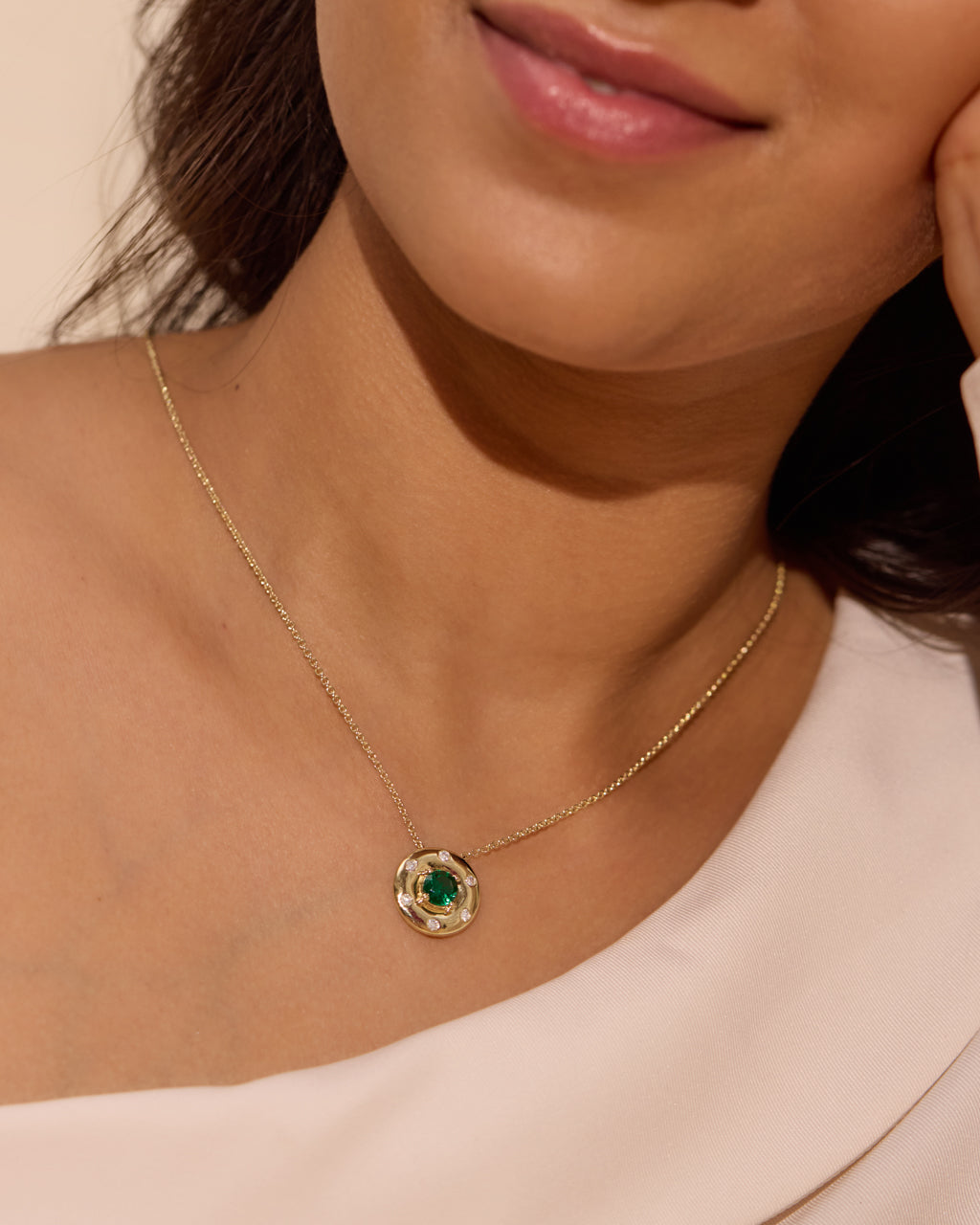 The created emerald sits at the center of a golden disc, surrounded by diamond accents that trace light across every curve. Crafted in 14kt gold vermeil, it rests close to the skin, bold in color yet subtle in form. A necklace that brings balance to your shine, modern, natural, and unmistakably yours.