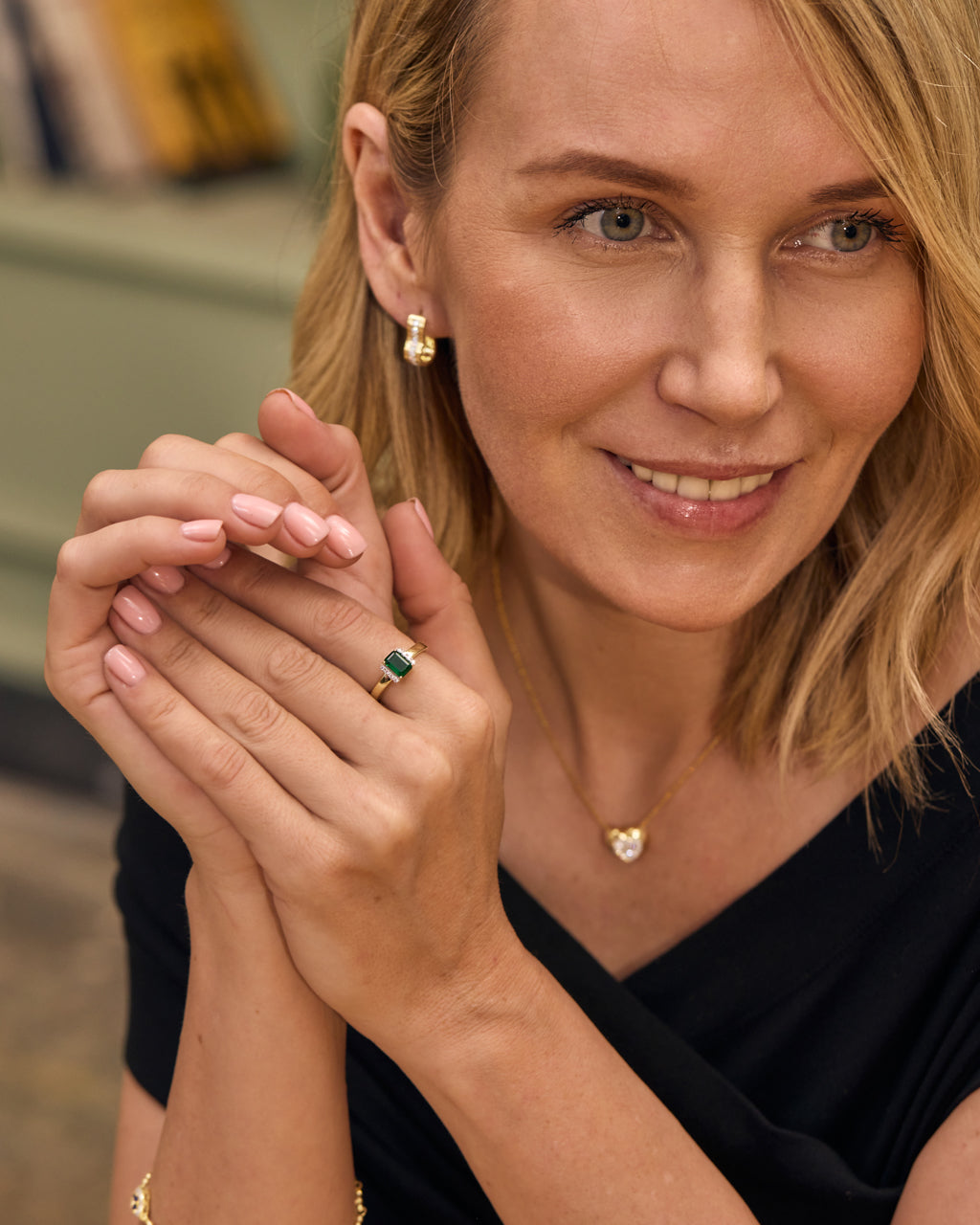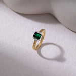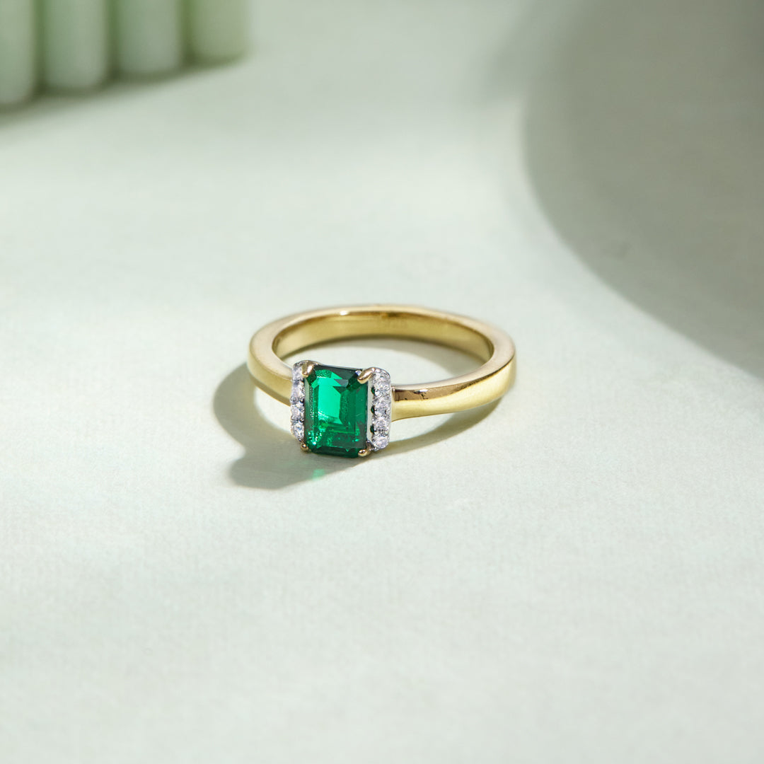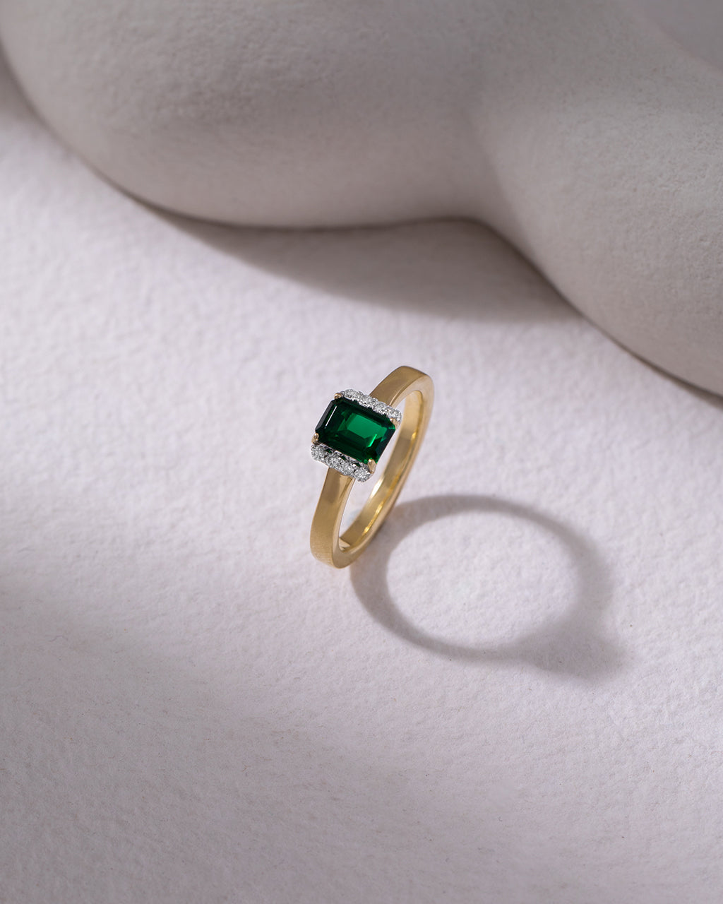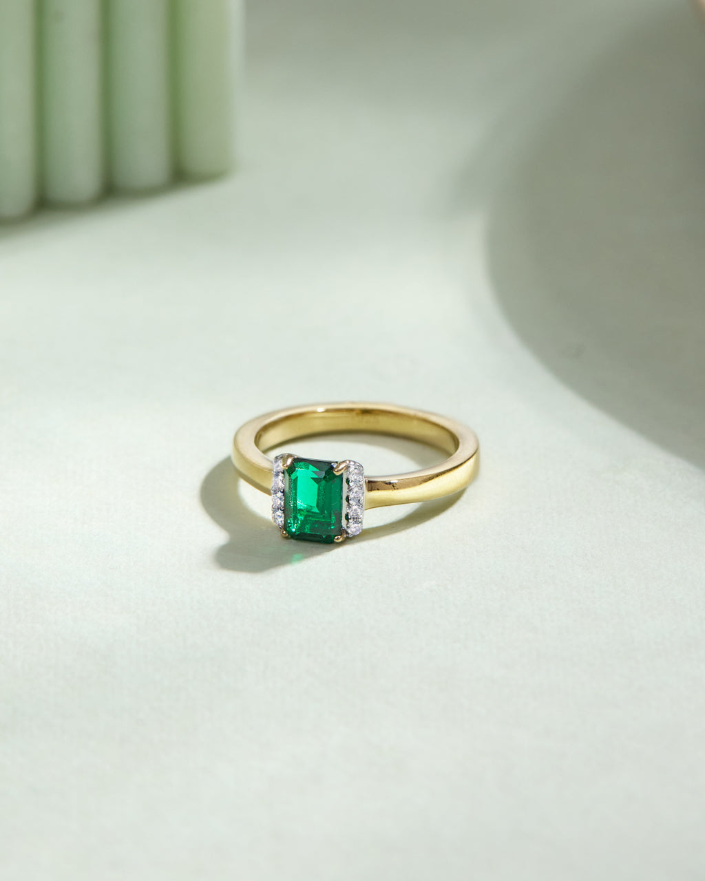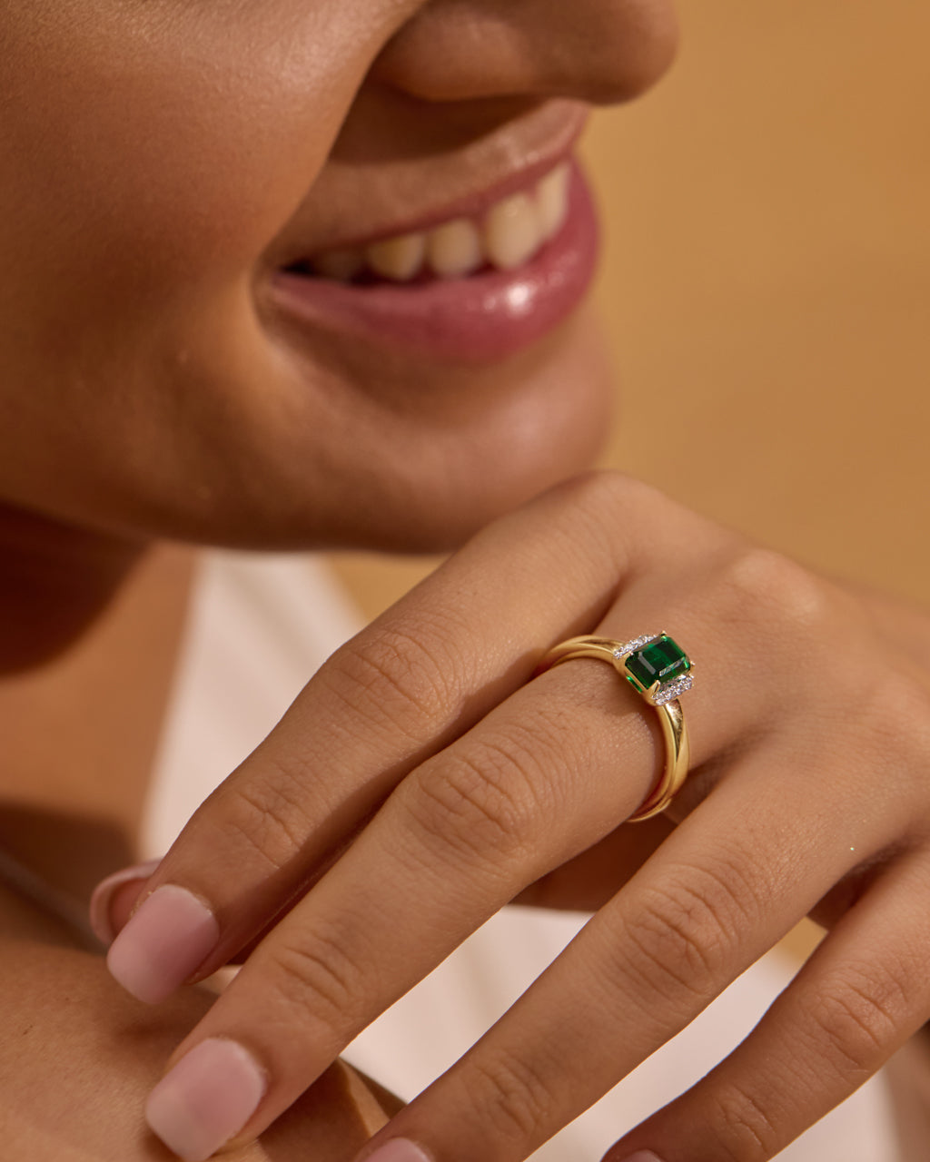 The created emerald is cut with precision, while the diamond accents bring an extra layer of radiance. Finished in 14kt gold vermeil, this band is built for stacking, styling, or standing alone.