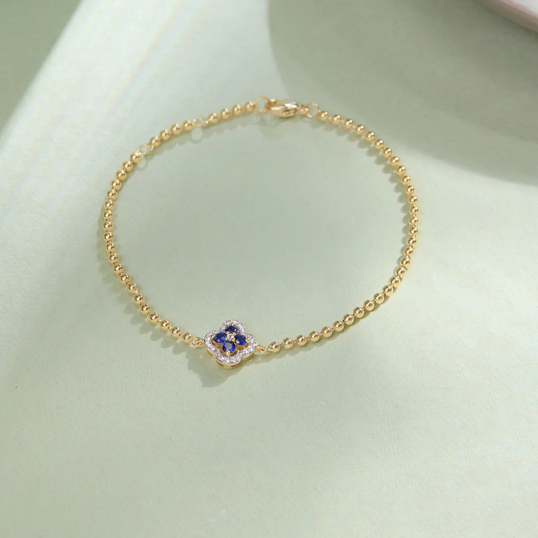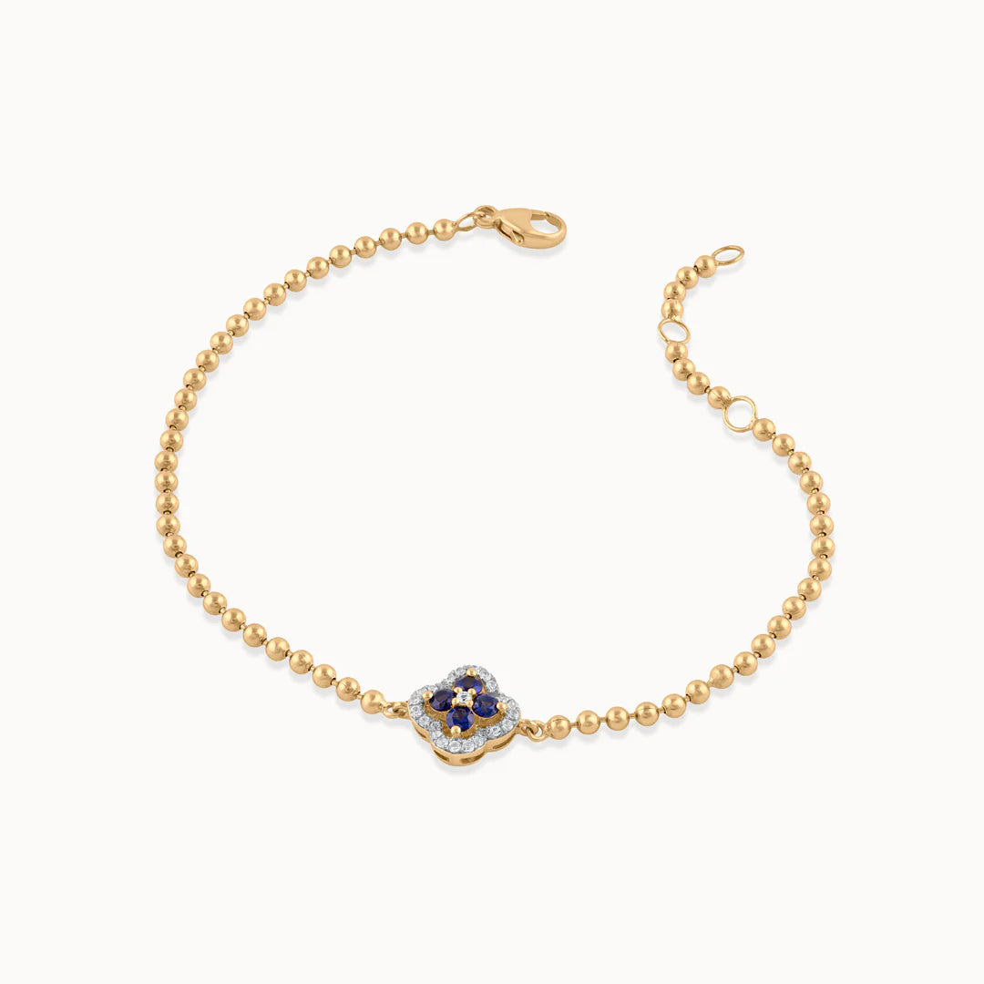 A delicate chain bracelet crafted in 14kt gold vermeil, centered with a clover motif adorned in deep blue sapphires and framed by shimmering diamonds. Its refined symmetry and rich contrast of sapphire and gold make it an elegant piece that feels both classic and fresh. Designed to be worn solo for subtle sophistication or layered effortlessly with your everyday favorites.