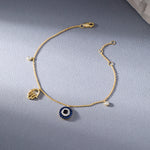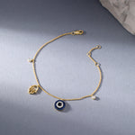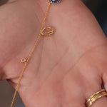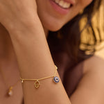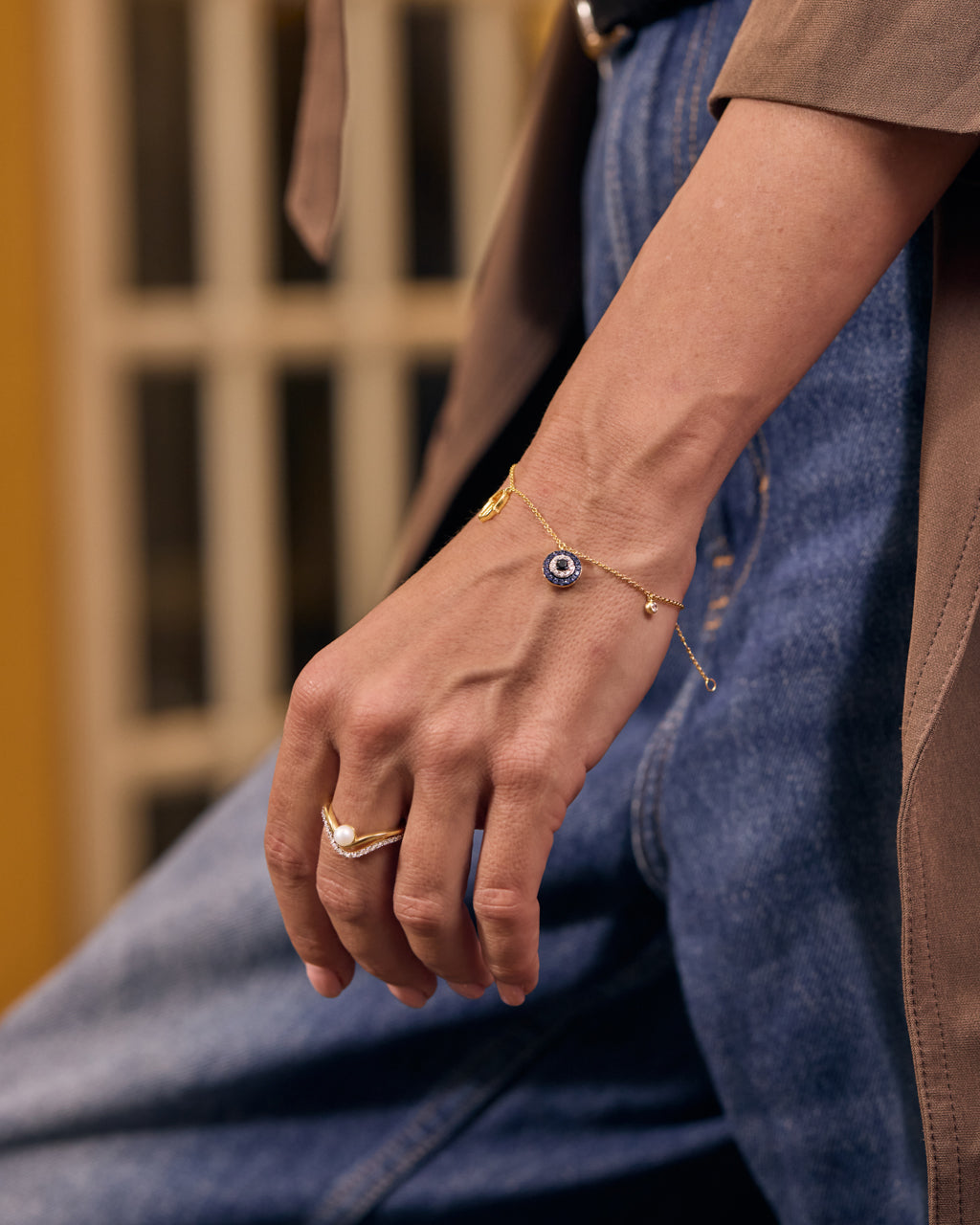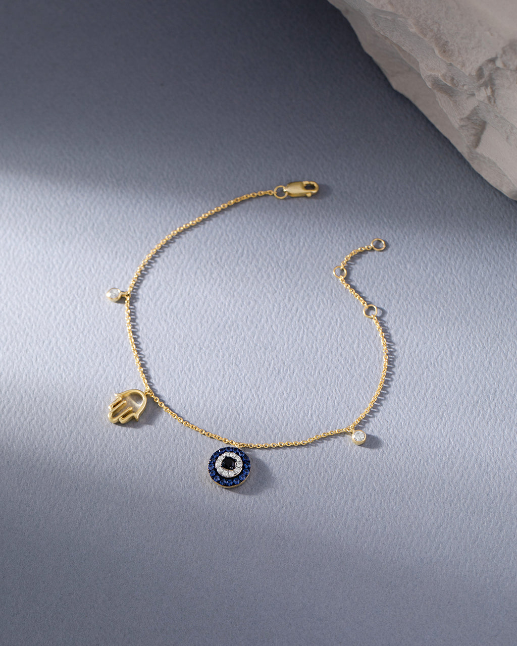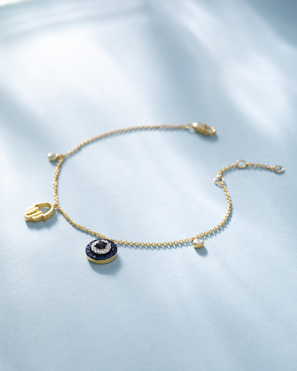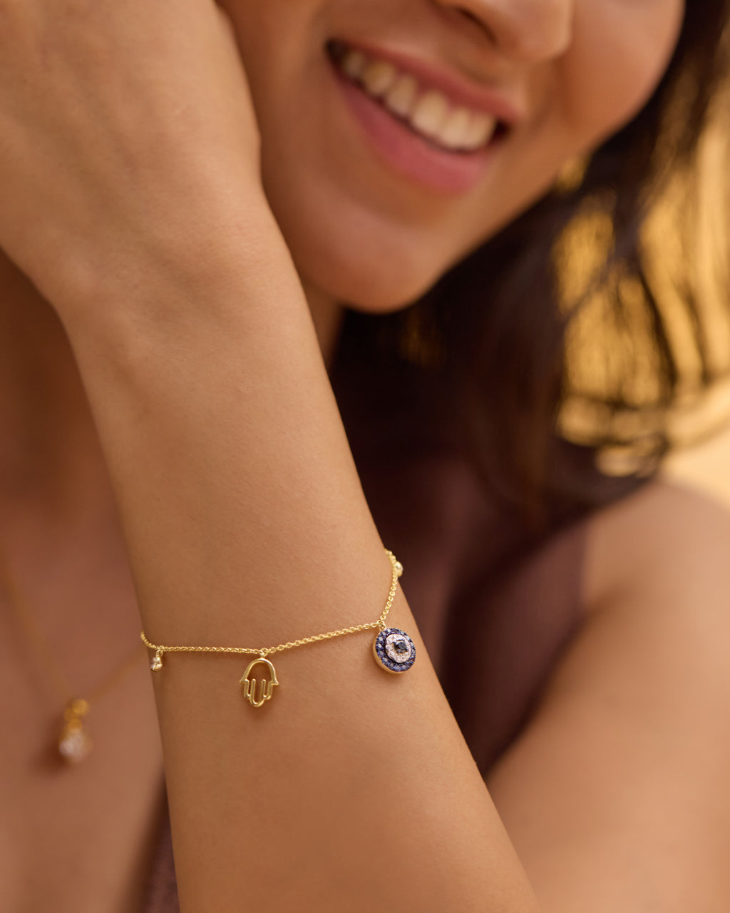 A bracelet designed to hold meaning as much as beauty. The Talisman Charm Bracelet features delicate motifs like the protective Hamsa hand, a sapphire evil eye, and diamond accents, all set in 14kt gold vermeil. It’s a subtle yet symbolic piece you’ll never want to take off.