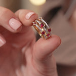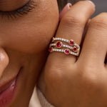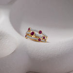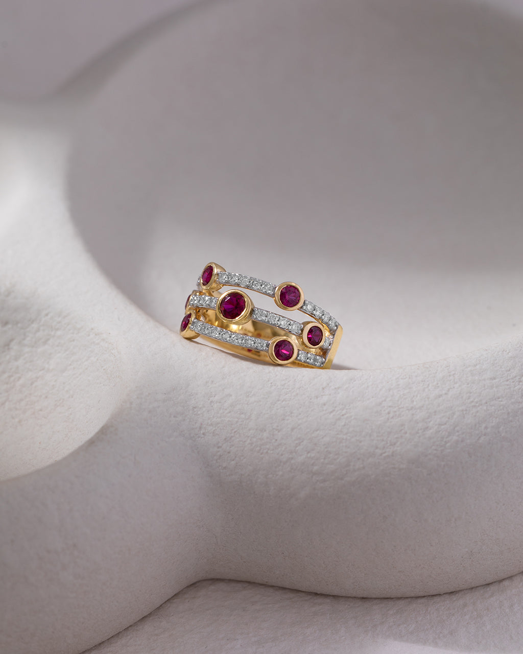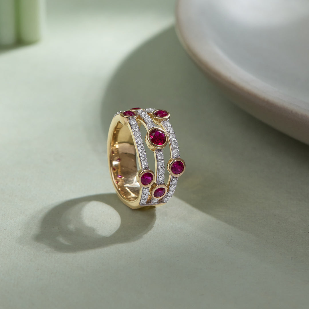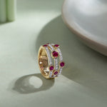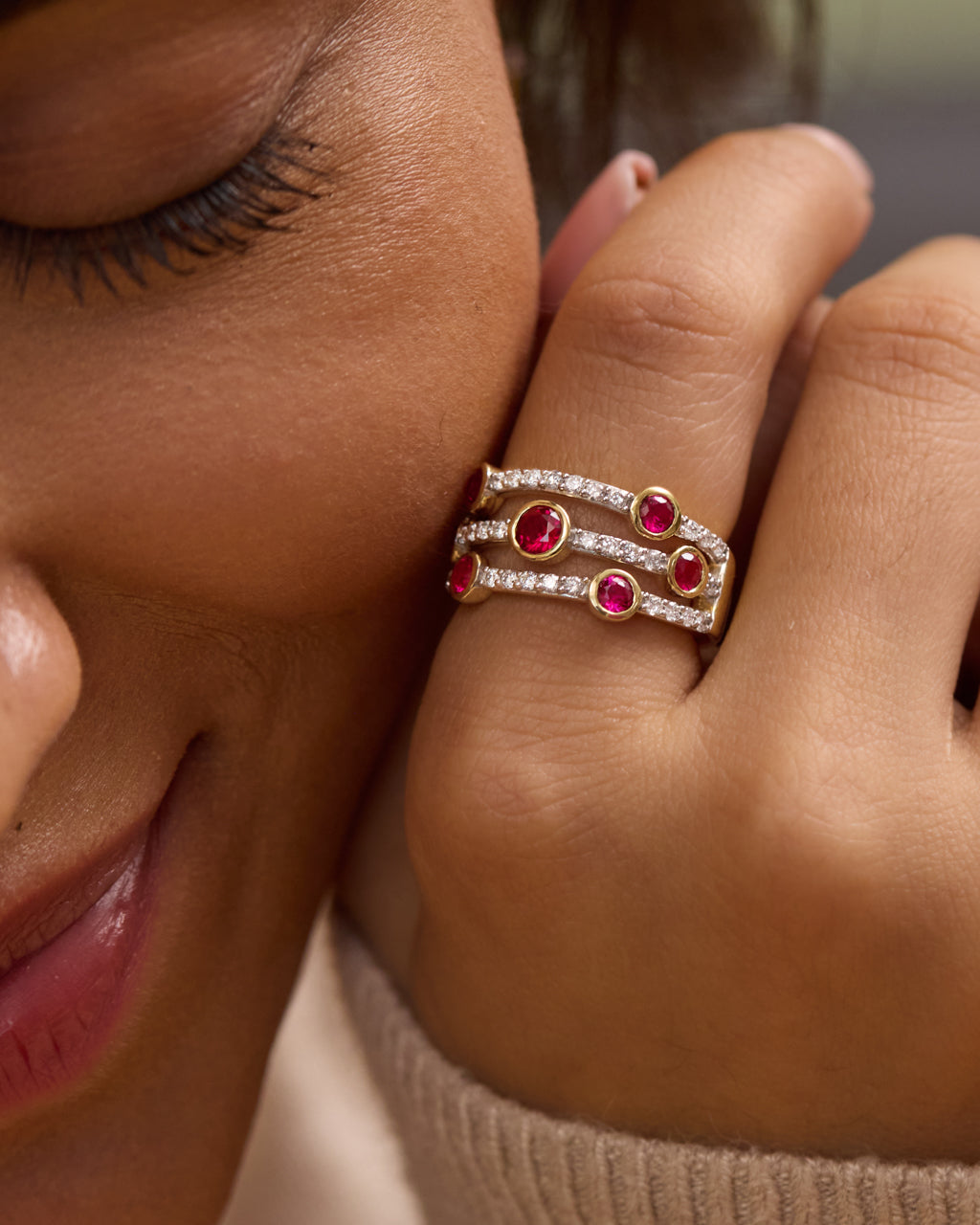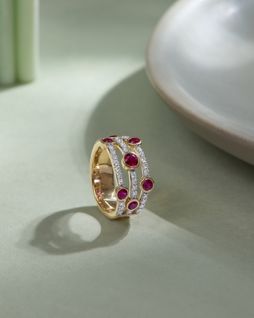 Sleek yet striking, the Three Row Gem Band is the ring that makes an impression every time. Alternating rows of diamonds and bezel-set red gemstones create a modern take on timeless luxury, designed to be worn solo or stacked with confidence.