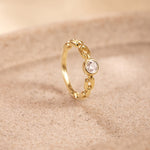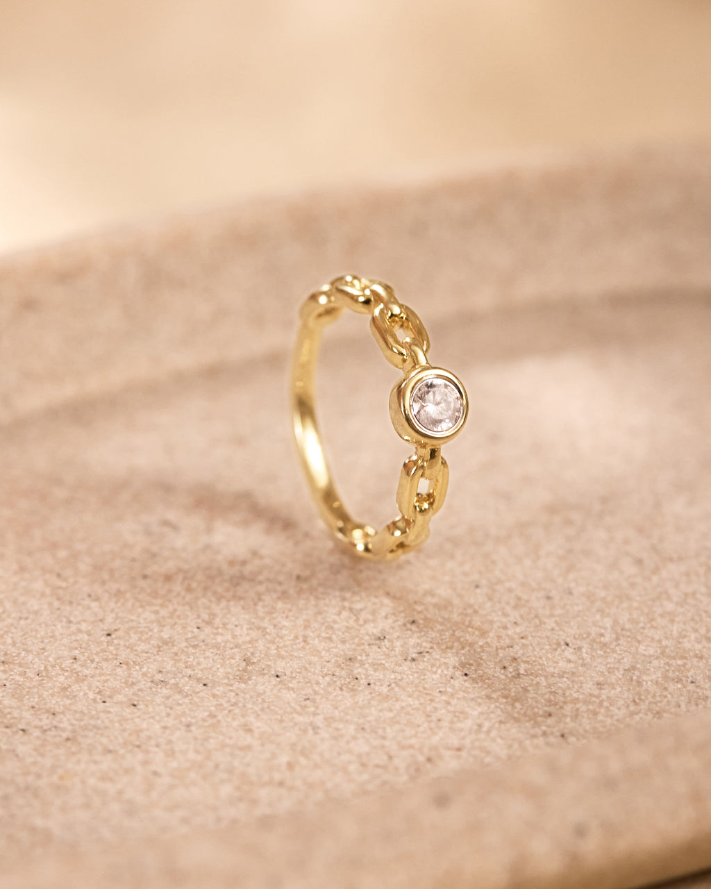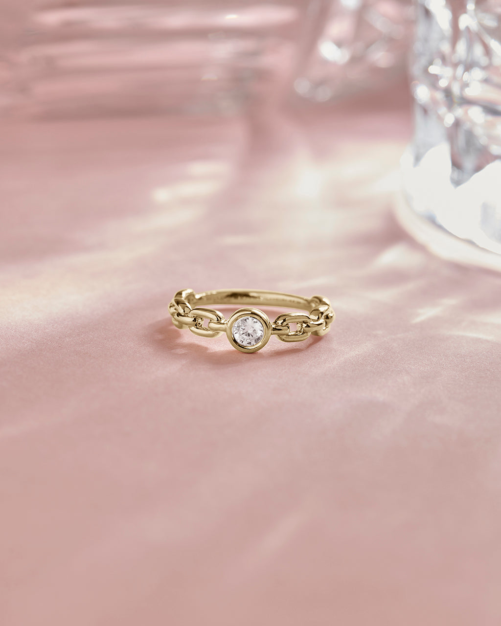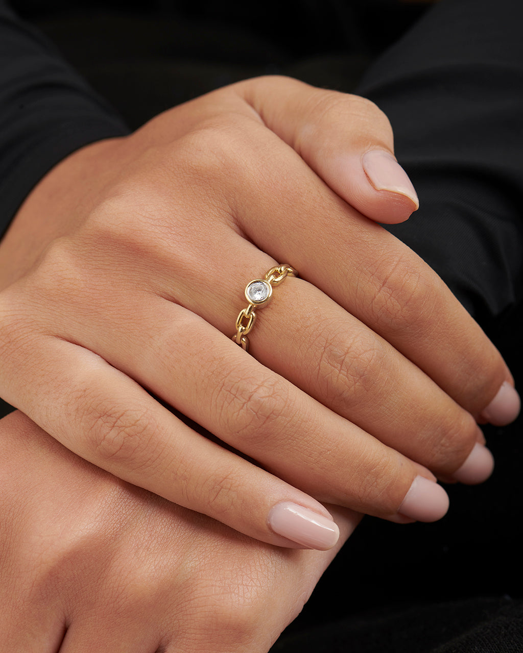 A brilliant round diamond sits in a sleek bezel setting, framed by an open-link gold vermeil band for a fresh take on the classic solitaire.