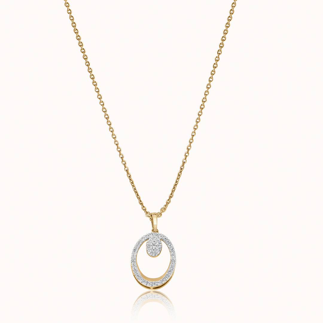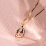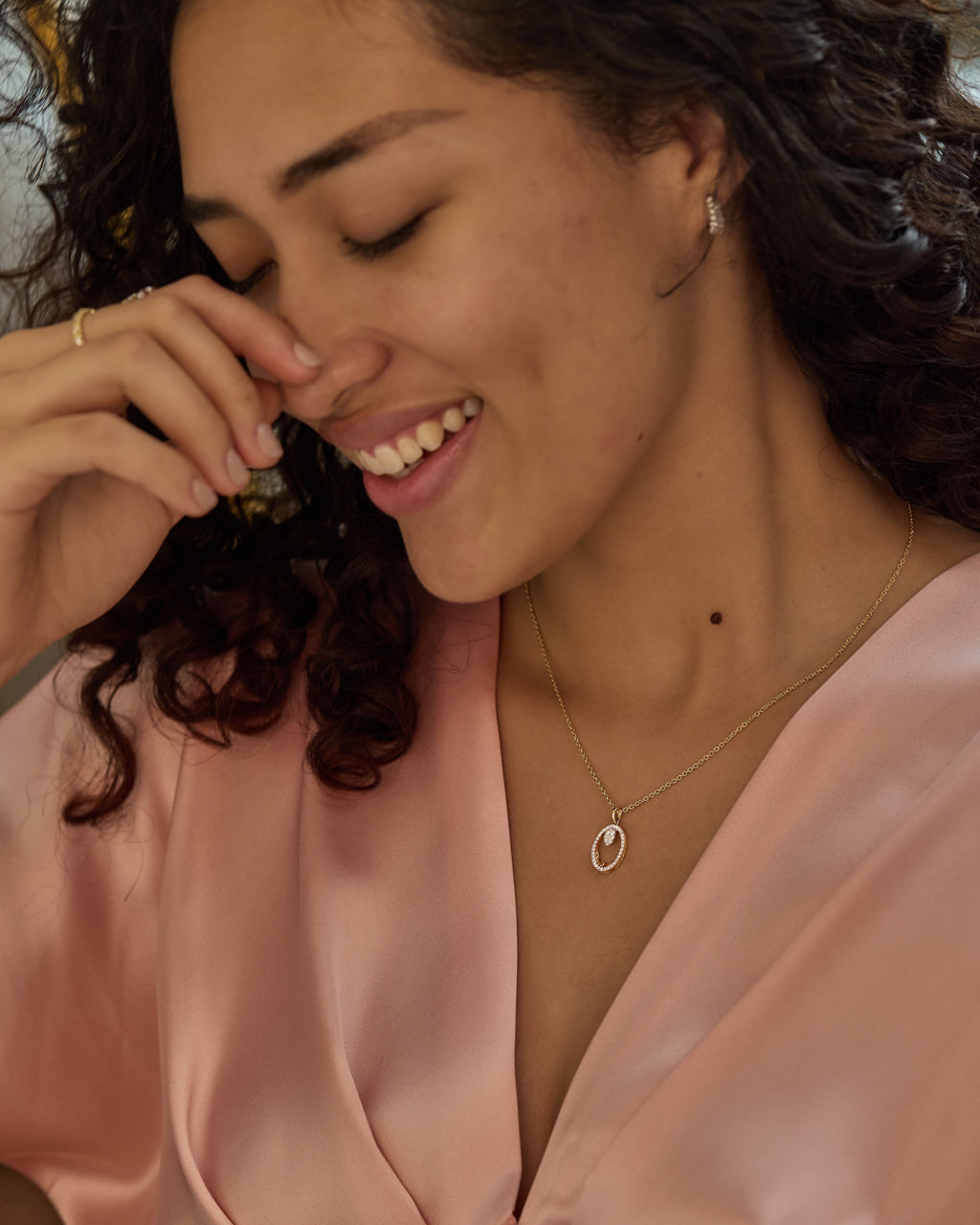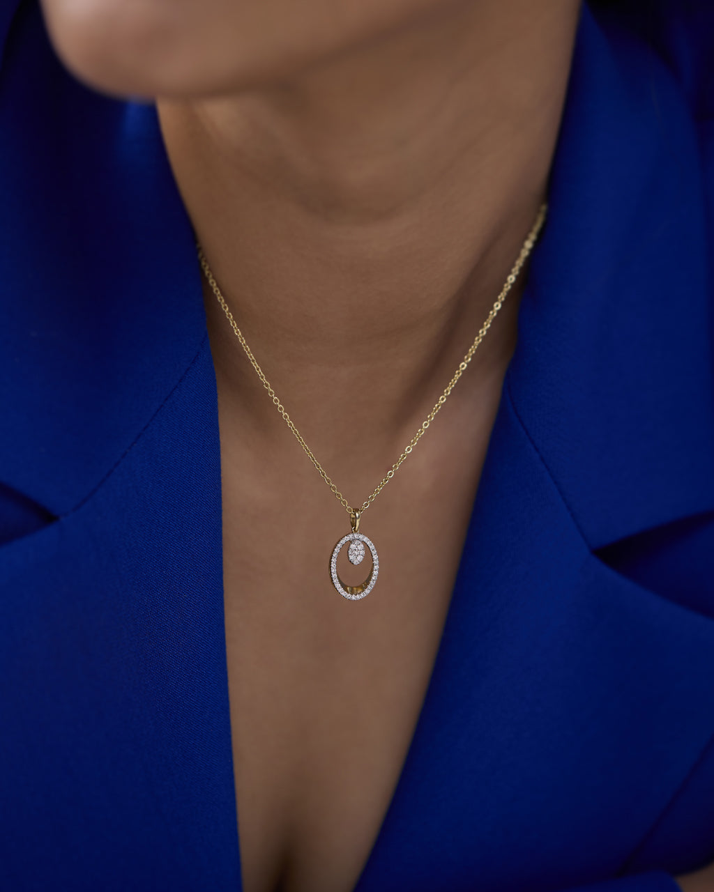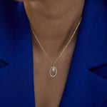 Timeless elegance with a brilliant touch—the Oval Diamond Halo Necklace in polished 14kt Gold Vermeil features a luminous oval centerpiece framed by a halo of sparkling diamonds, crafted to light up every occasion.