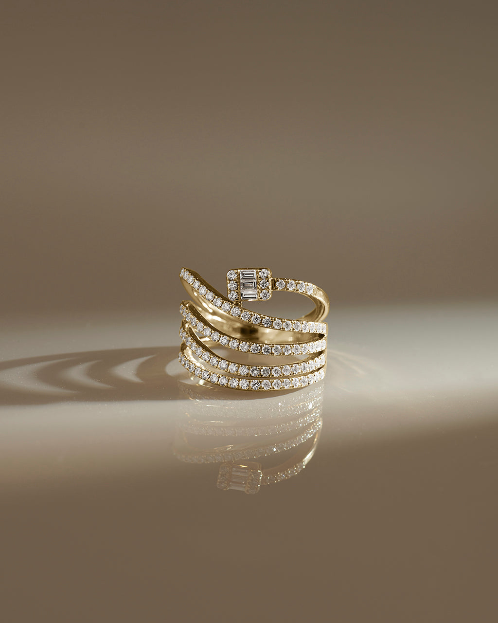 The Wrap-Around Diamond Ring curves gracefully around the finger, with rows of pavé-set diamonds flowing into a baguette-cut centerpiece. Crafted in 14kt gold vermeil, it’s a statement of movement, glamour, and unapologetic presence.