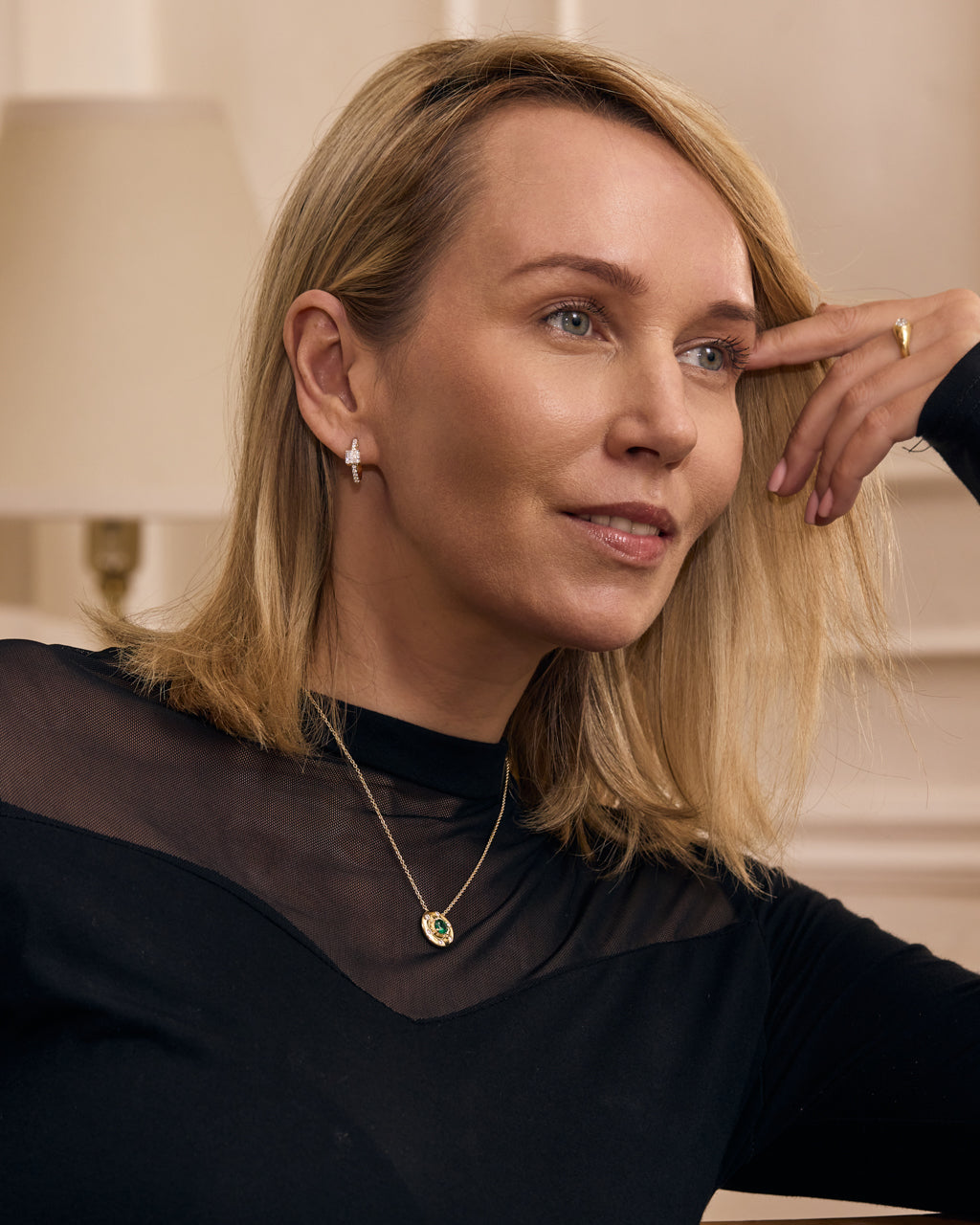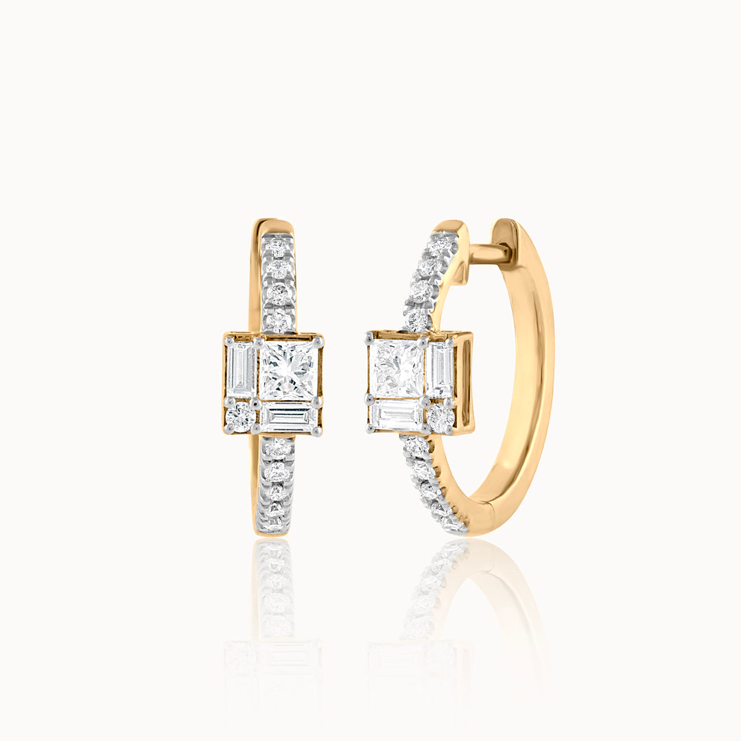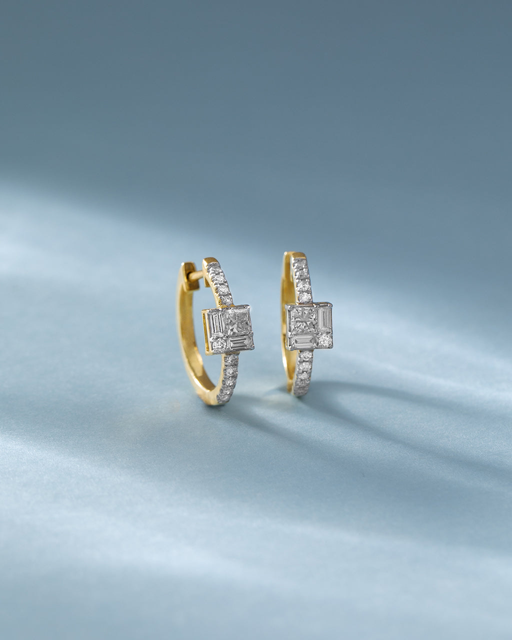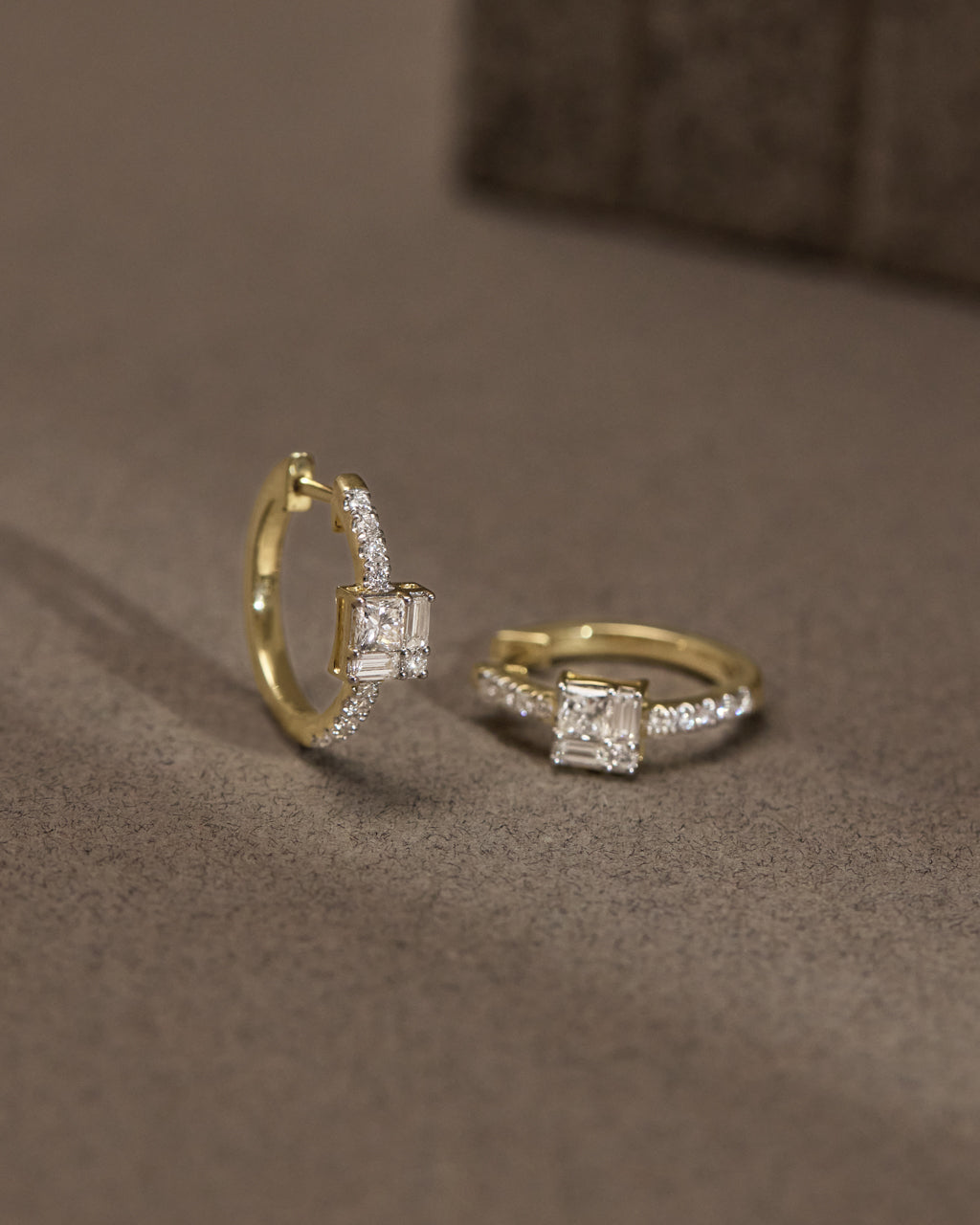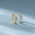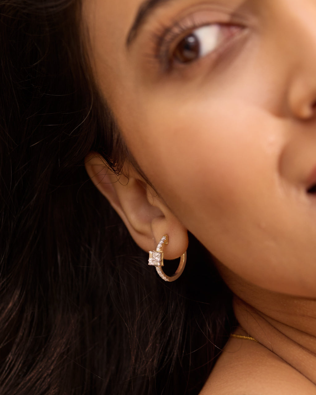 Tiny dewdrops, caught mid-motion. These hoops balance precision with play, a cluster of diamonds tracing the curve, anchored by a bold square cut that feels both timeless and new. Crafted in 14kt gold vermeil, they sit close, shine effortlessly, and move like they were made to follow your rhythm.