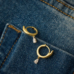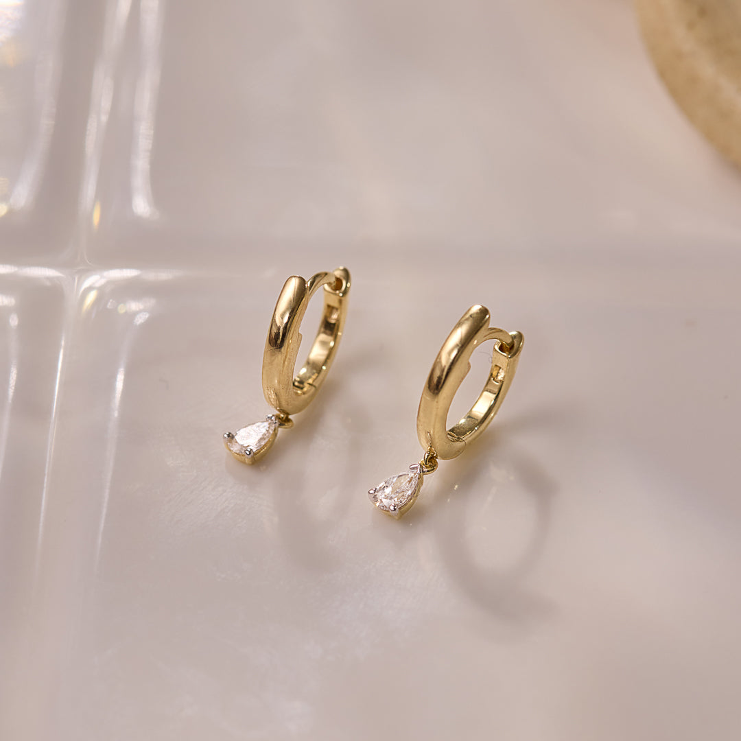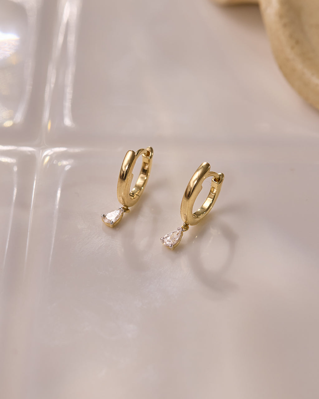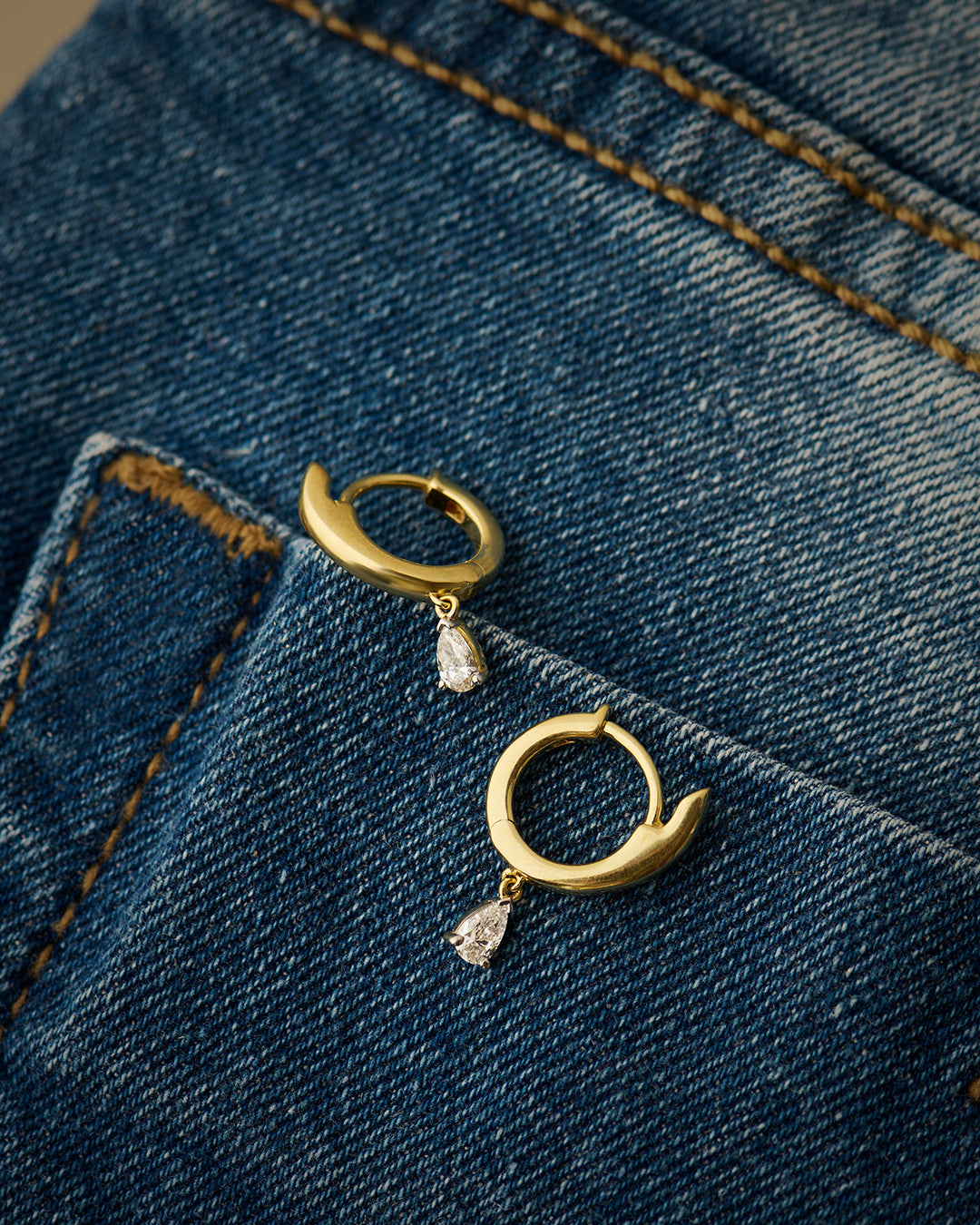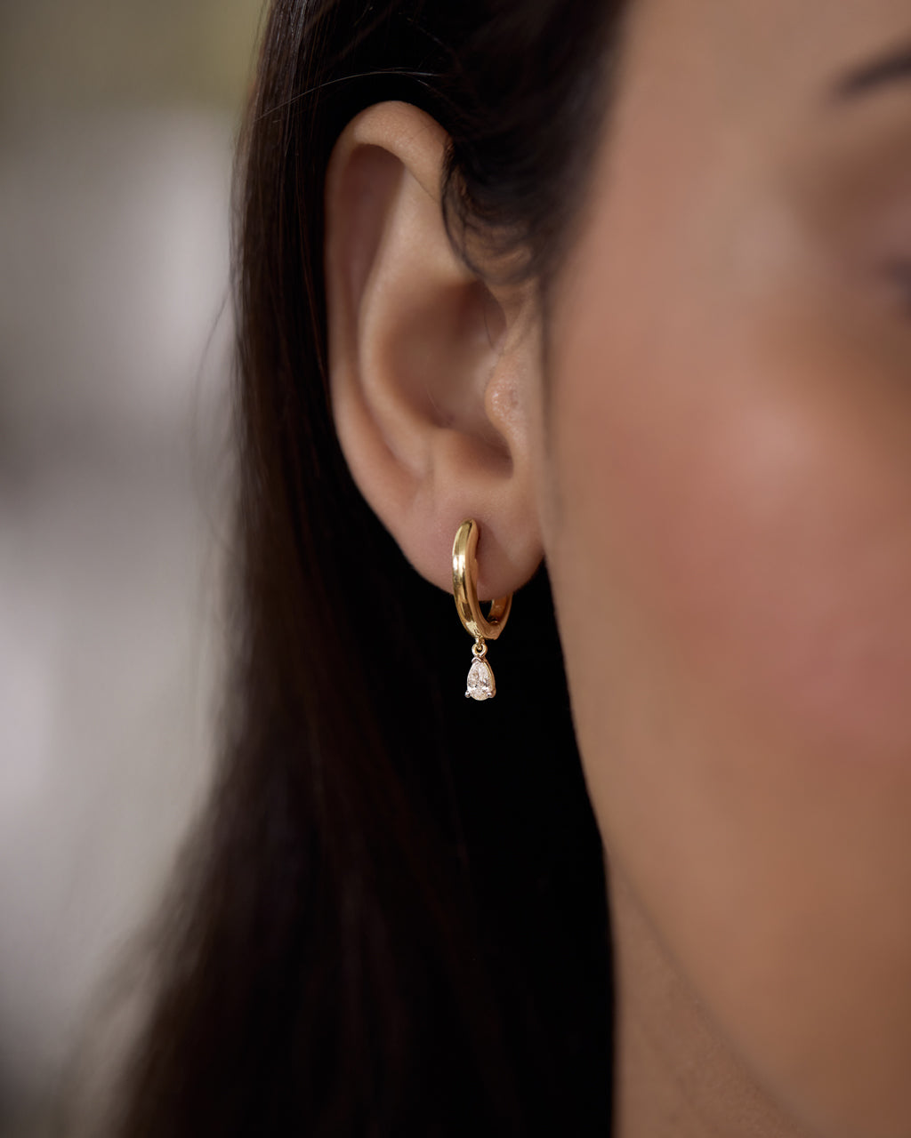 The pear-shaped diamond hangs from a clean gold vermeil hoop, creating a drop that feels fluid, feminine, and impossibly composed. Minimal, luminous, made to be noticed softly.