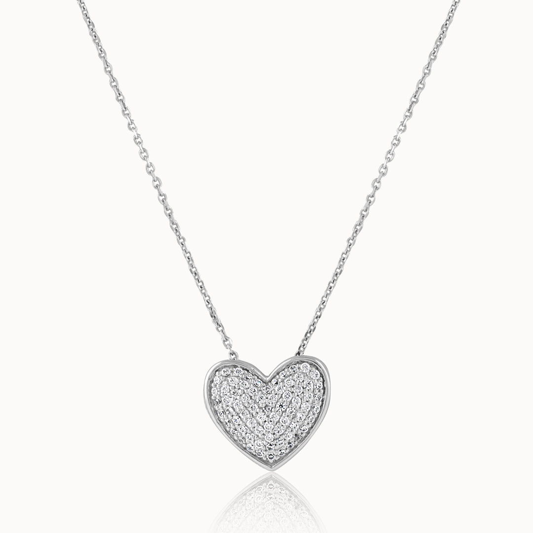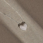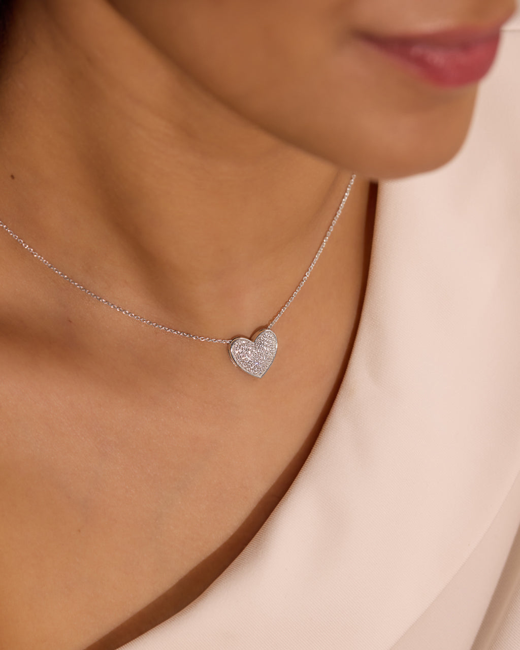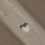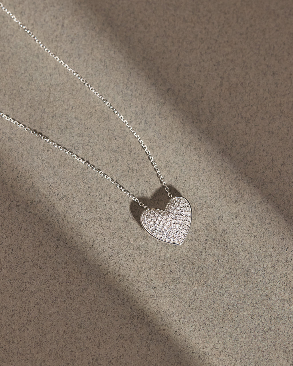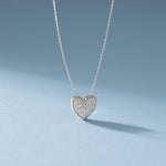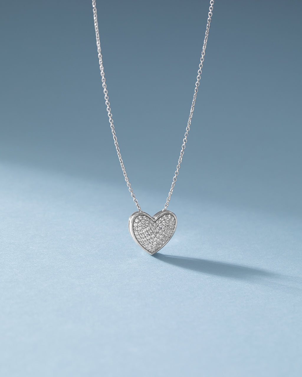 Crafted in sterling silver, this necklace showcases a heart silhouette fully encrusted with shimmering diamonds. The pavé setting creates a seamless sparkle, catching light from every angle for a radiant finish. A timeless piece that balances romance and sophistication, perfect for everyday elegance or as a standout layering accent.