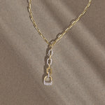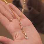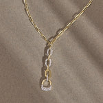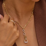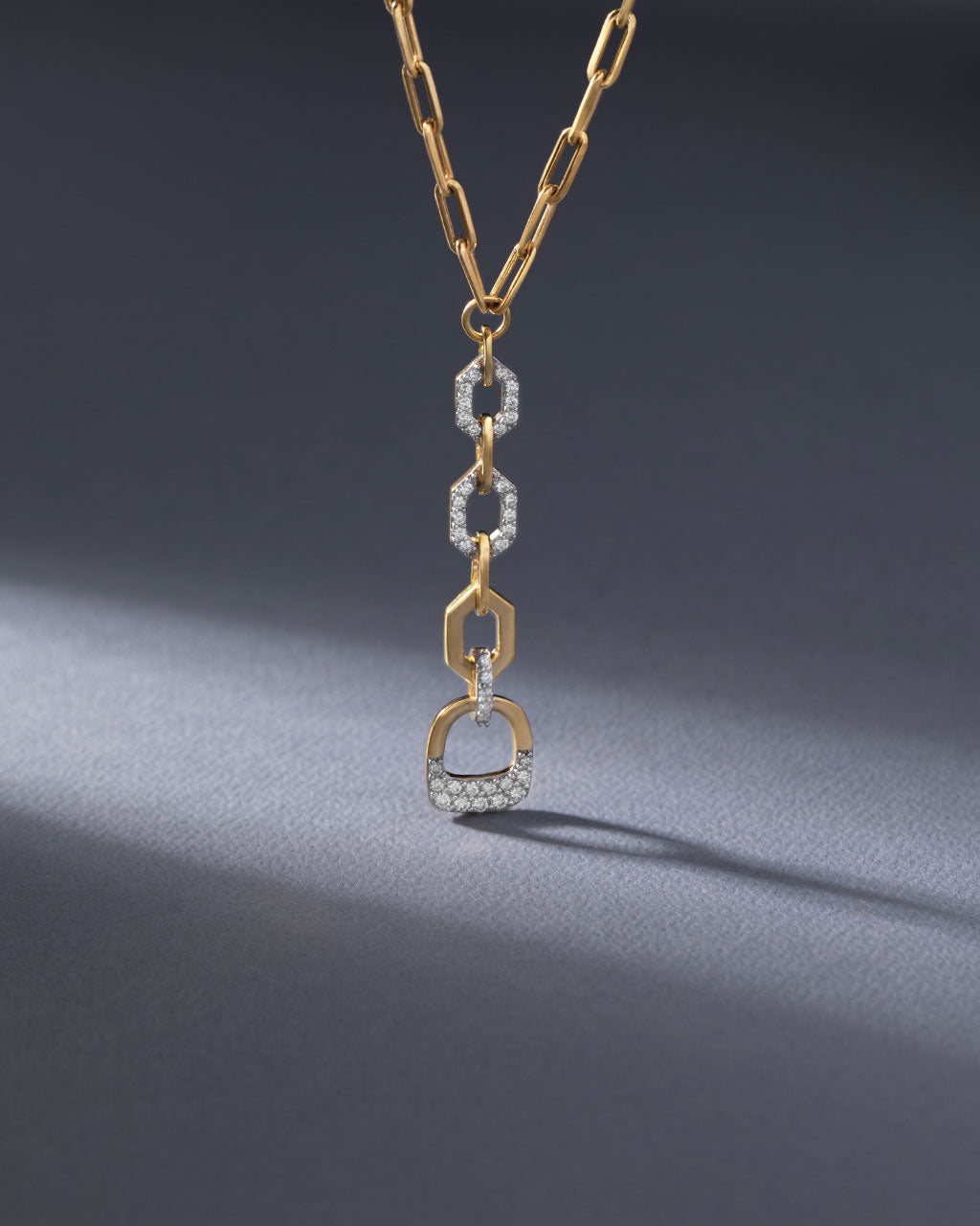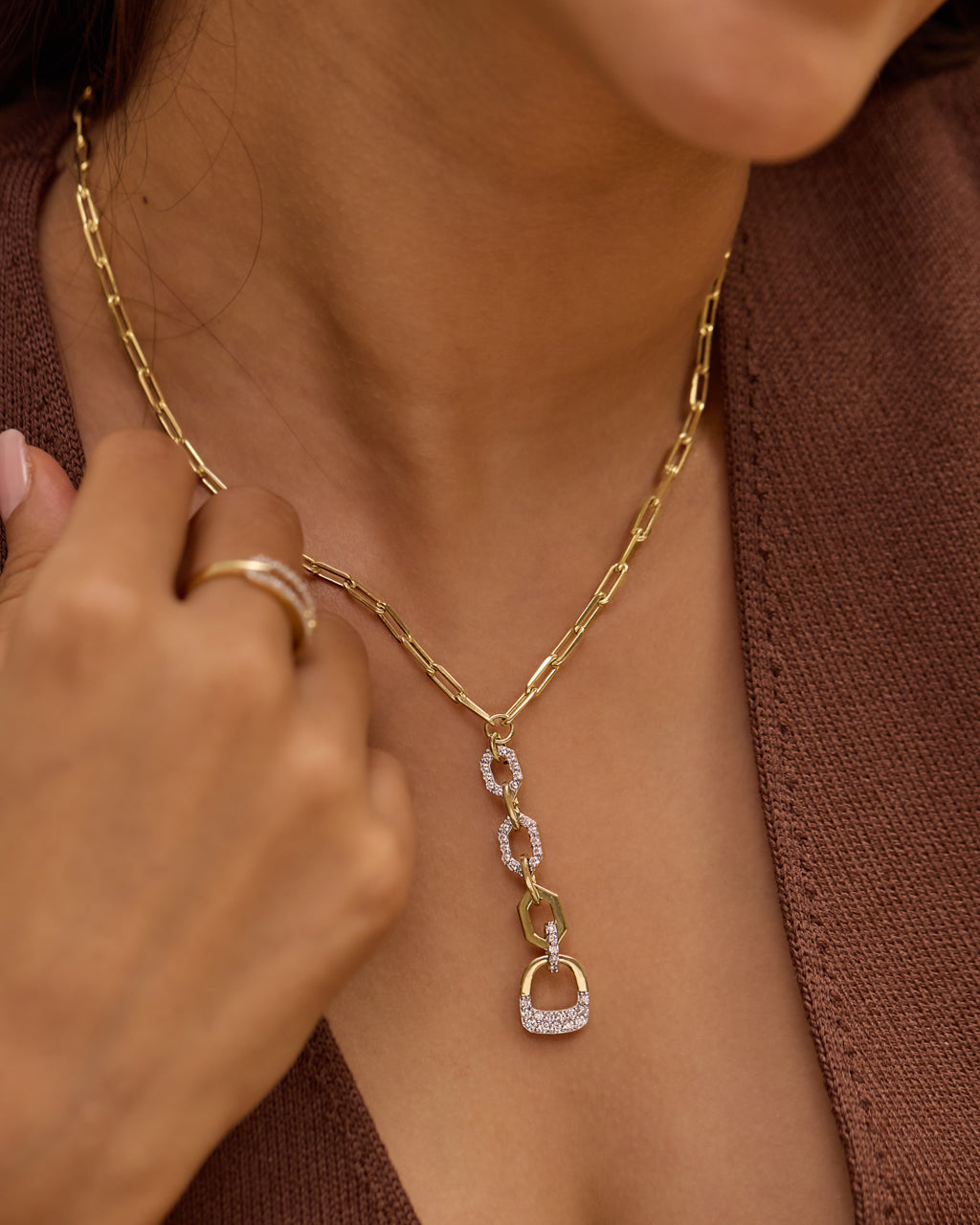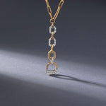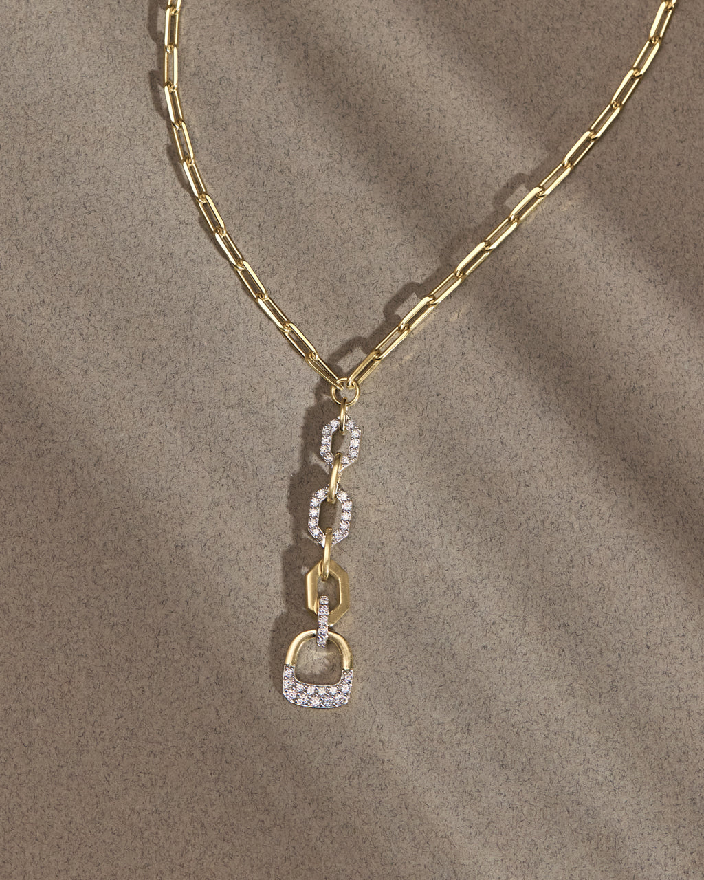 A necklace designed to command attention. Interlocking gold links flow into a diamond-detailed drop, creating a linear silhouette that’s bold, architectural, and unapologetically striking.