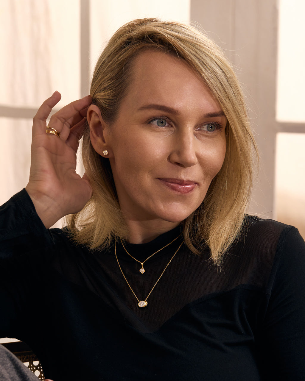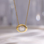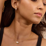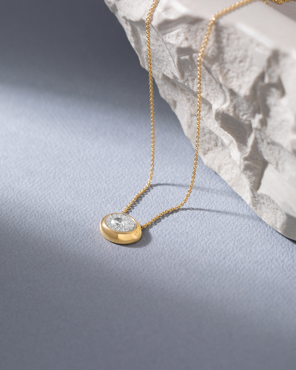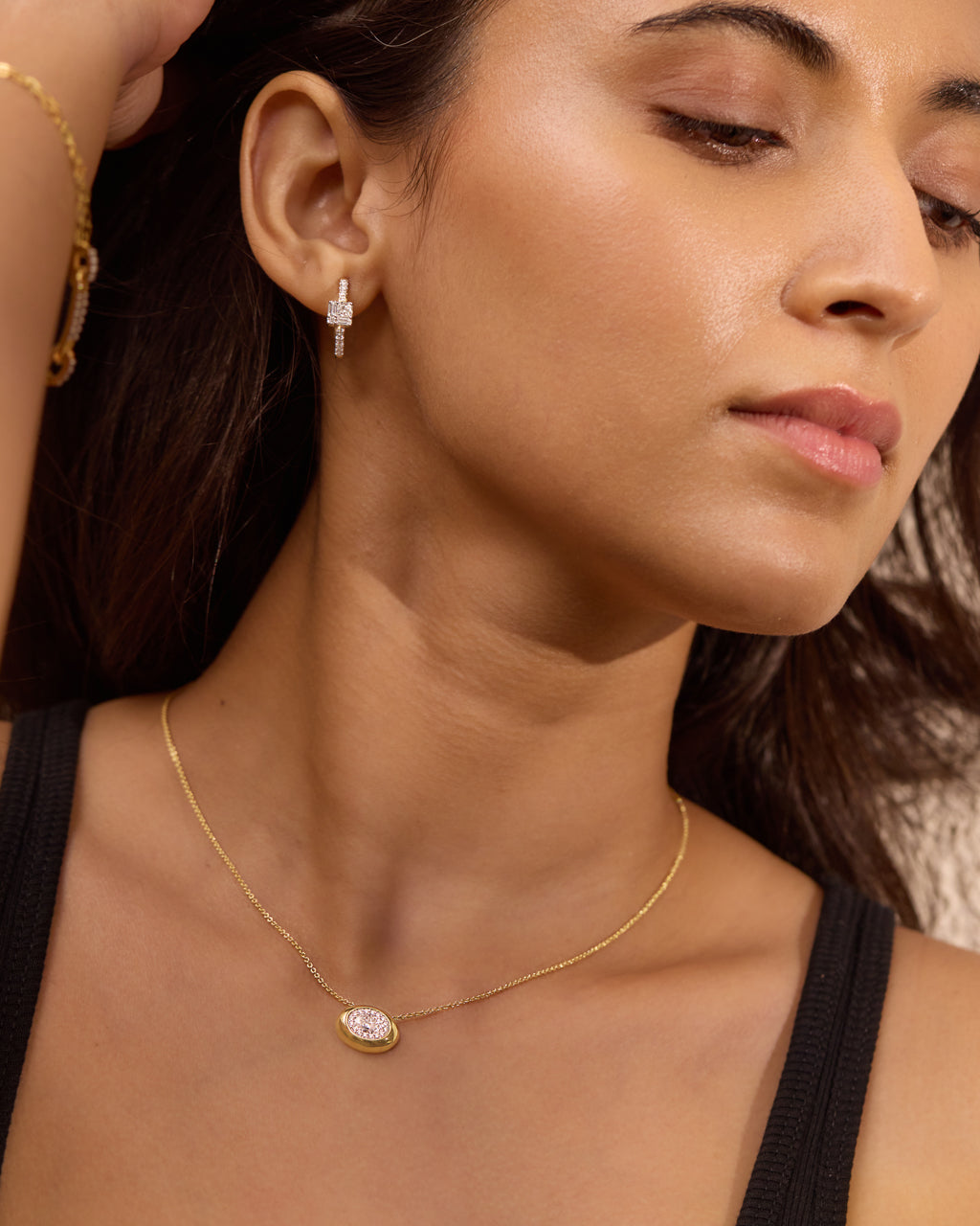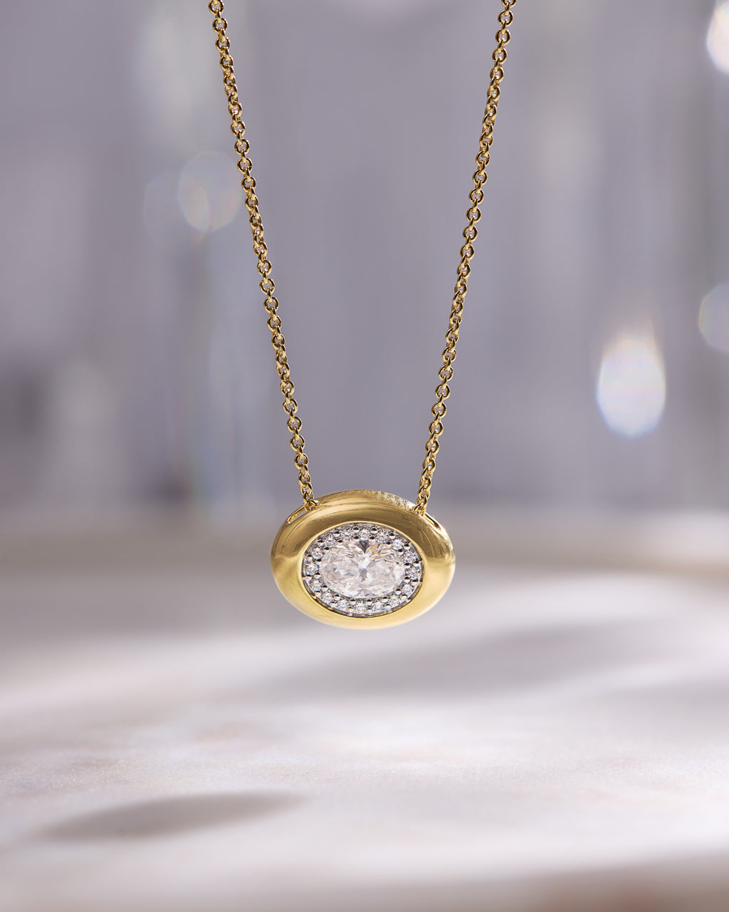 A necklace designed for presence, not noise. The oval diamond cluster draws the eye with calm brilliance, its 14kt gold vermeil frame warm and timeless. Quiet power, captured in a single curve.