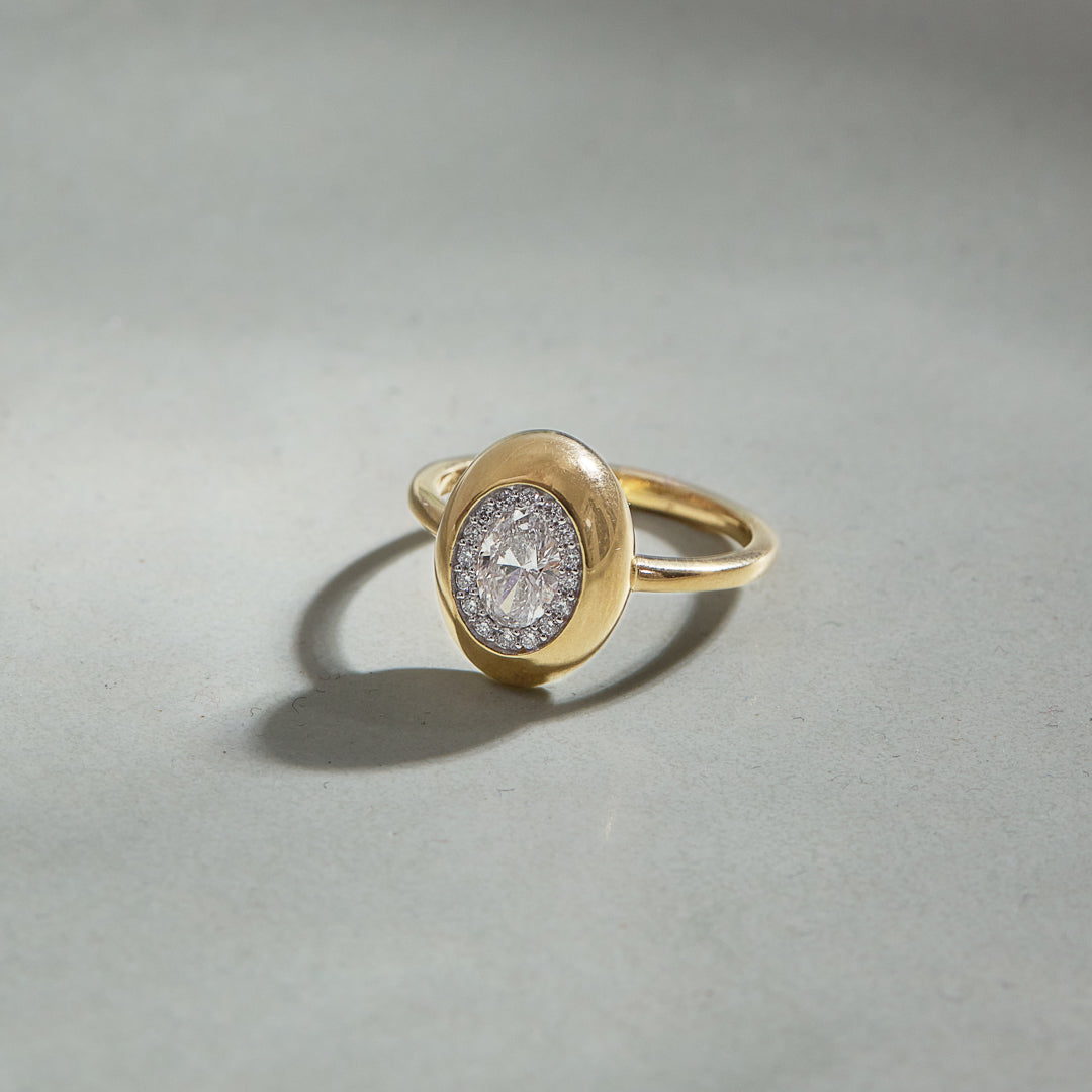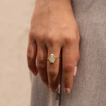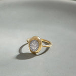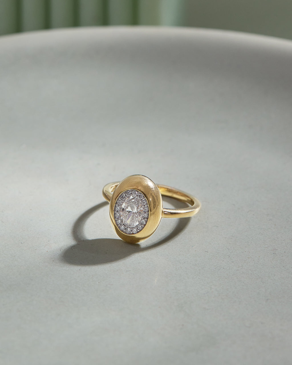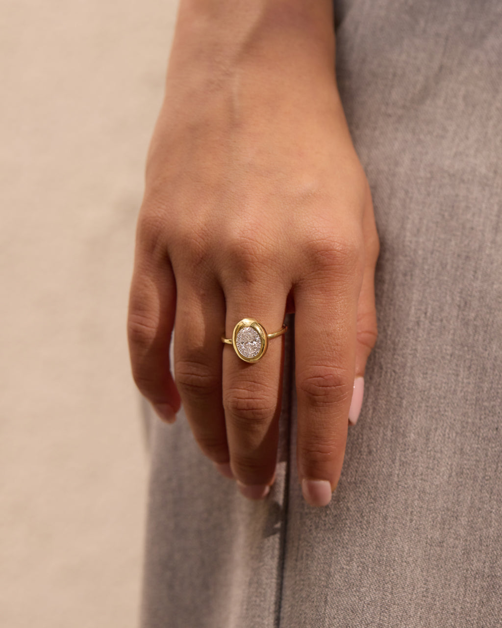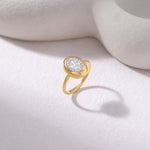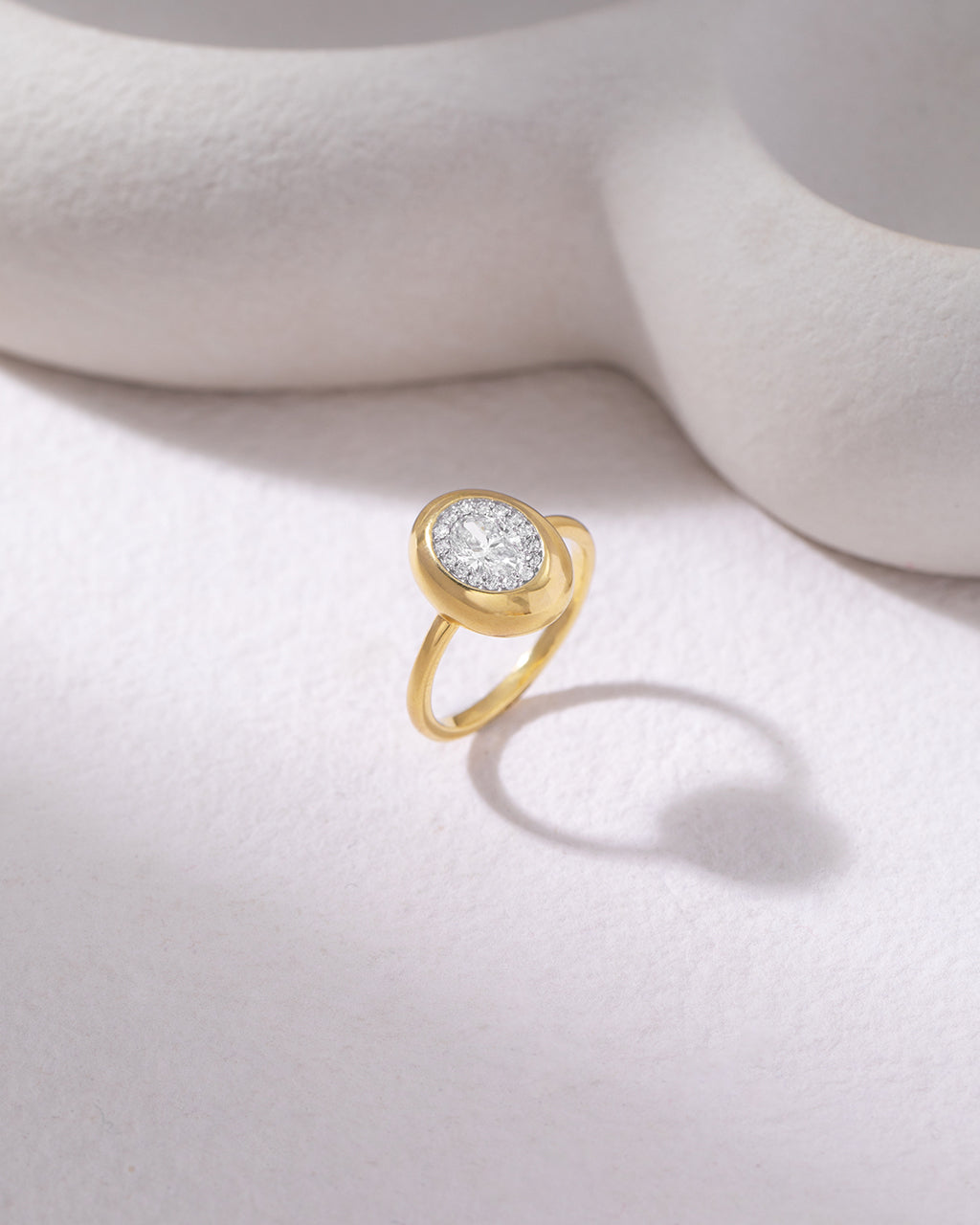 A ring that owns its shine. The oval cluster catches light from every angle , soft, full, and impossible to ignore. Framed in 14kt gold vermeil, it carries quiet confidence with every movement. Not too much, never too little, just the right kind of brilliance for every version of you.