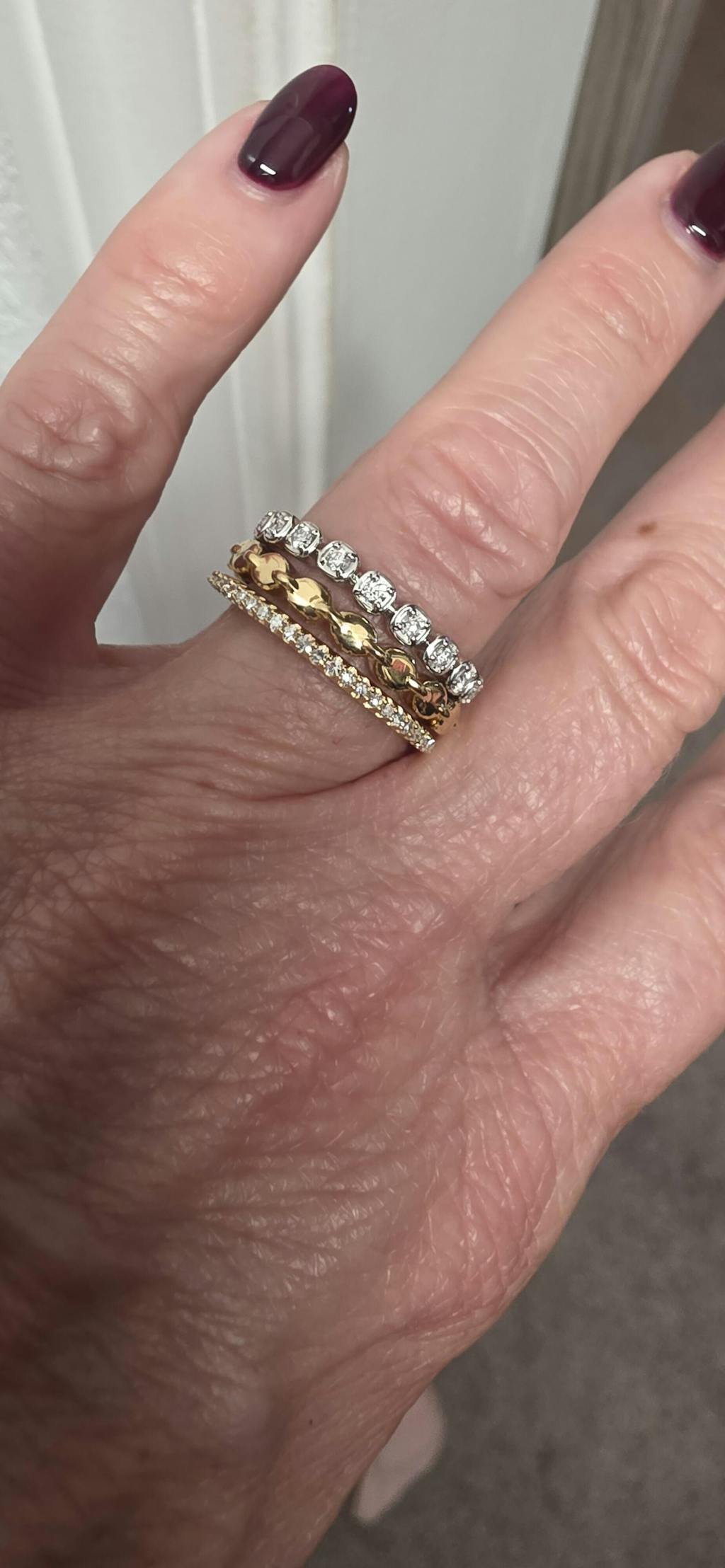 Triple the shine, triple the impact—the Stacked Three Row Diamond Band Ring in polished 14kt Gold Vermeil features three sleek rows of sparkling diamonds, crafted to make every moment feel like a statement.