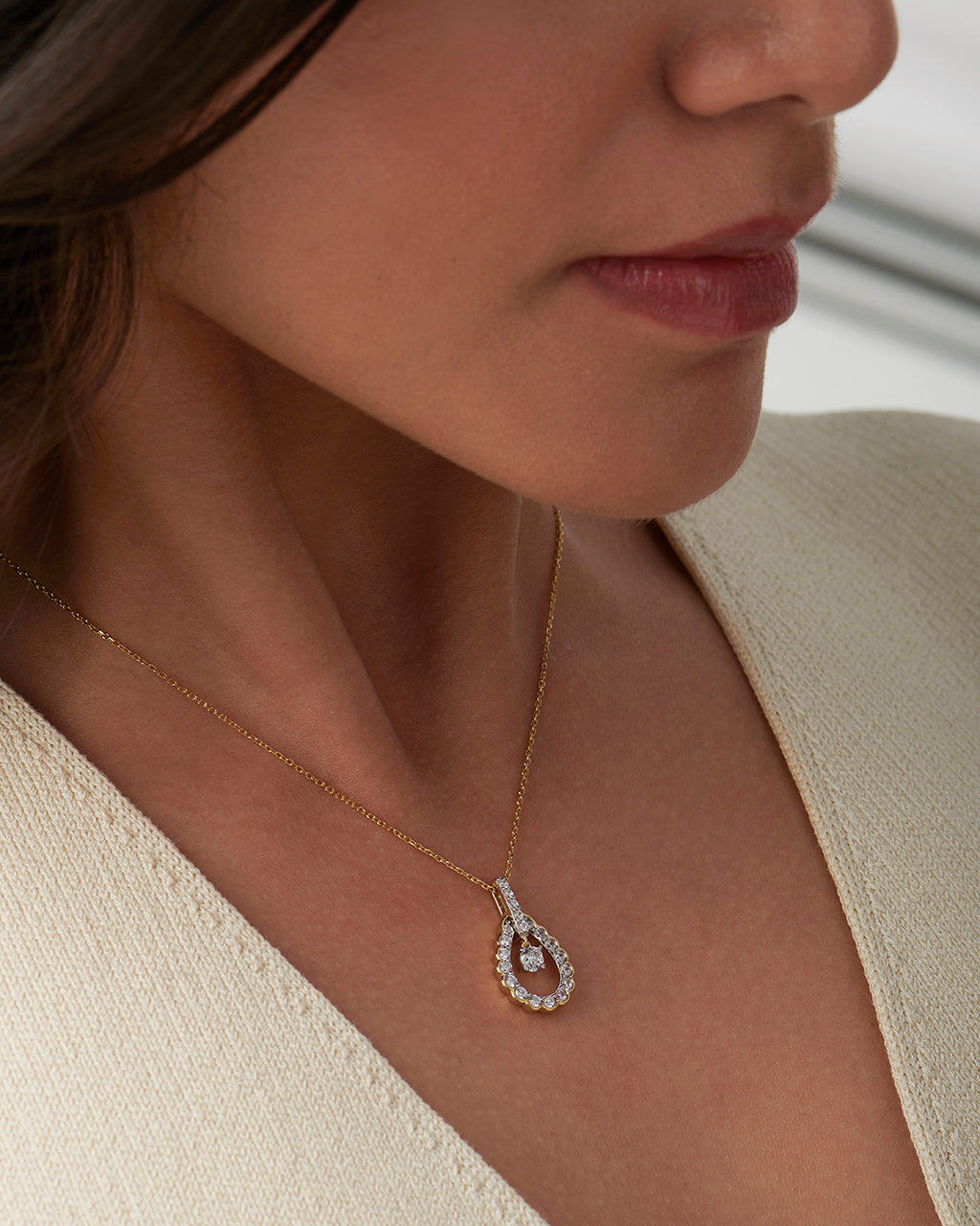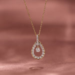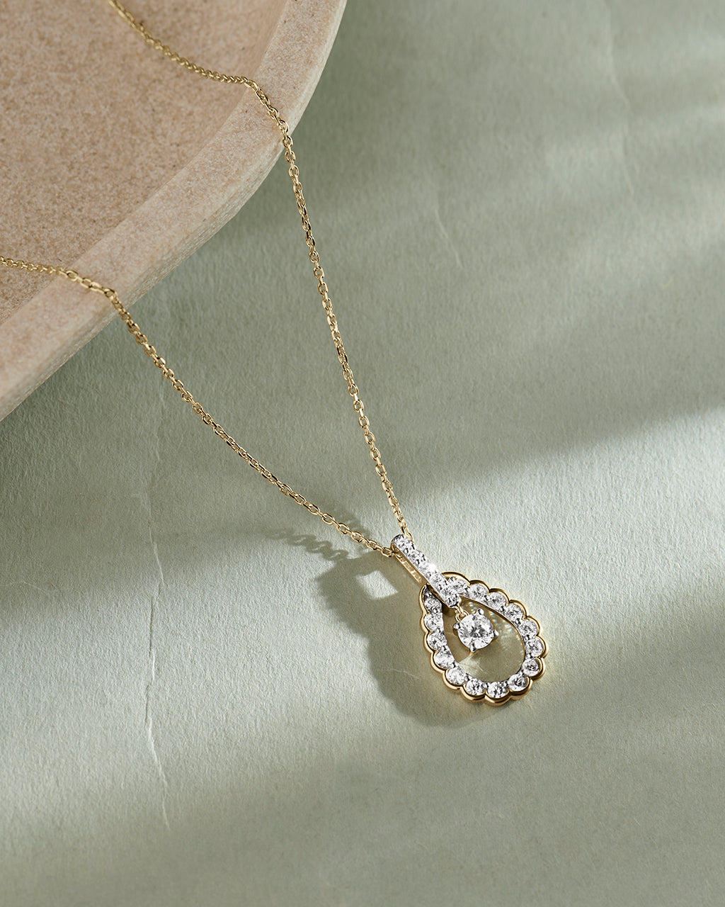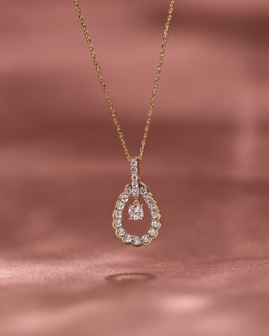Where classic halo meets graceful drop. This 14k gold vermeil pendant features a pear-shaped diamond halo with scalloped detailing, a suspended central diamond, and a pavé-set bail, designed to catch the light from every angle.