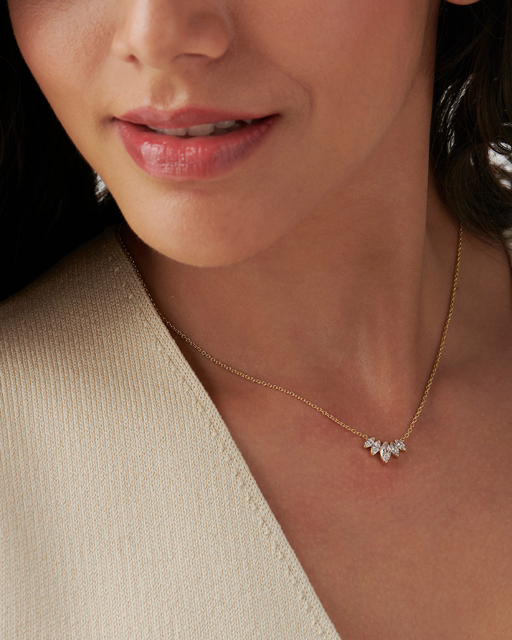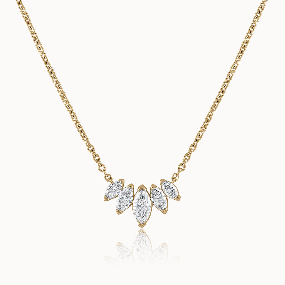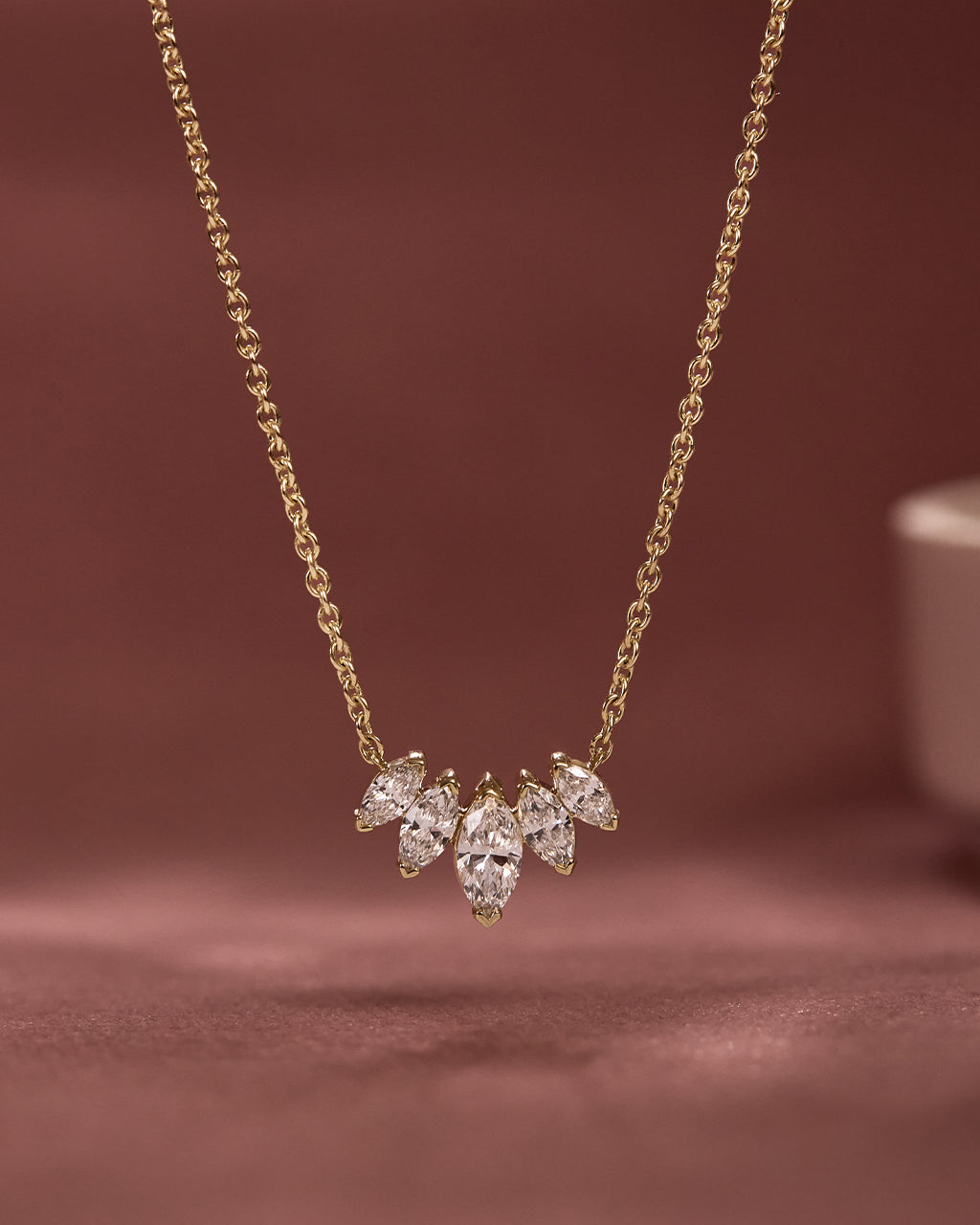 The Petal Marquise Necklace redefines floral with an edge .Marquise diamonds set in a precise petal formation that catches the light against a backdrop of 14kt gold vermeil.