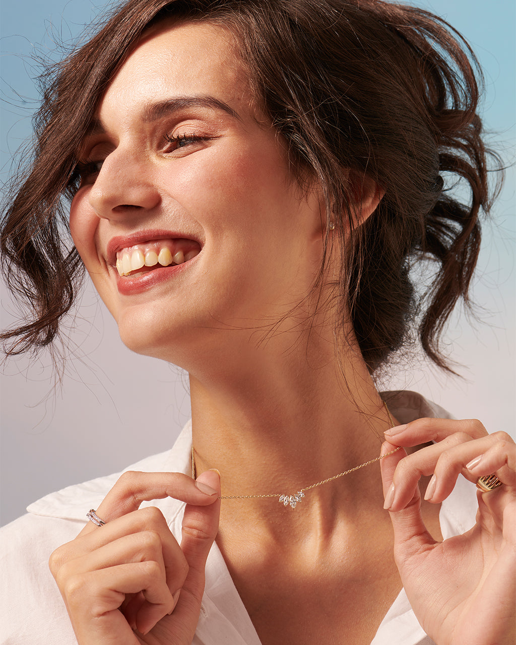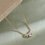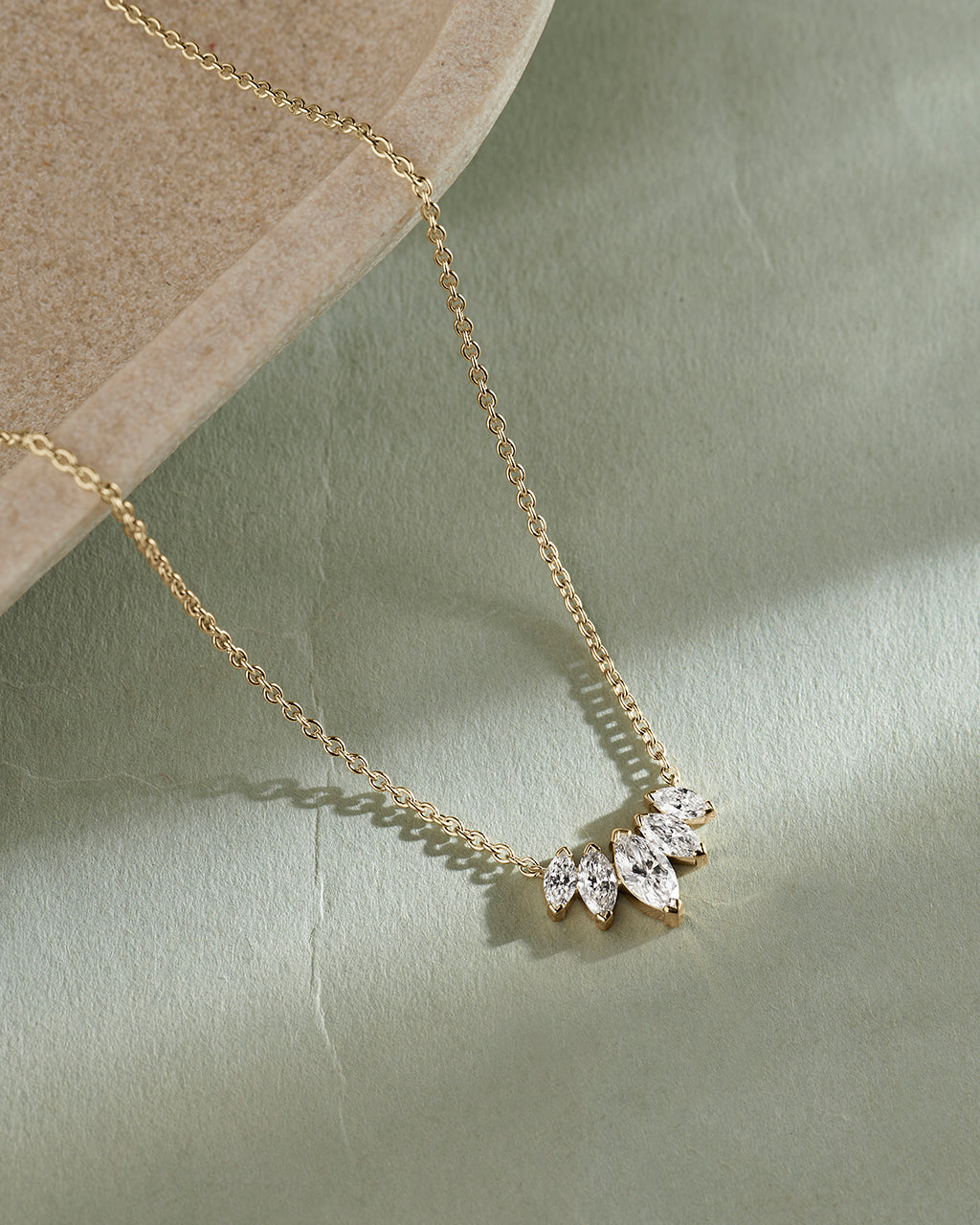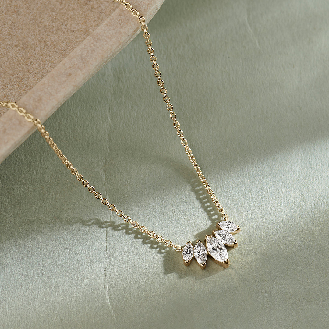 The Petal Marquise Necklace redefines floral with an edge .Marquise diamonds set in a precise petal formation that catches the light against a backdrop of 14kt gold vermeil.