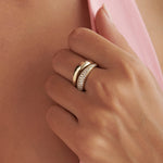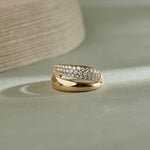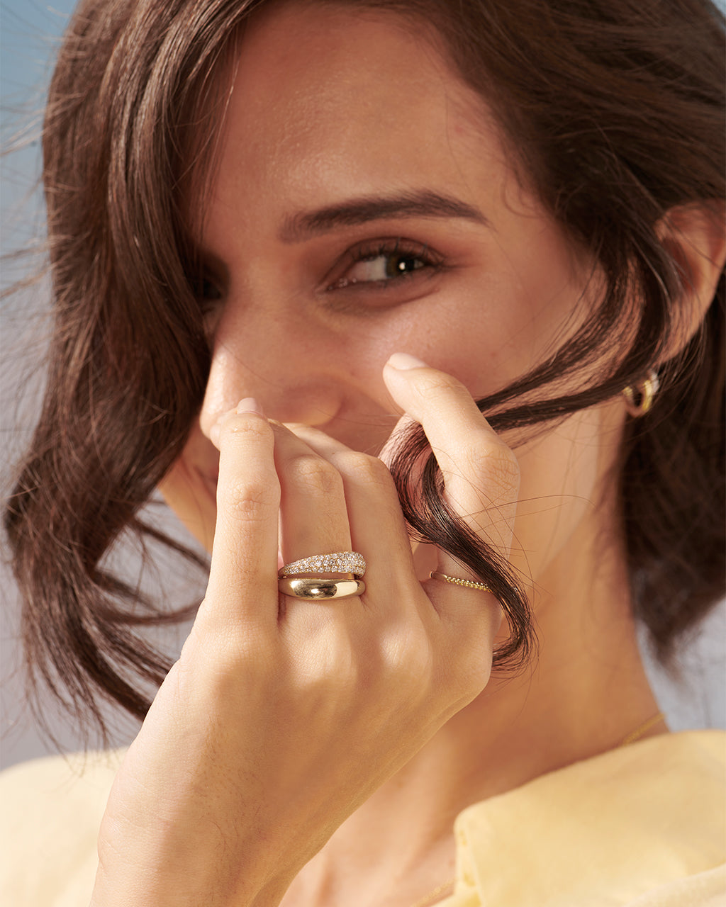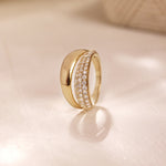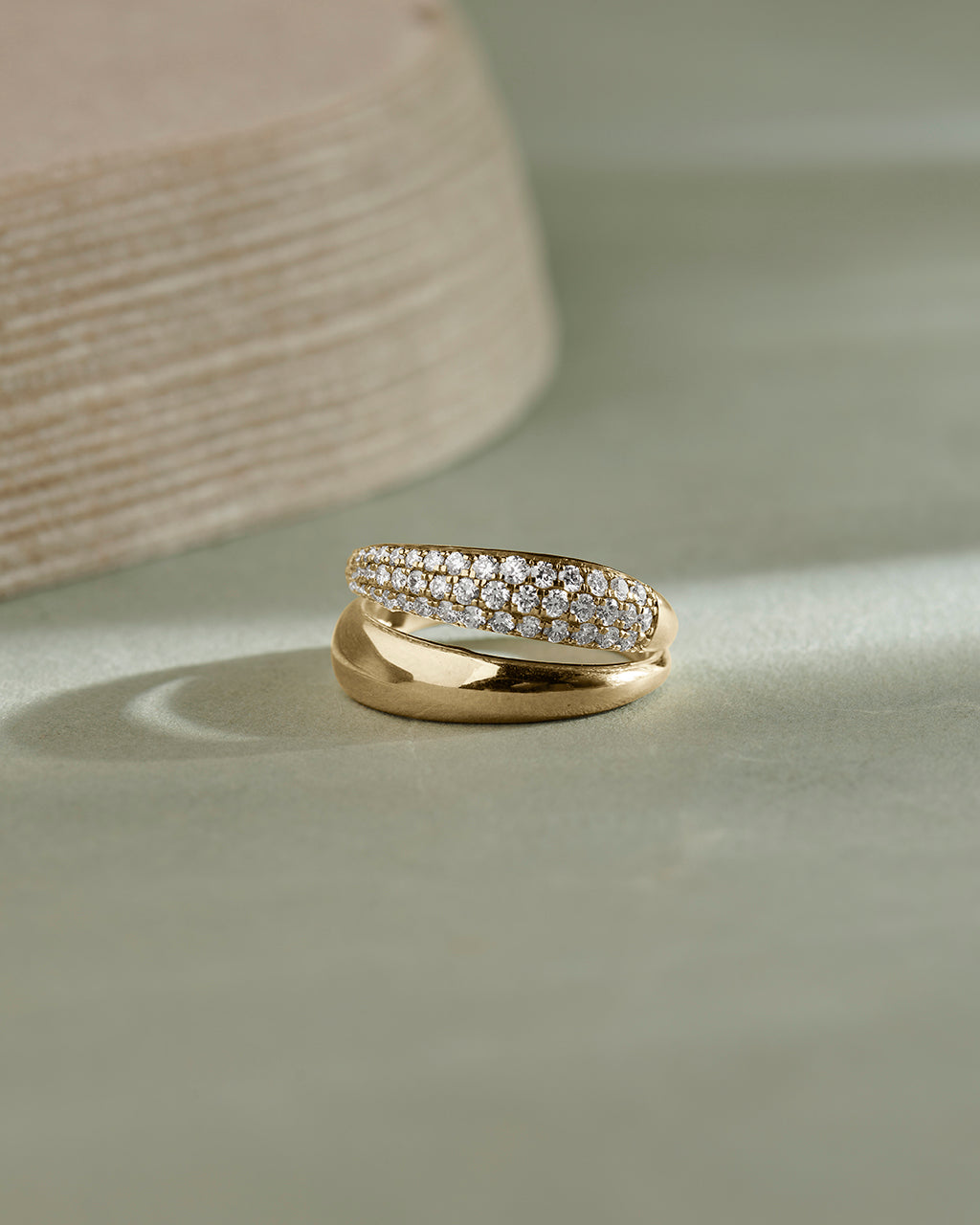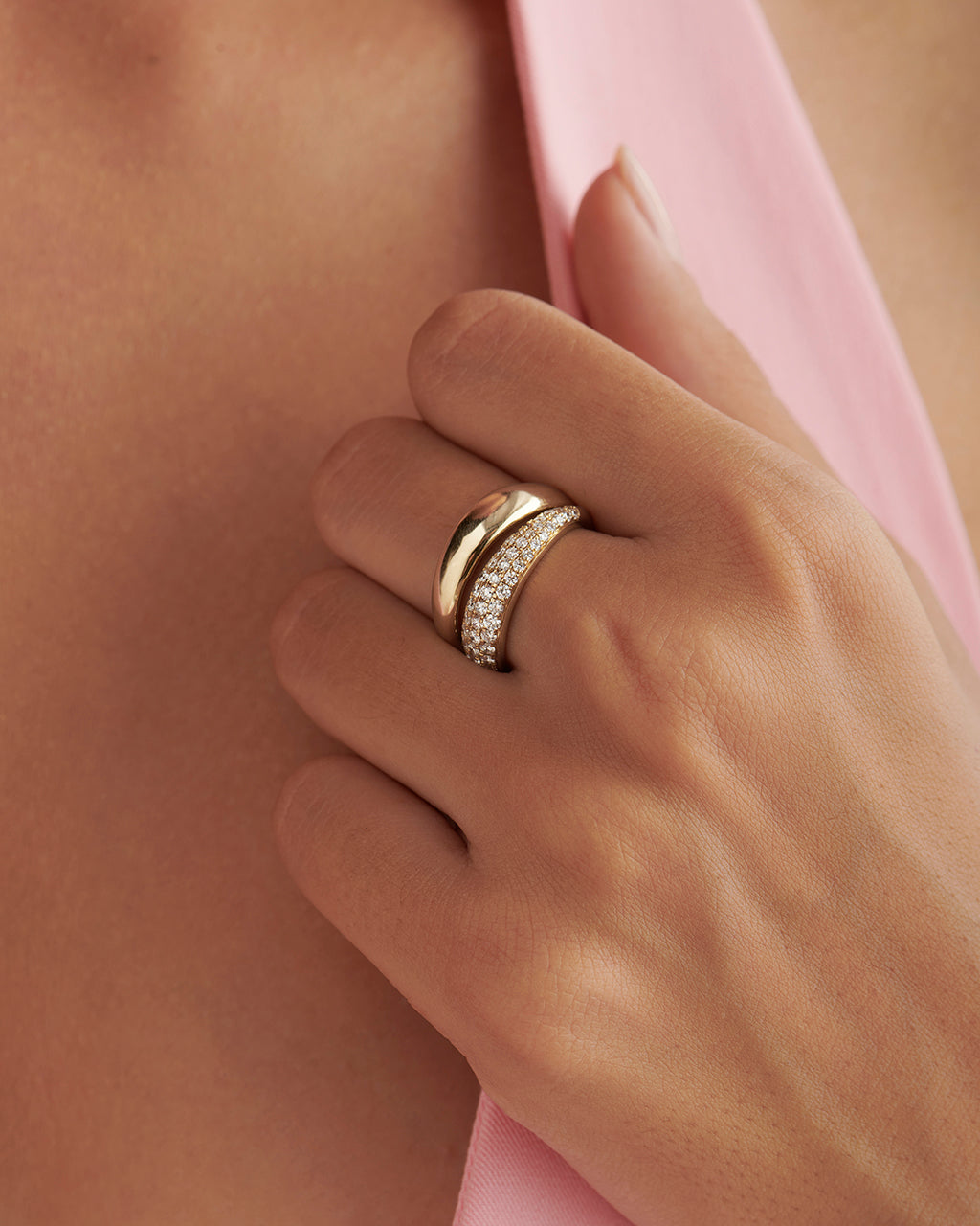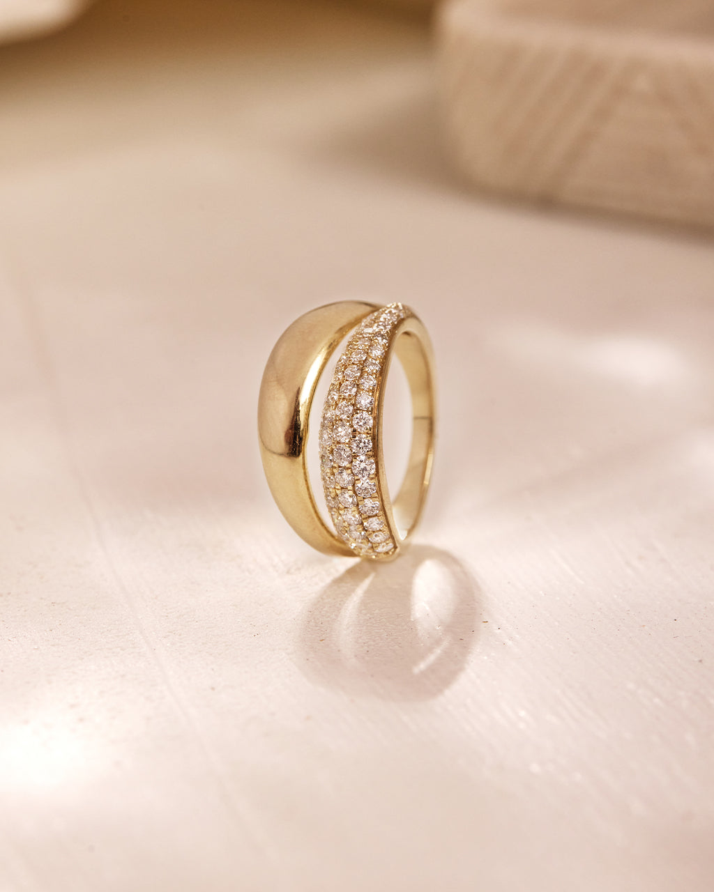 Smooth gold meets crisp pavé lines in this sculpted dome ring, crafted for those who wear their shine with confidence.