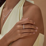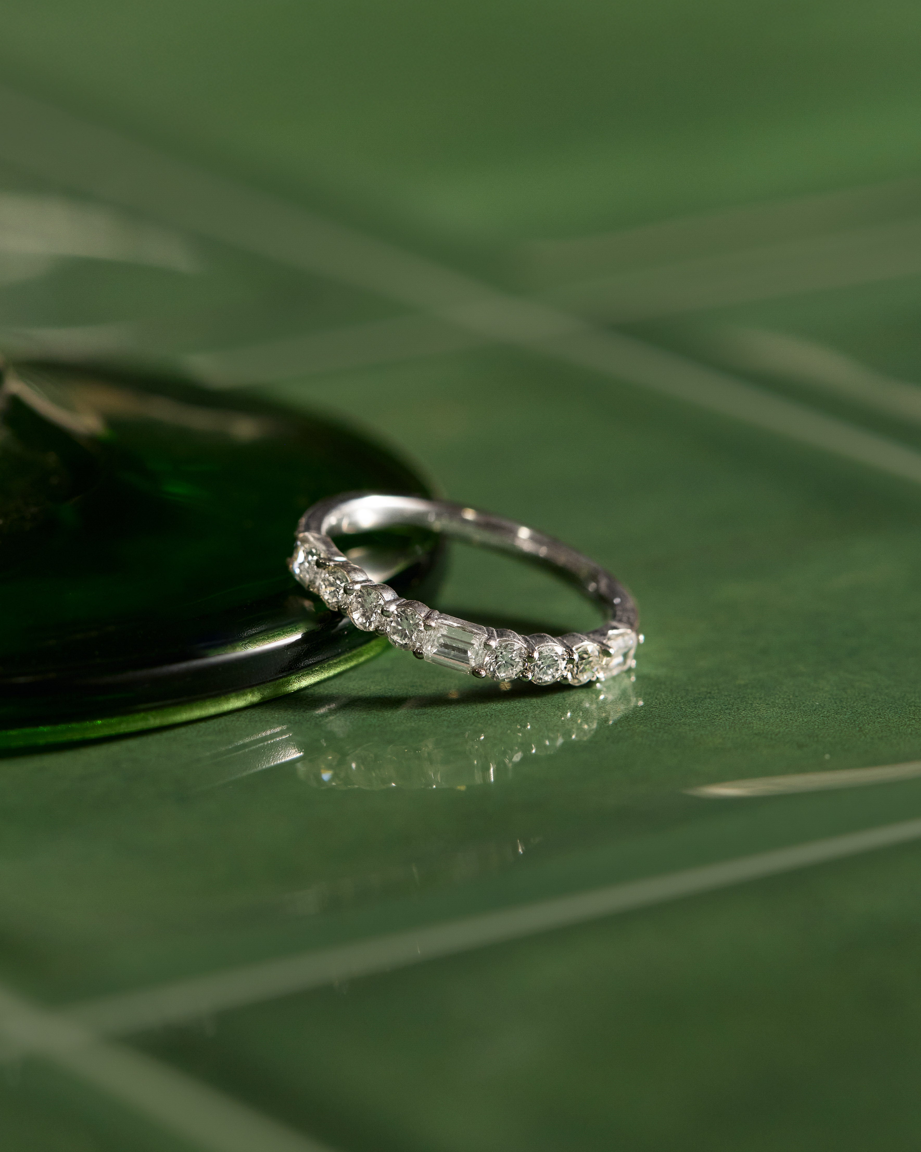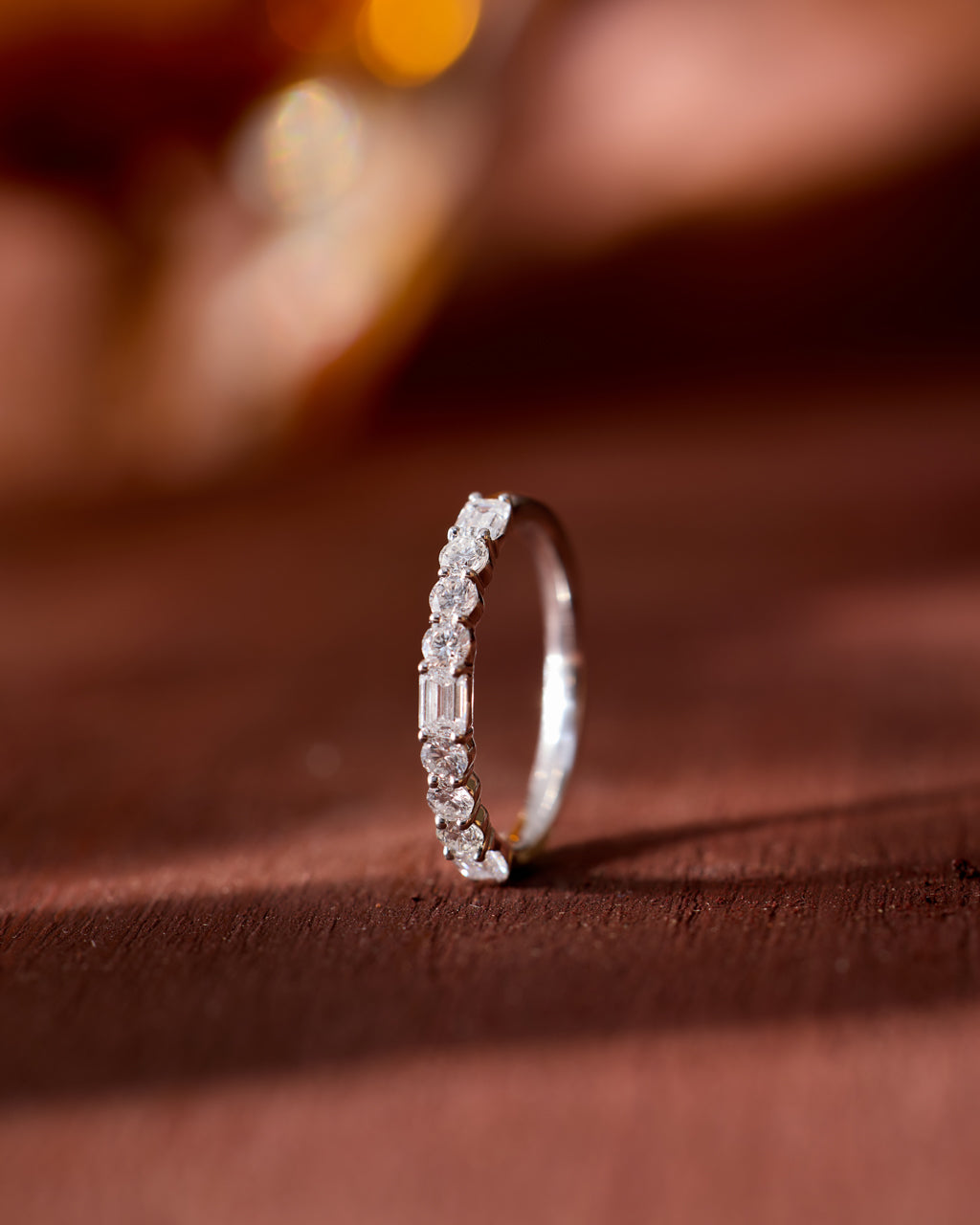 Classic shapes, endless sparkle—the Baguette and Round Diamond Band Ring in polished Sterling Silver pairs sleek baguette cuts with brilliant round diamonds, creating a timeless band with a modern edge.