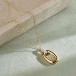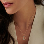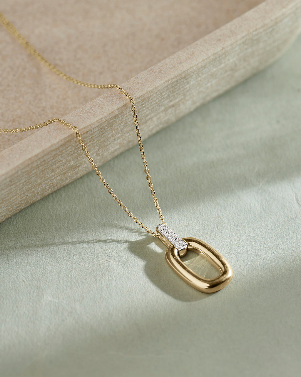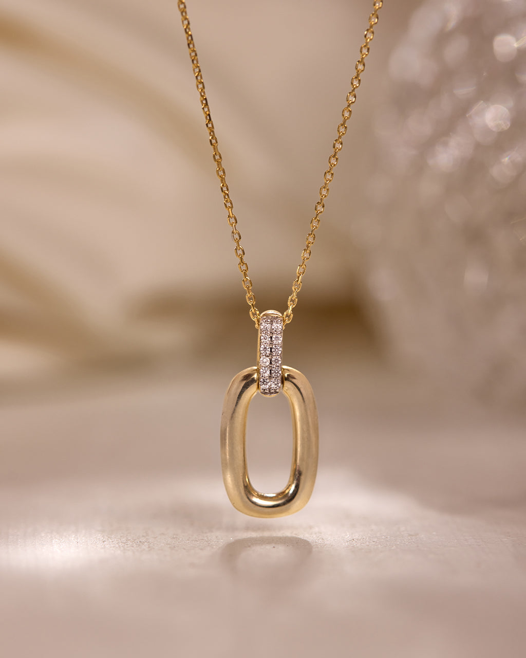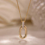 Minimal shape, maximum impact. This 14k gold vermeil pendant features an oversized gold link suspended from a pavé diamond bar , creating a sleek, modern statement that pairs effortlessly with any look.