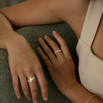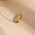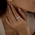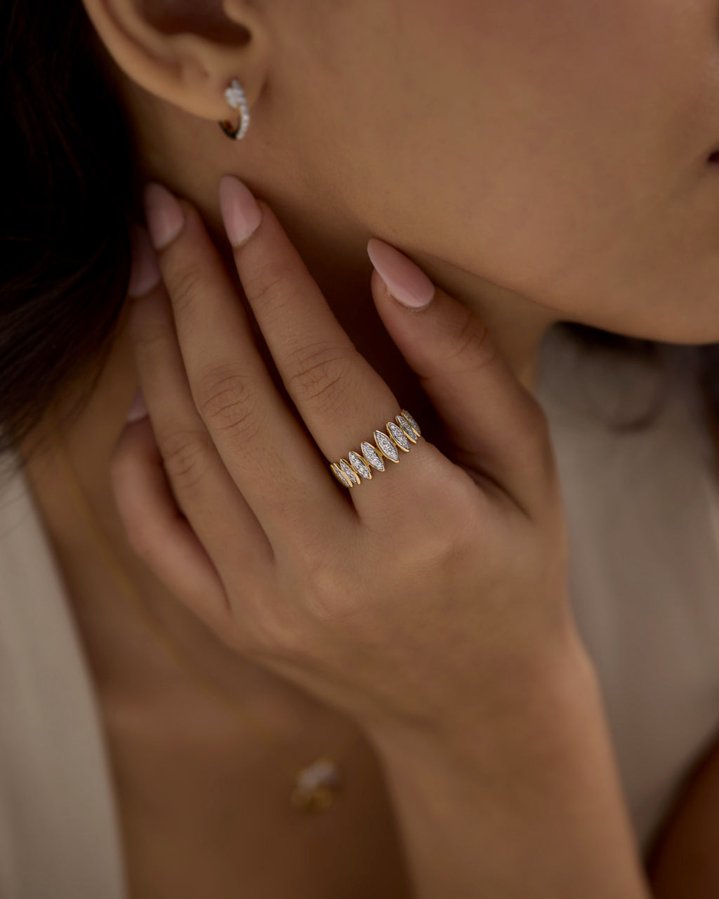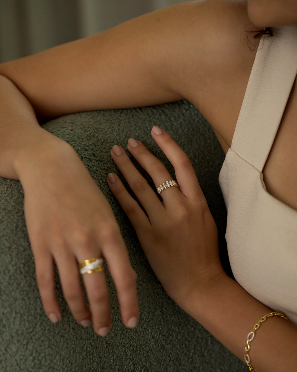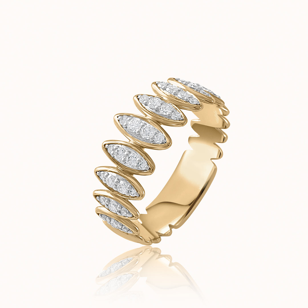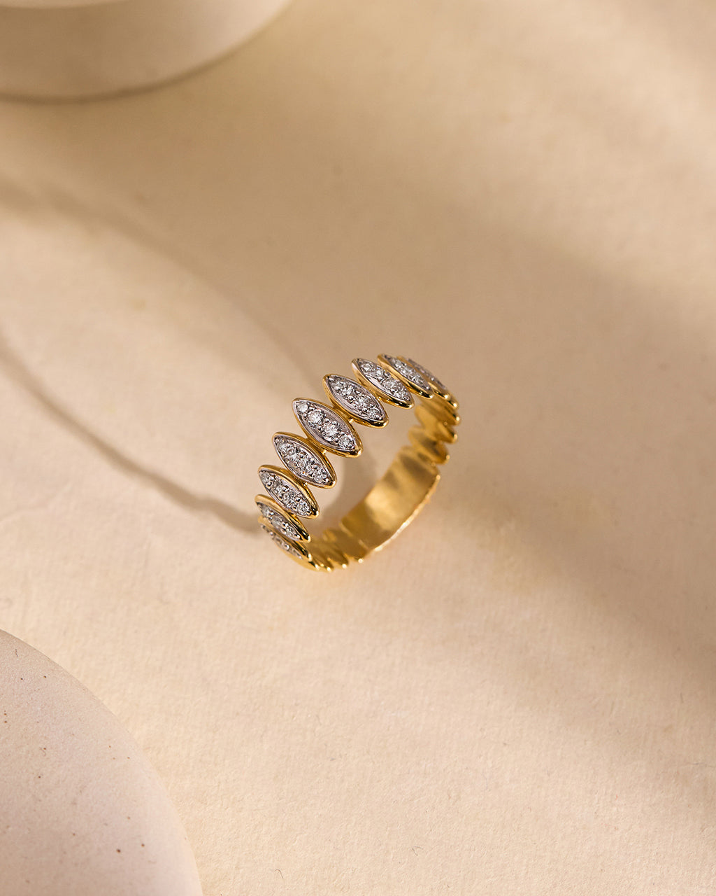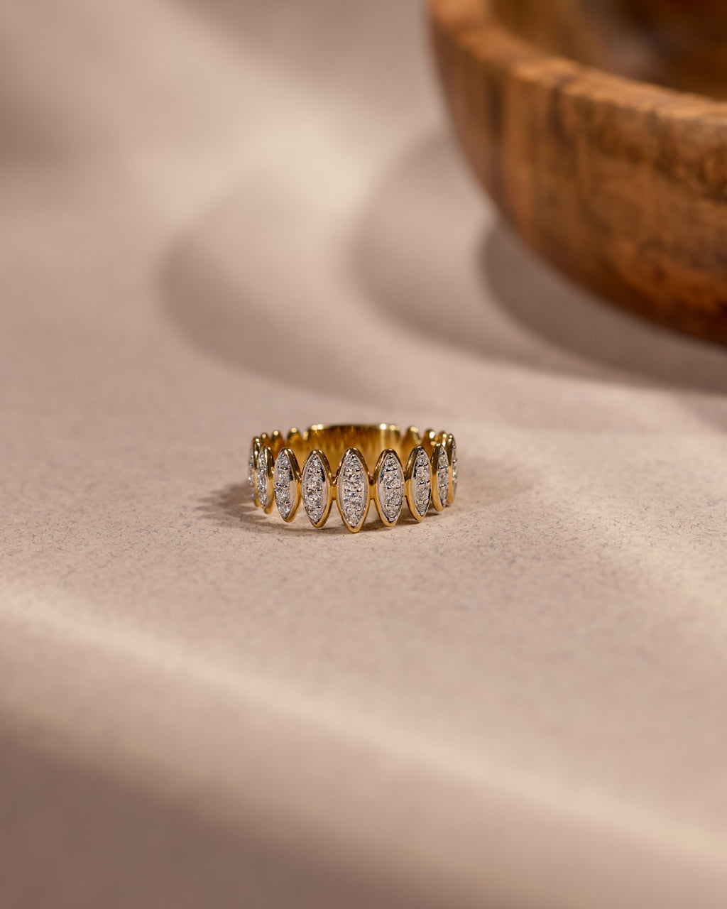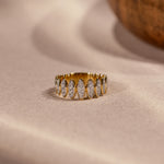 Where illusion meets brilliance—the Marquise Mirage Diamond Band Ring in polished 14kt Gold Vermeil features marquise-cut diamond accents that create a shimmering flow, perfect for stacking or making a statement on its own.