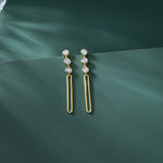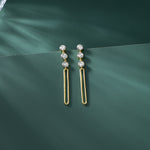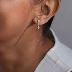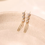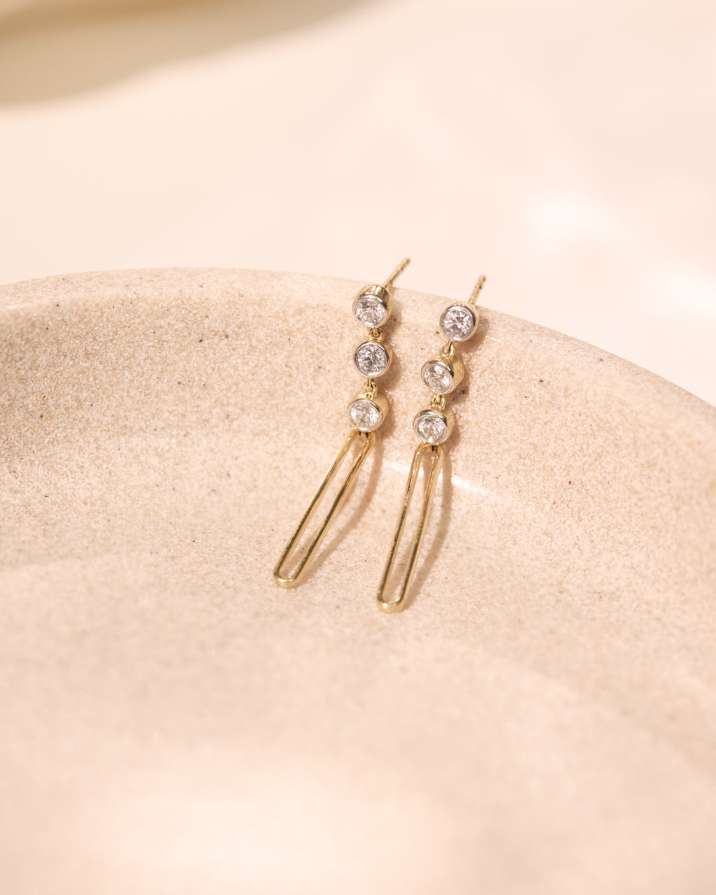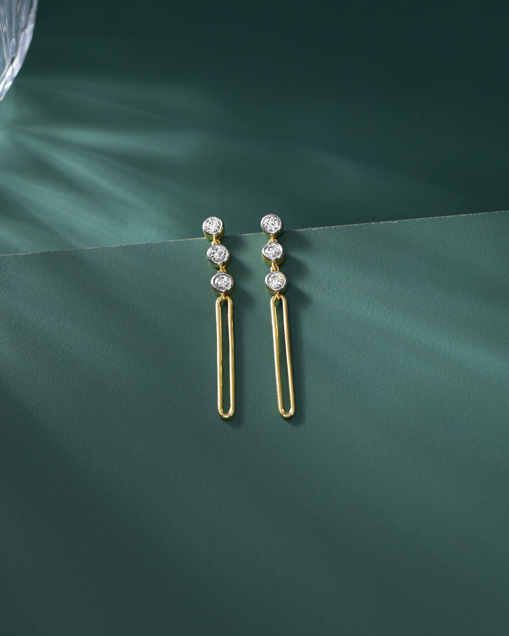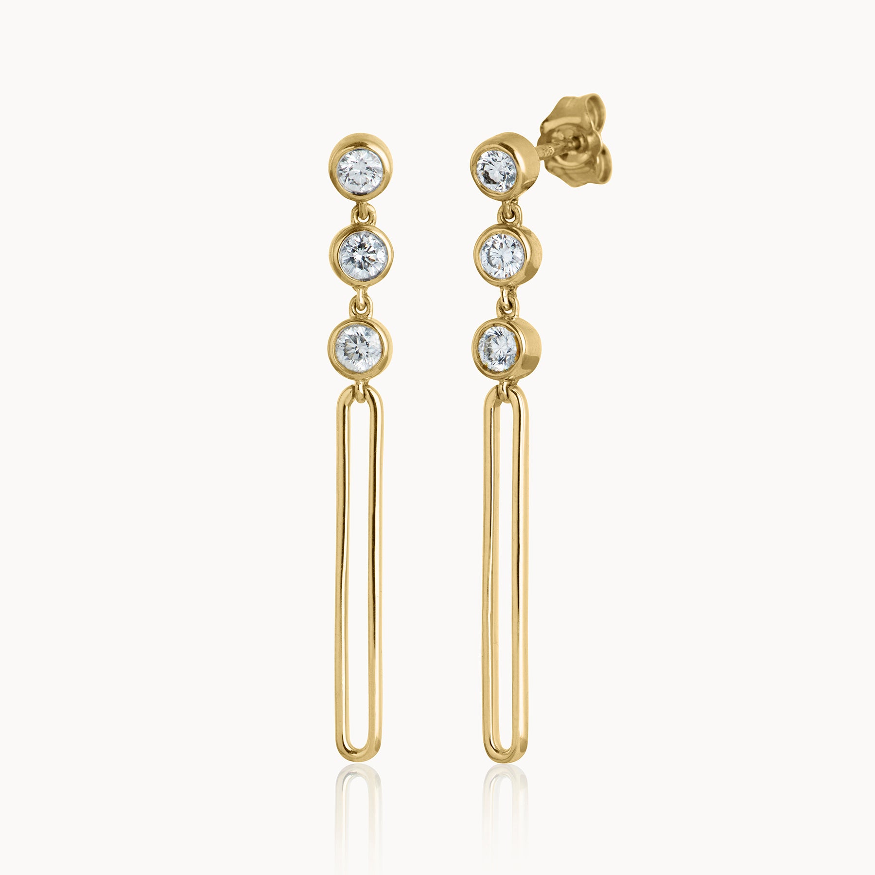 Three round diamond clusters cascade into a single gold paperclip drop. Light, sculptural, and unmistakably bold.