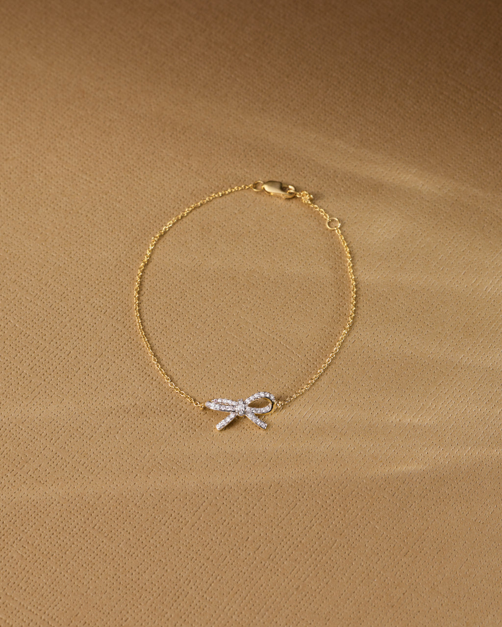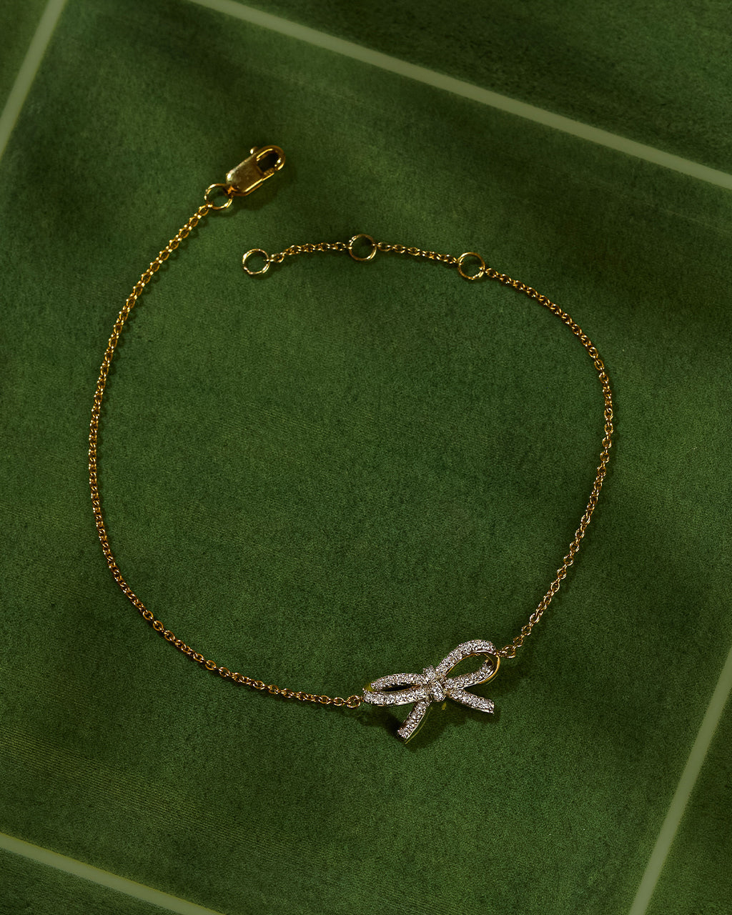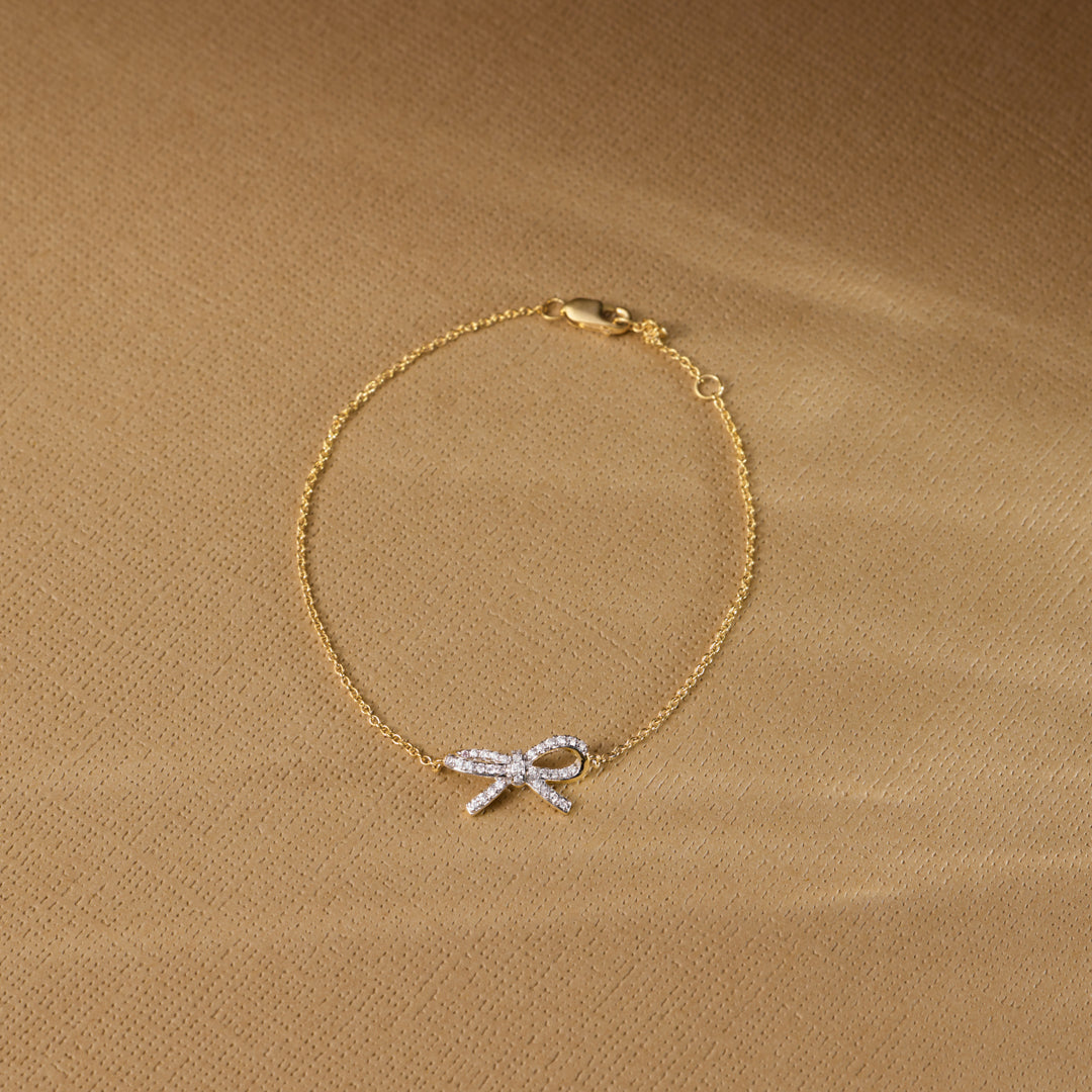 Add a playful touch of sparkle with the Bow & Glow Diamond Bracelet in polished 14kt Gold Vermeil. Featuring a delicate bow design accented with shimmering diamonds, this bracelet brings effortless charm to your everyday style.