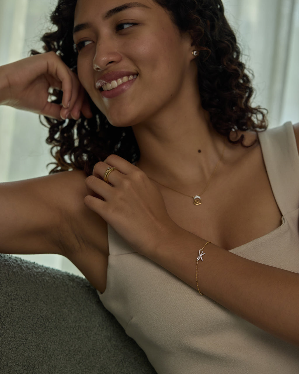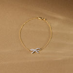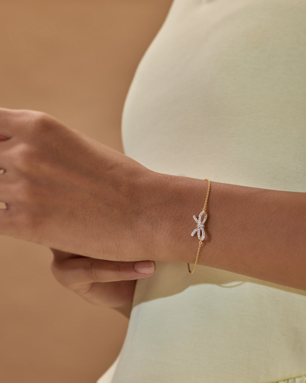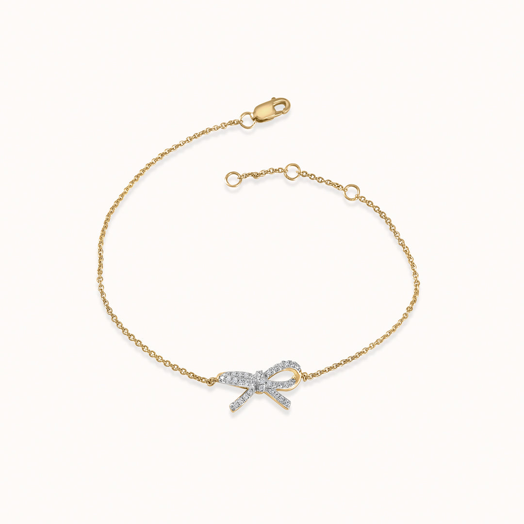 Add a playful touch of sparkle with the Bow & Glow Diamond Bracelet in polished 14kt Gold Vermeil. Featuring a delicate bow design accented with shimmering diamonds, this bracelet brings effortless charm to your everyday style.