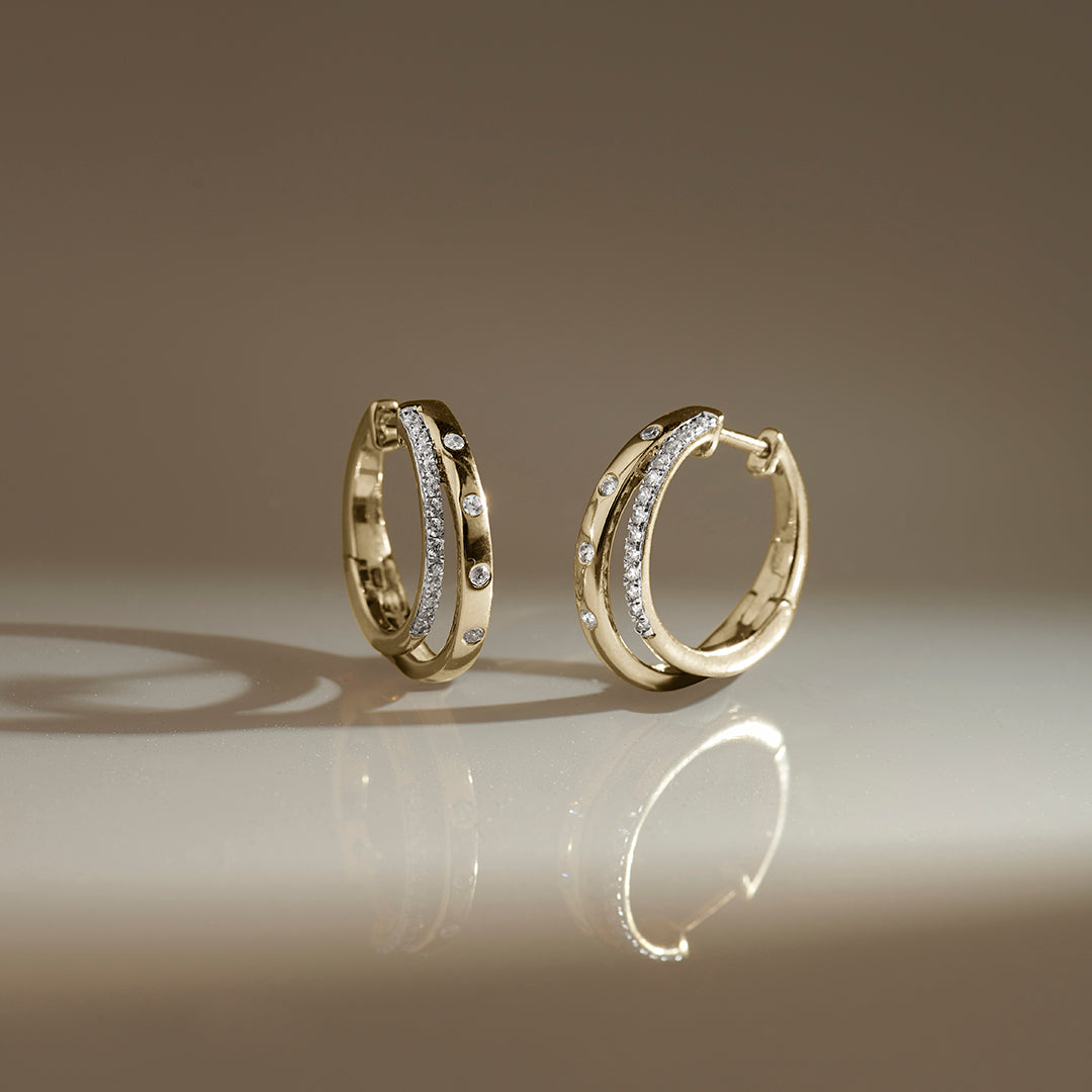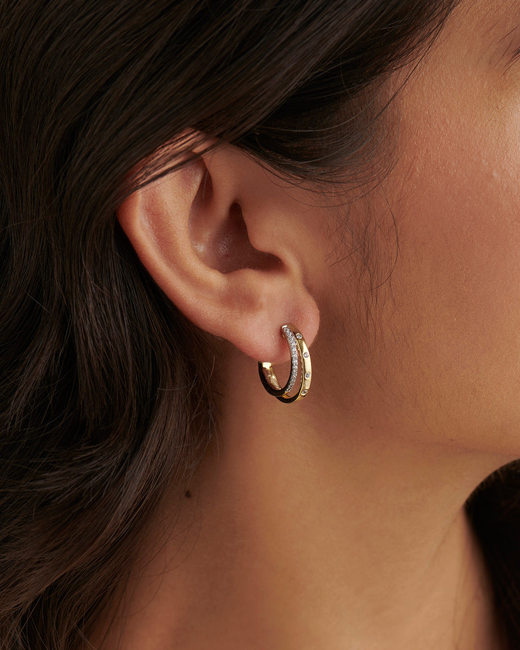 Two gleaming bands meet in a modern hoop silhouette, one lined with pavé-set diamonds and the other polished to perfection in 14kt gold vermeil.
