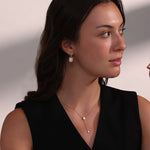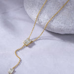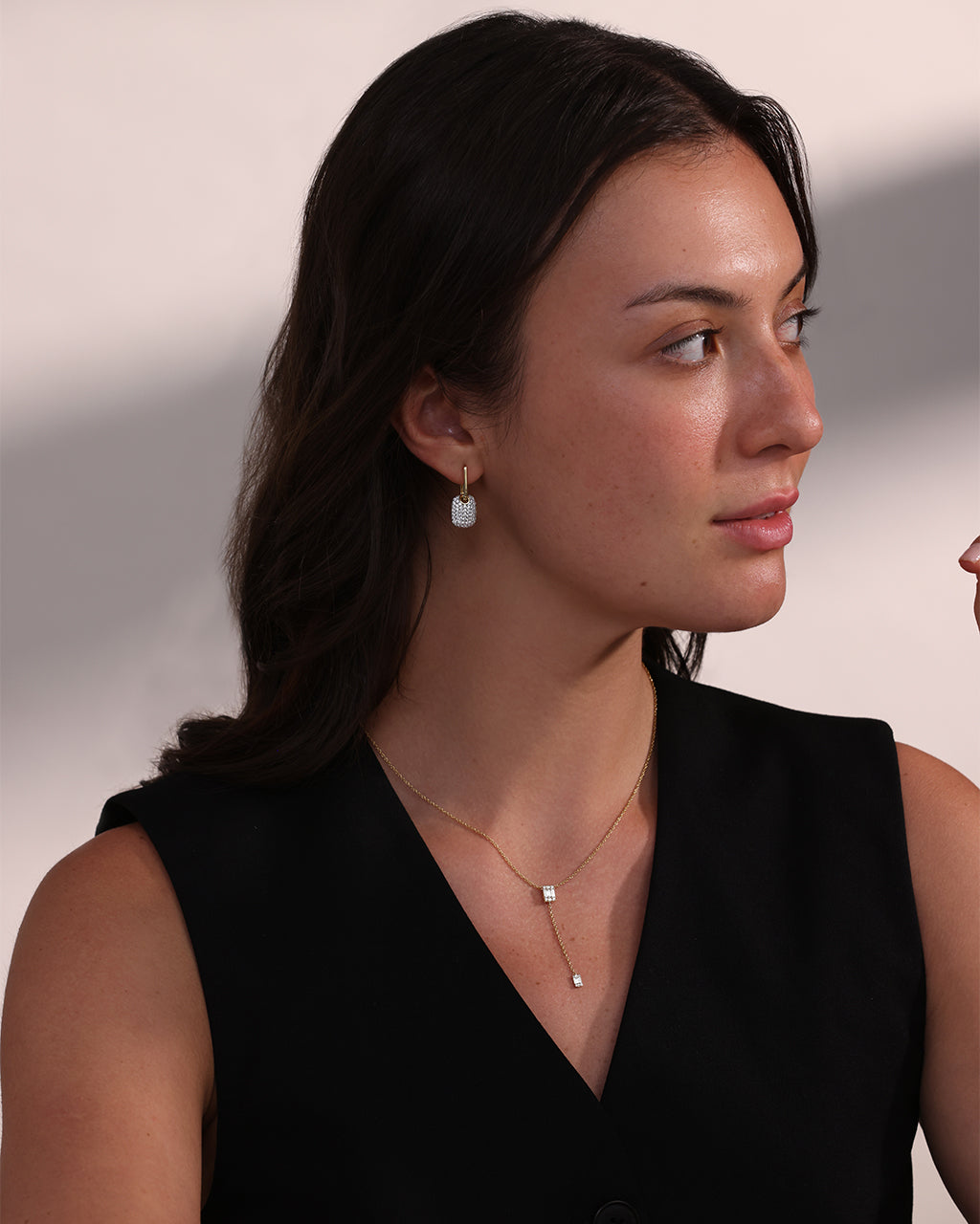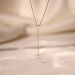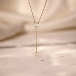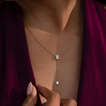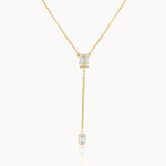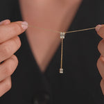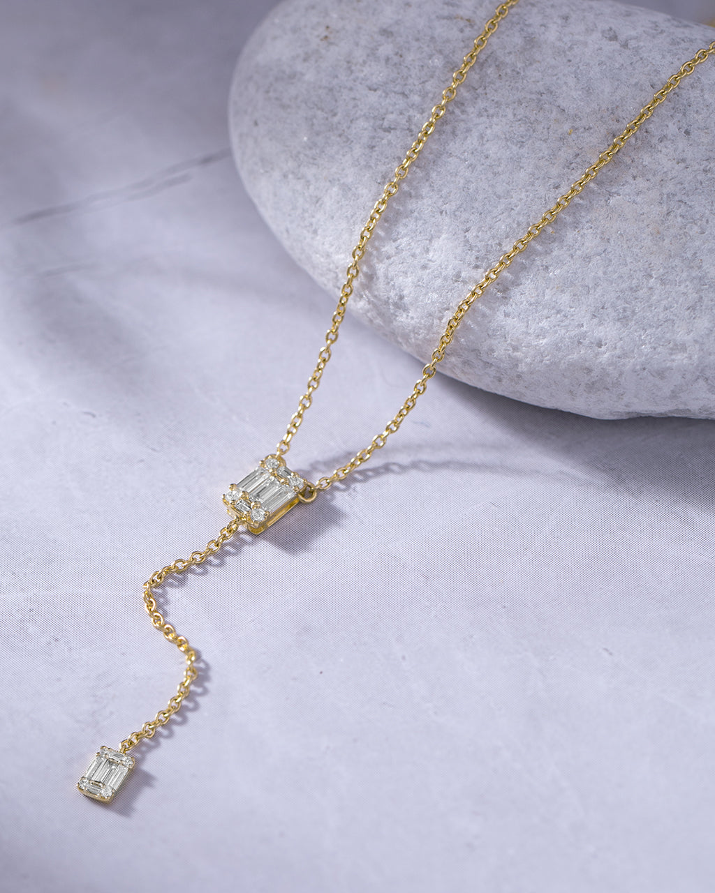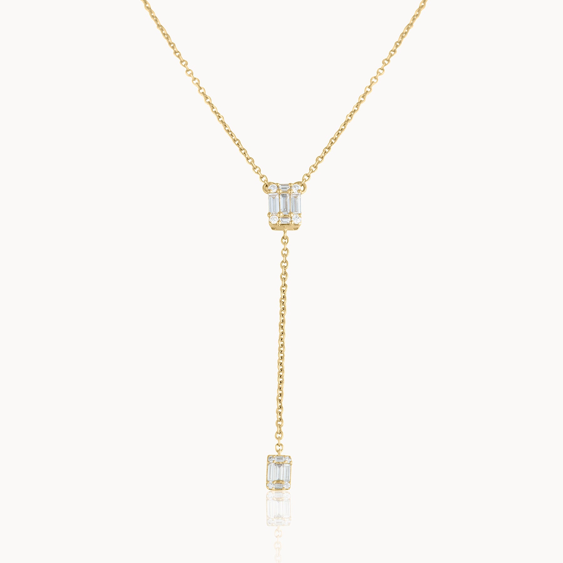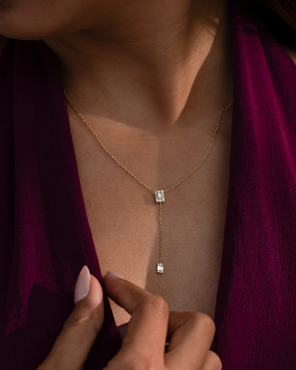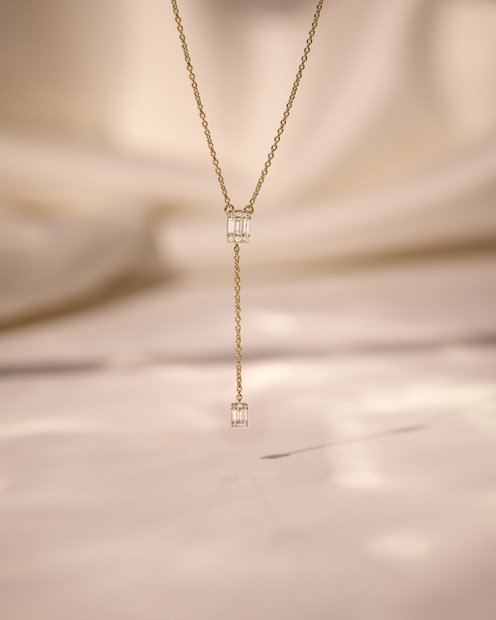 A modern take on the lariat, this necklace pairs a sharp baguette-cut diamond at the collar with a delicate drop that ends in a second stone — crafted to elongate and elevate.