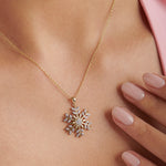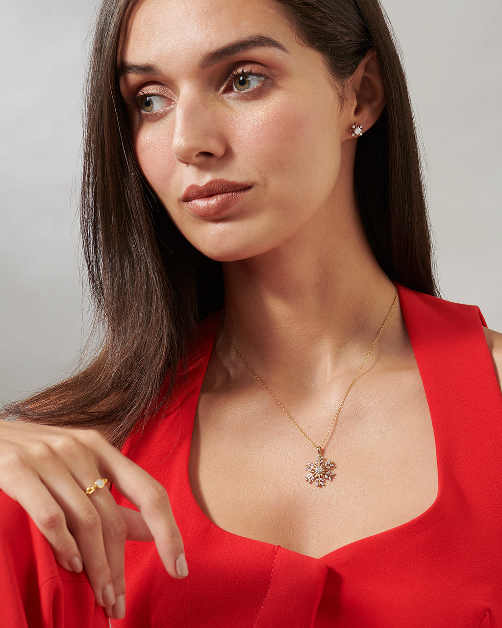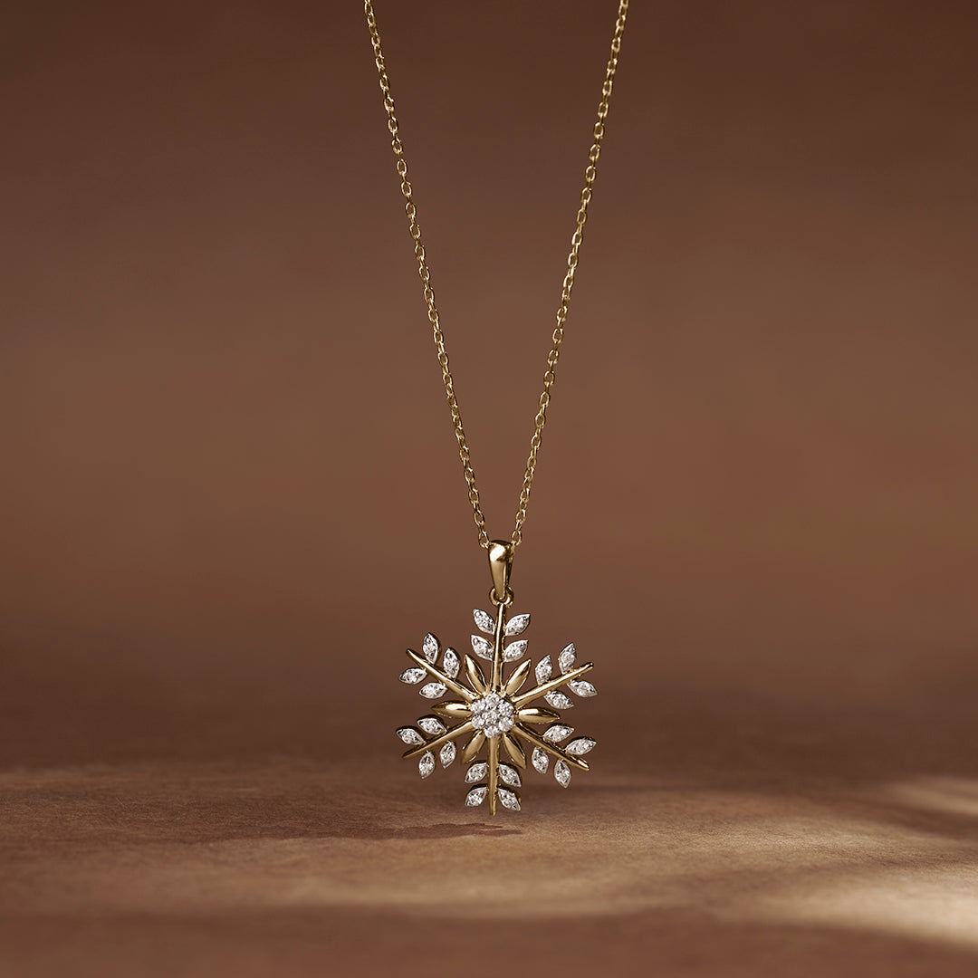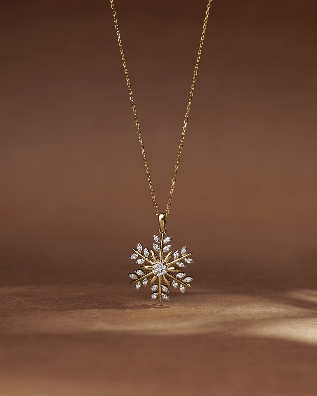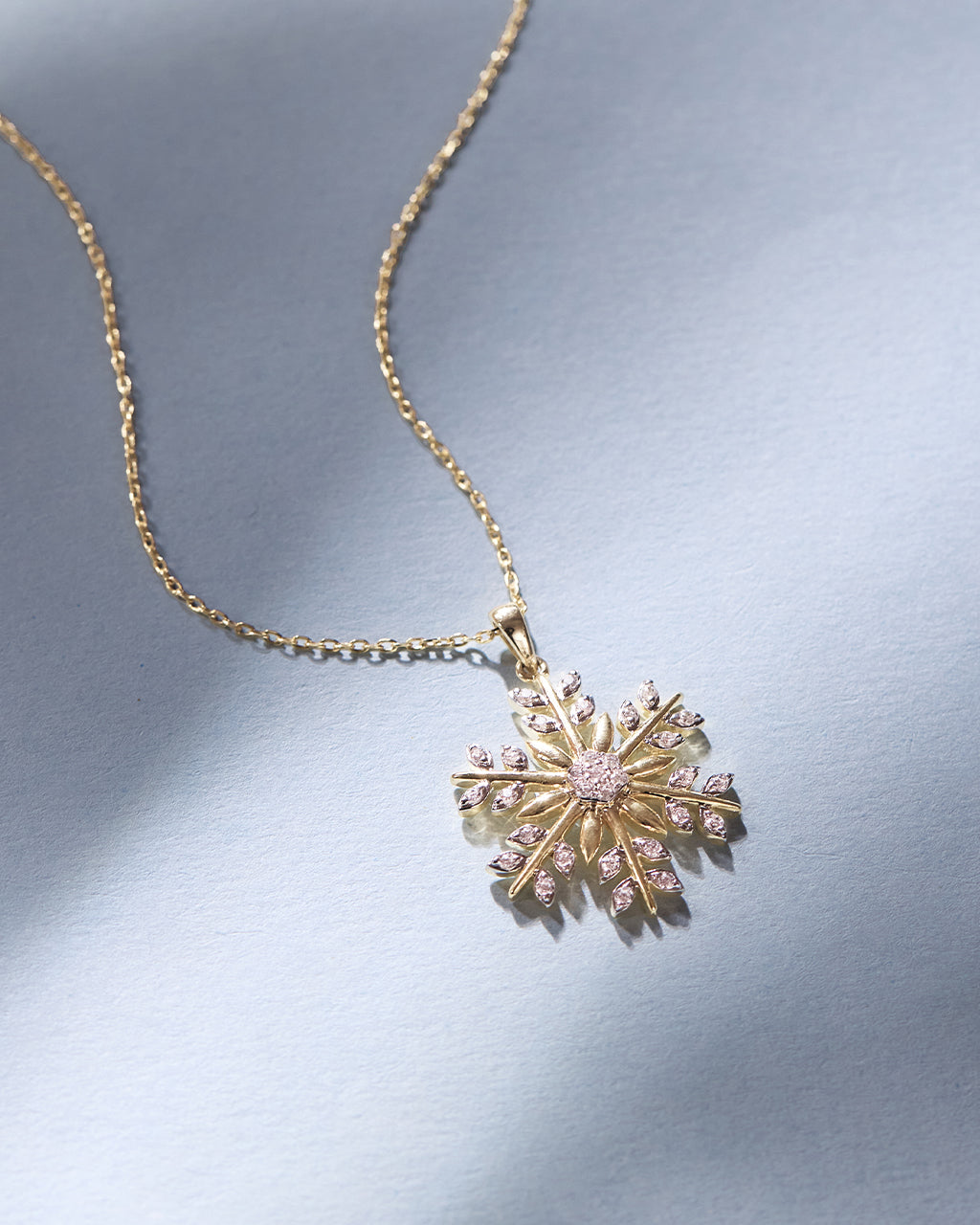 A delicate snowflake brought to life with diamond accents, each facet crafted in glowing 14kt gold vermeil for a timeless charm.