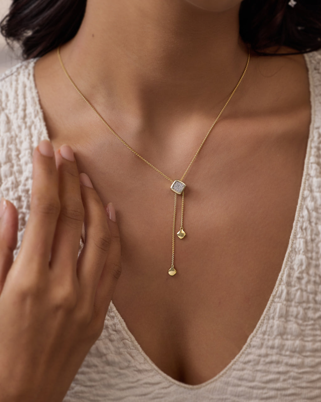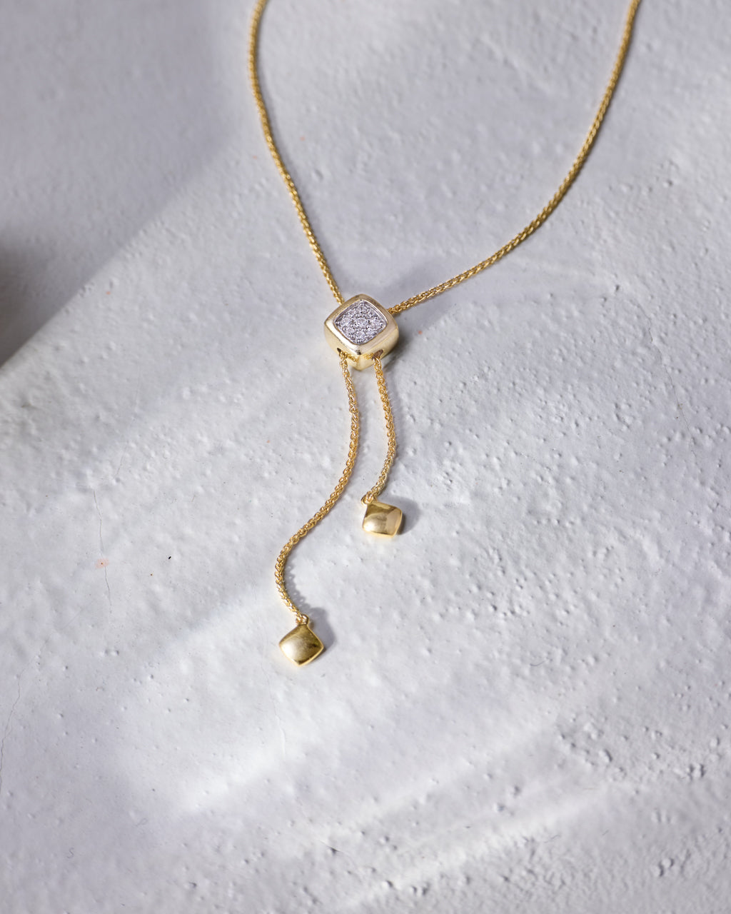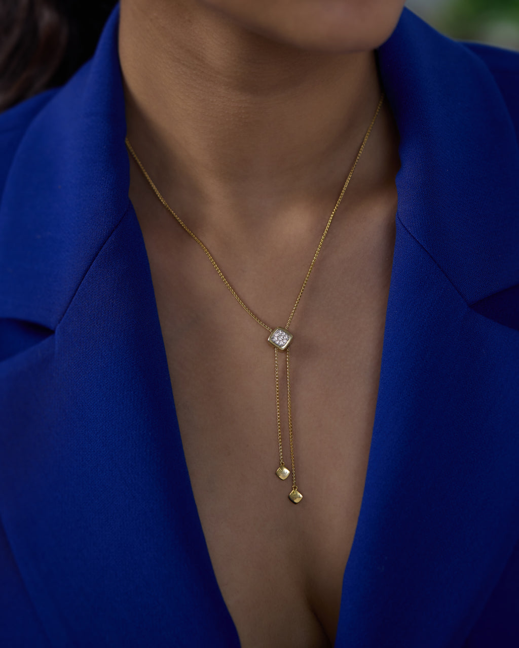 Sleek lines, effortless flow—the Square Cluster Adjustable Lariat Necklace in polished 14kt Gold Vermeil features a modern lariat design with bold square accents, bringing a fresh edge to your everyday style.