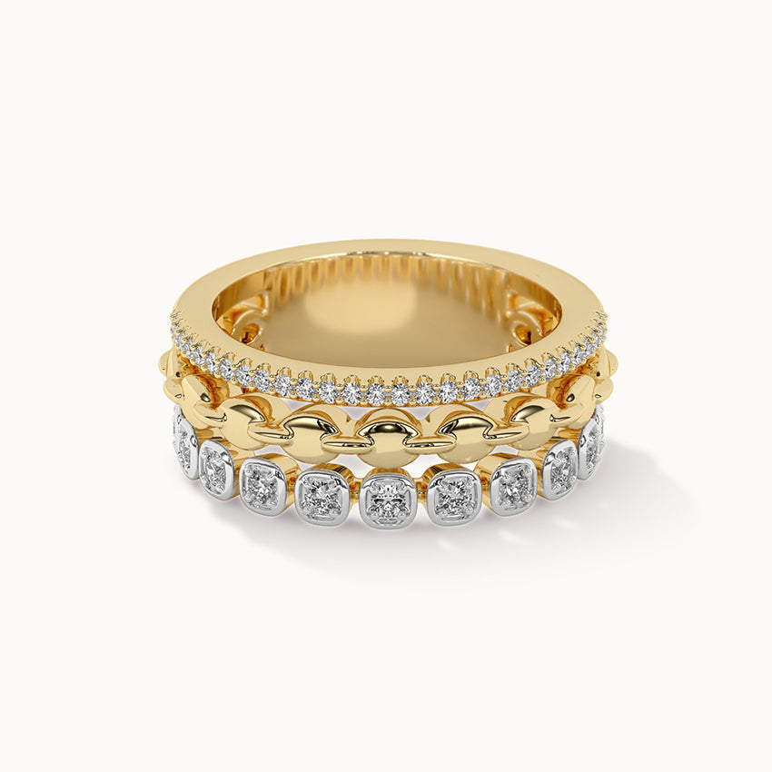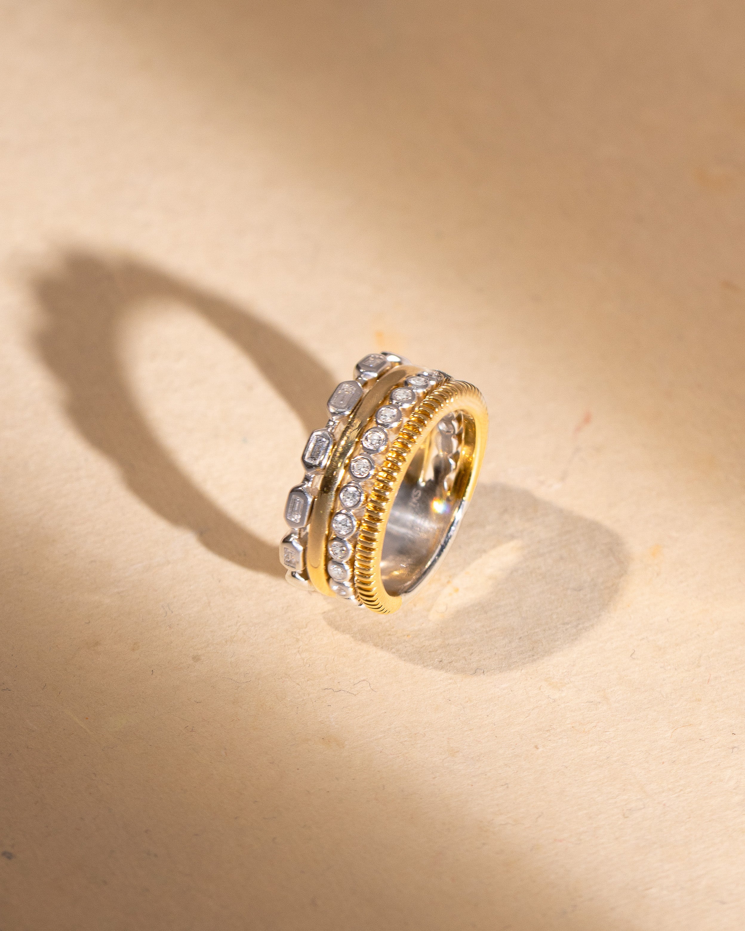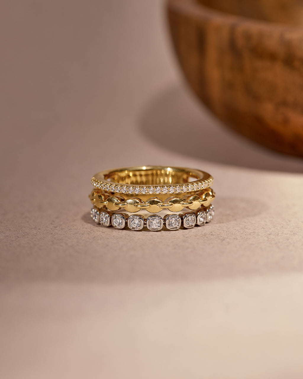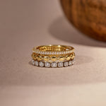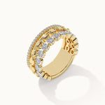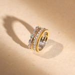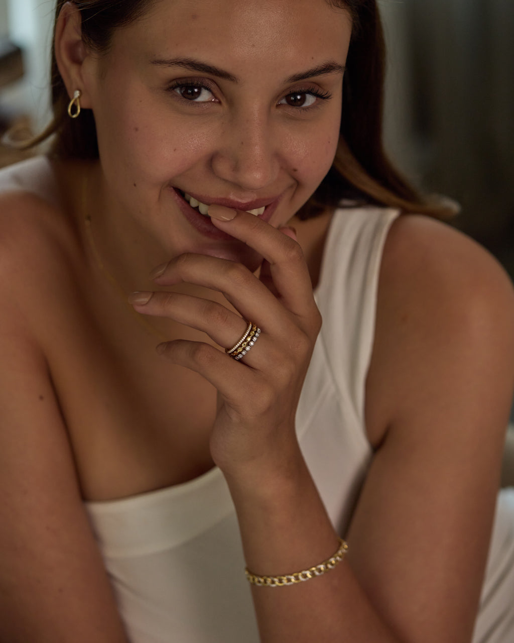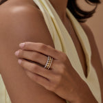 Triple the shine, triple the impact—the Stacked Three Row Diamond Band Ring in polished 14kt Gold Vermeil features three sleek rows of sparkling diamonds, crafted to make every moment feel like a statement.