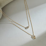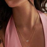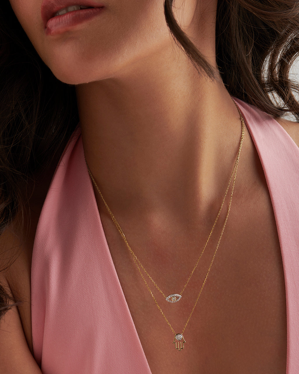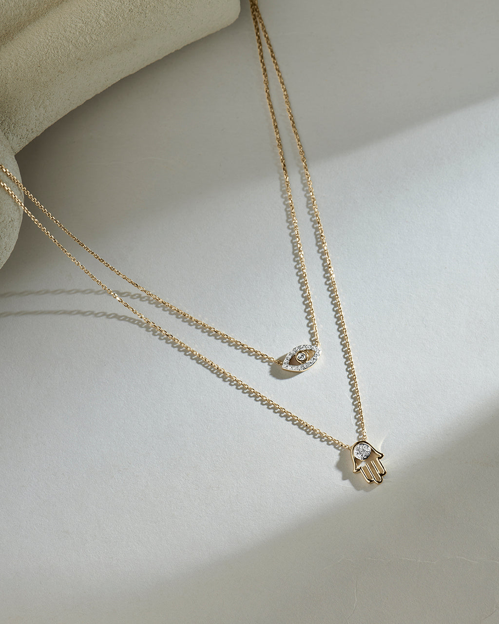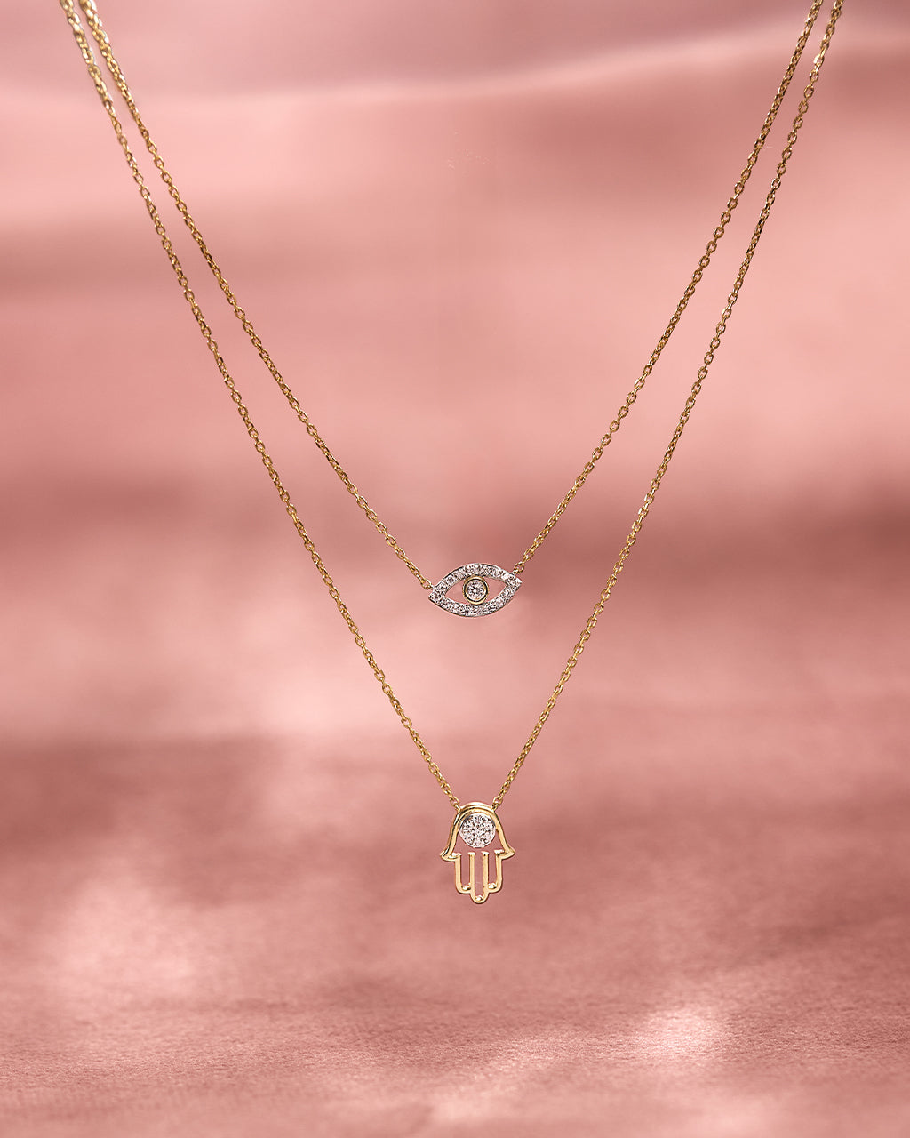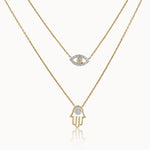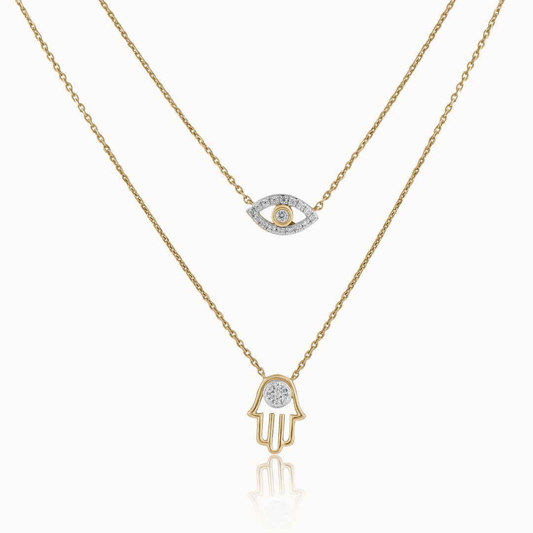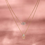 A duo of meaningful symbols, the protective evil eye and the Hamsa hand brought together in one layered necklace. Each symbol accented with diamonds, they are layered together in glowing 14kt gold vermeil.