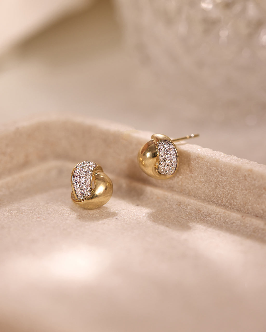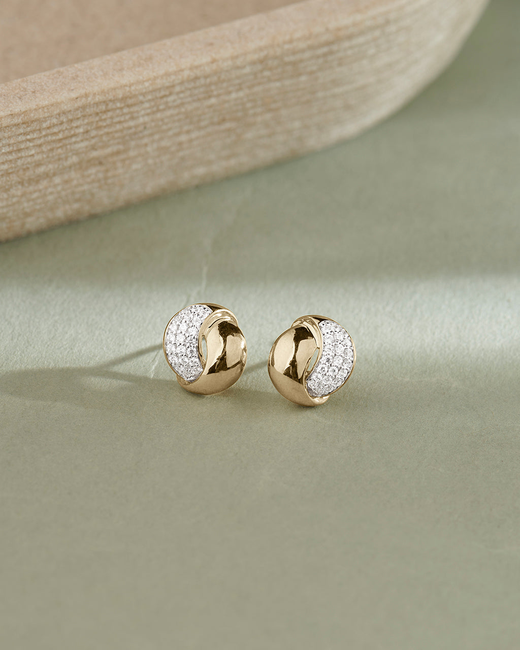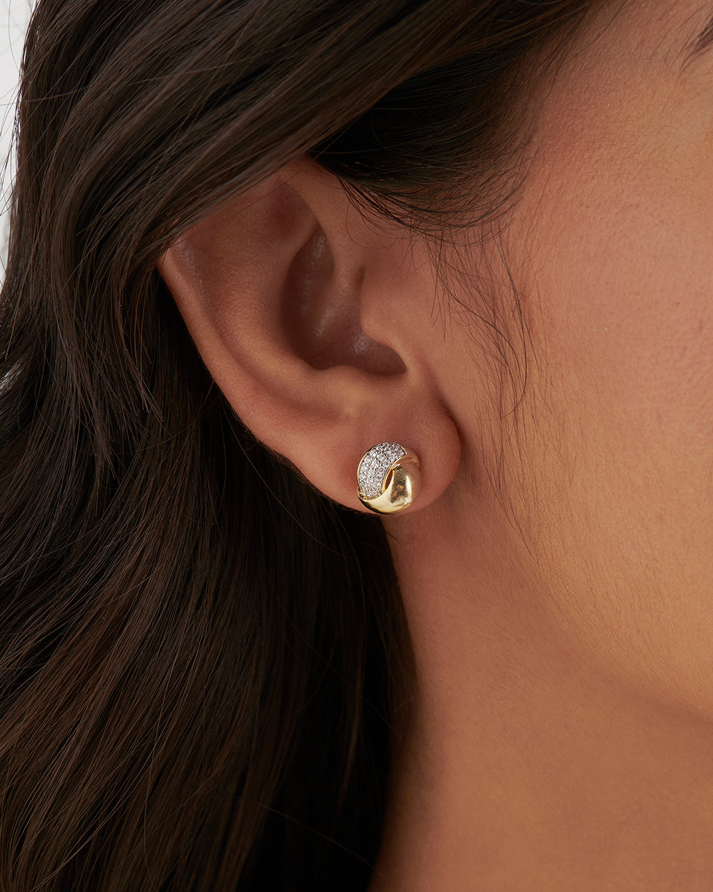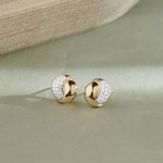 A sculpted twist with diamond detail. These 14k gold vermeil studs wrap polished gold around a panel of pavé-set diamonds, creating a modern, dimensional design that catches the light from every angle.