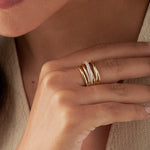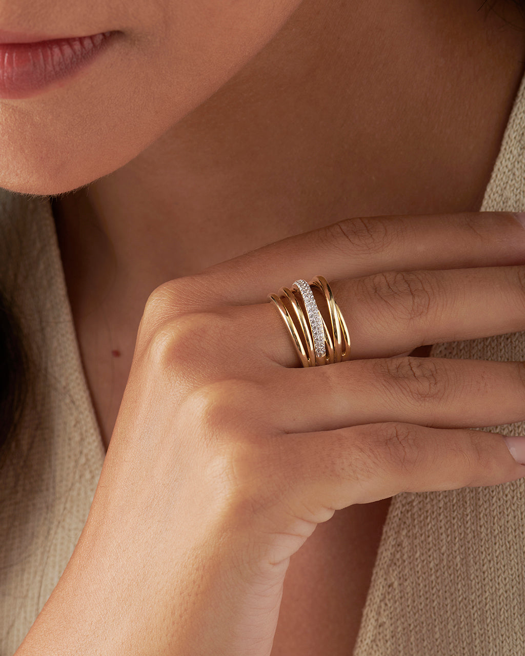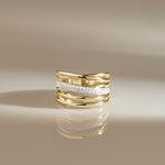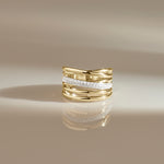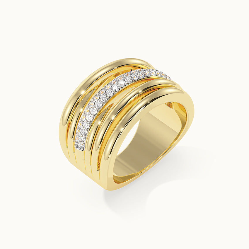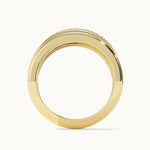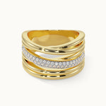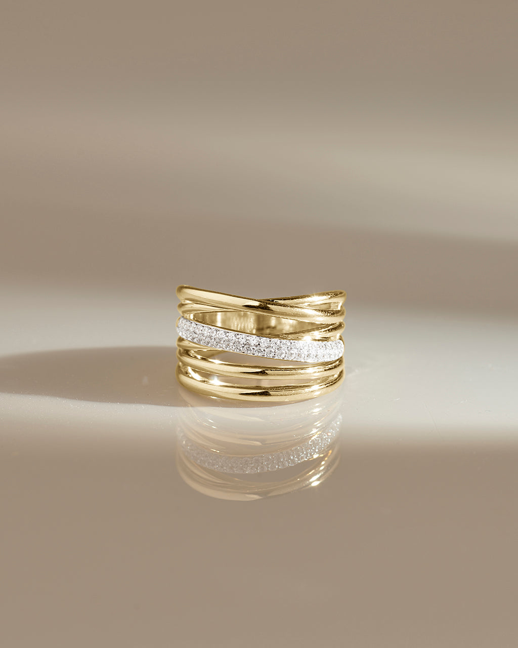 Striking lines, radiant sparkle. This 14k gold vermeil band features overlapping criss-crossed rows, some polished to a high shine and others set with pavé diamonds, creating a dynamic play of texture and light.