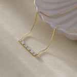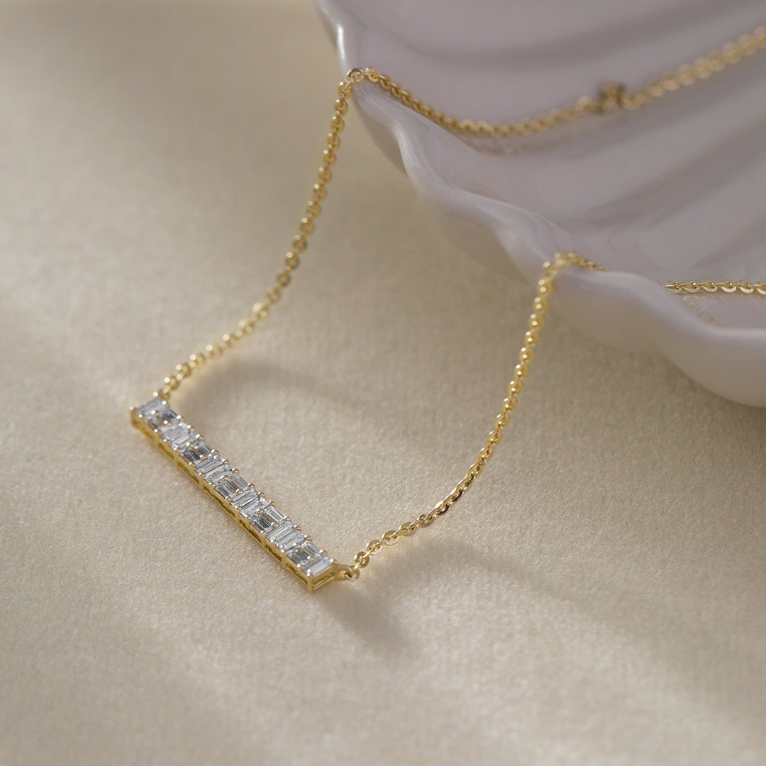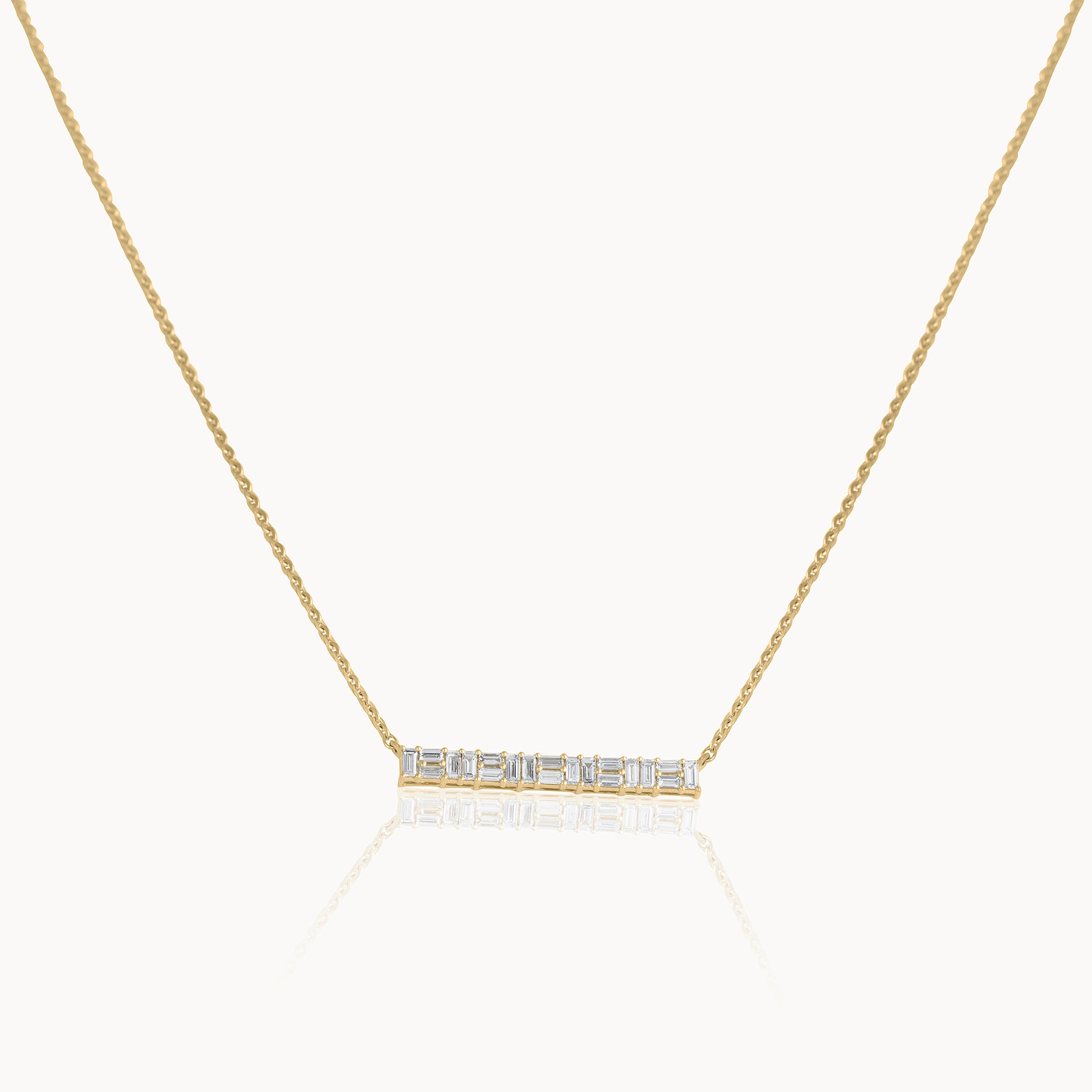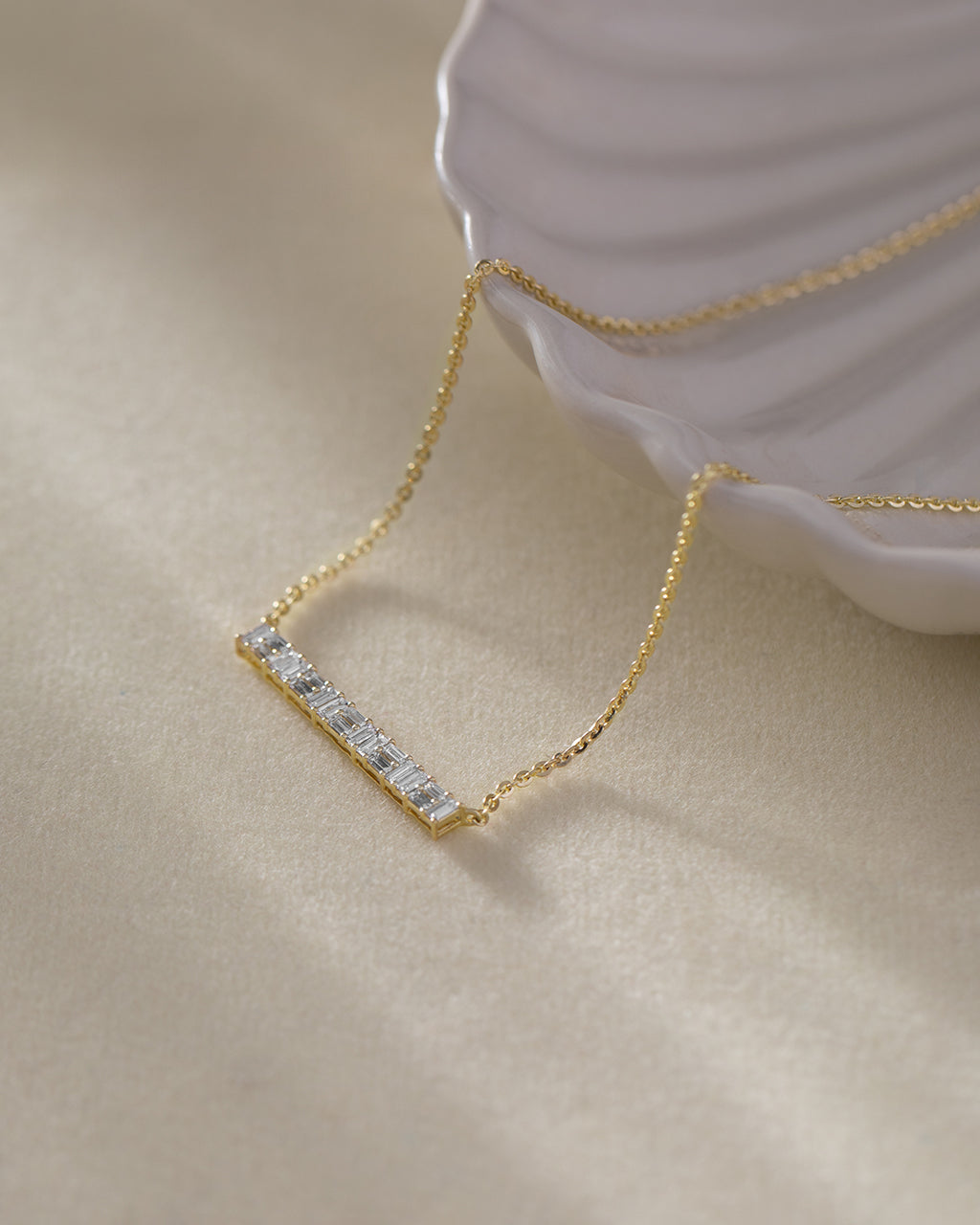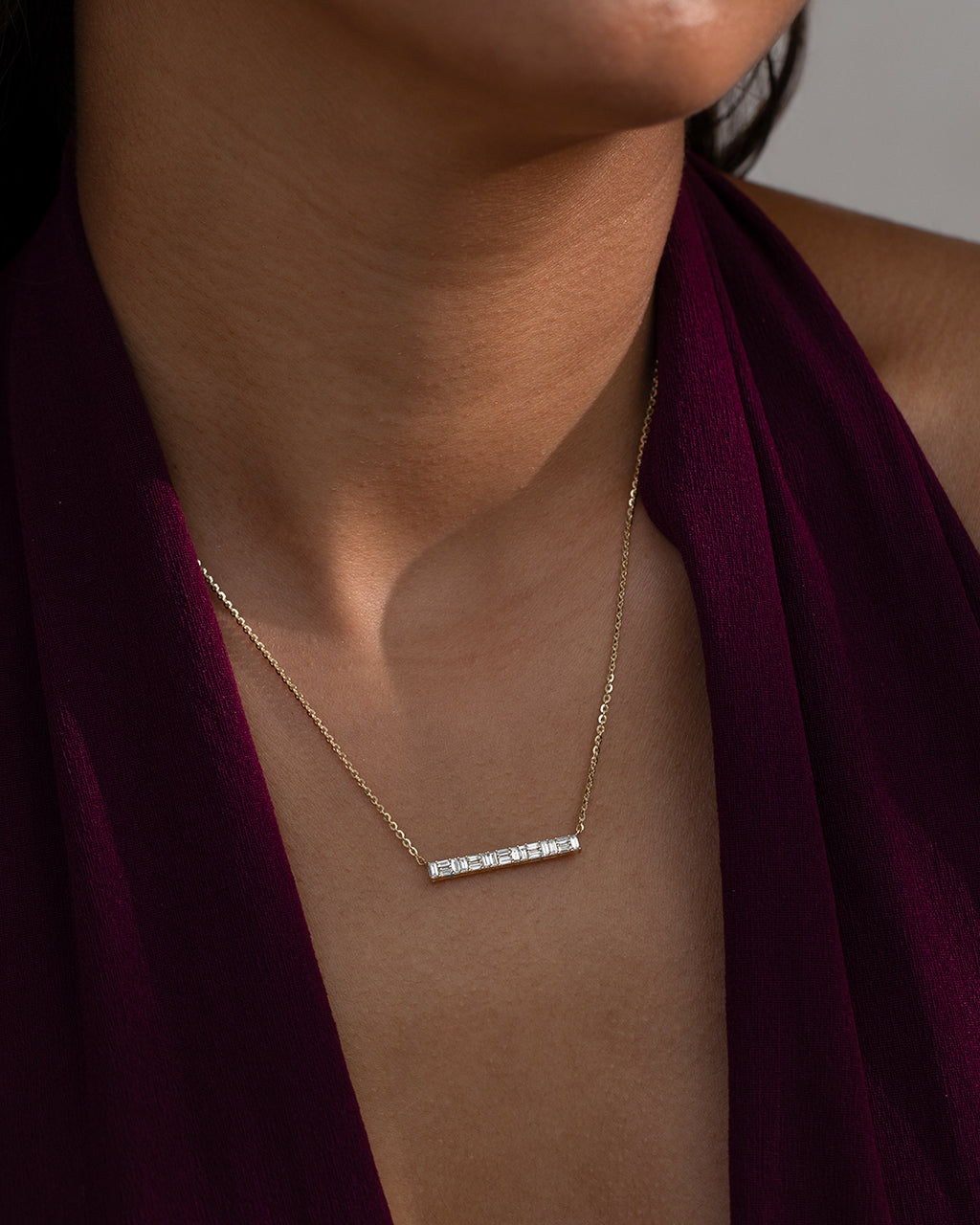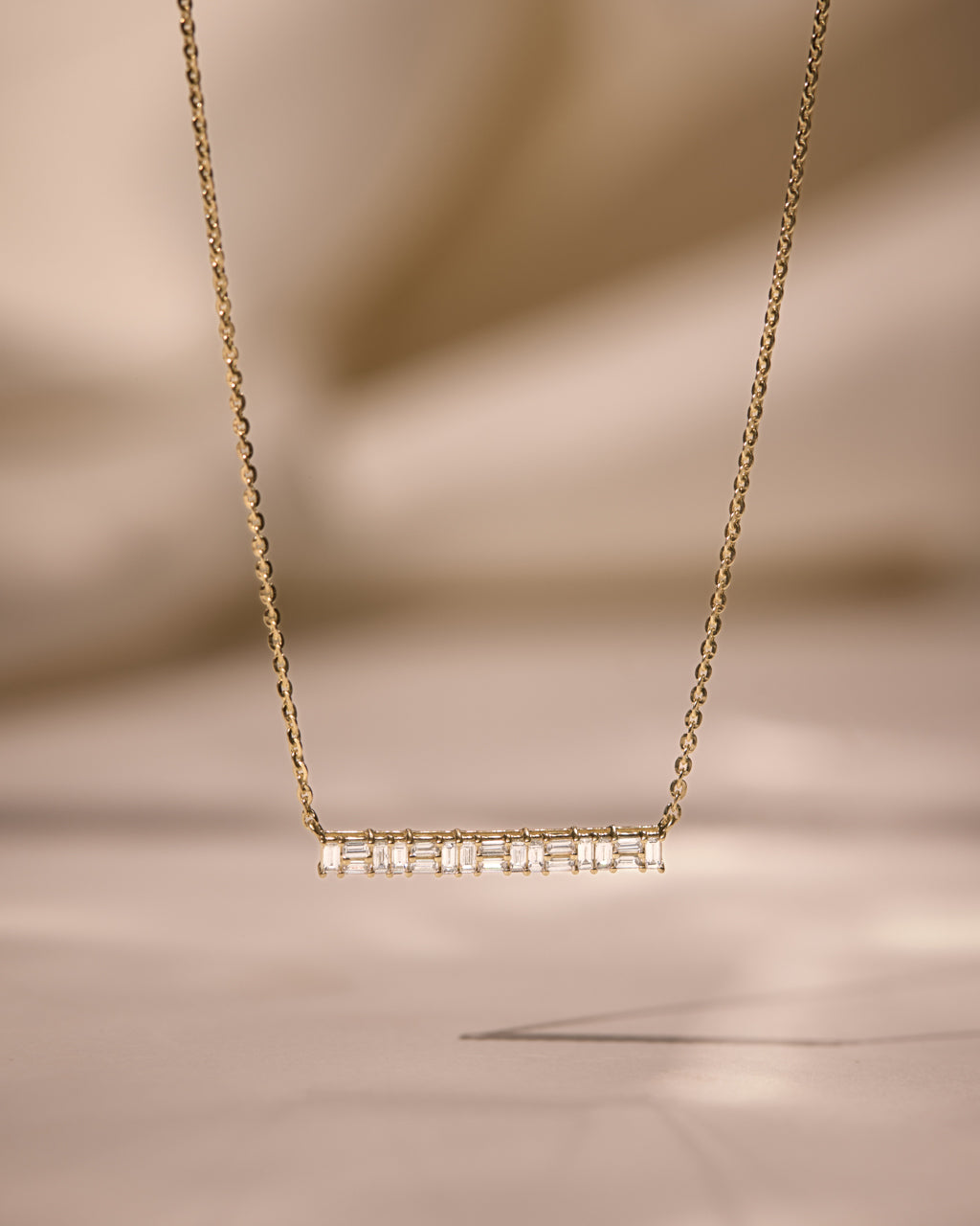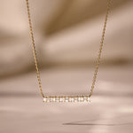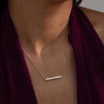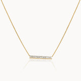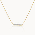 The Brilliant Bar Necklace in polished 14kt Gold Vermeil features a sleek horizontal bar accented with sparkling diamonds. An easy, everyday staple that catches the light just right.