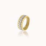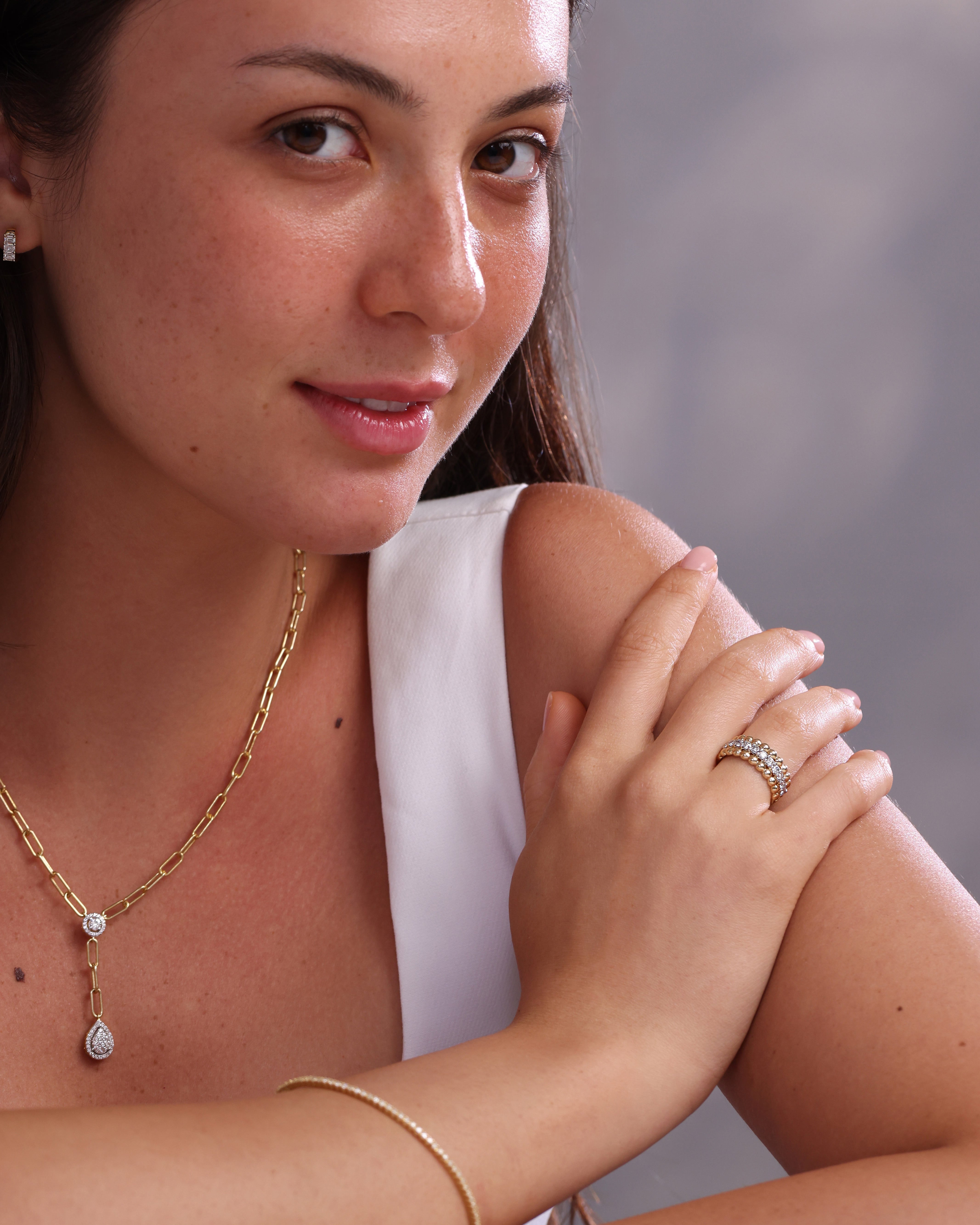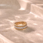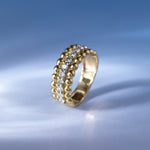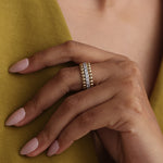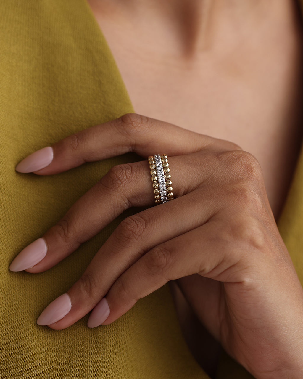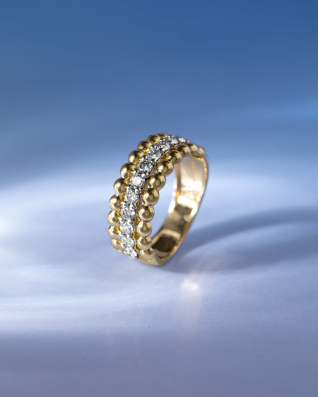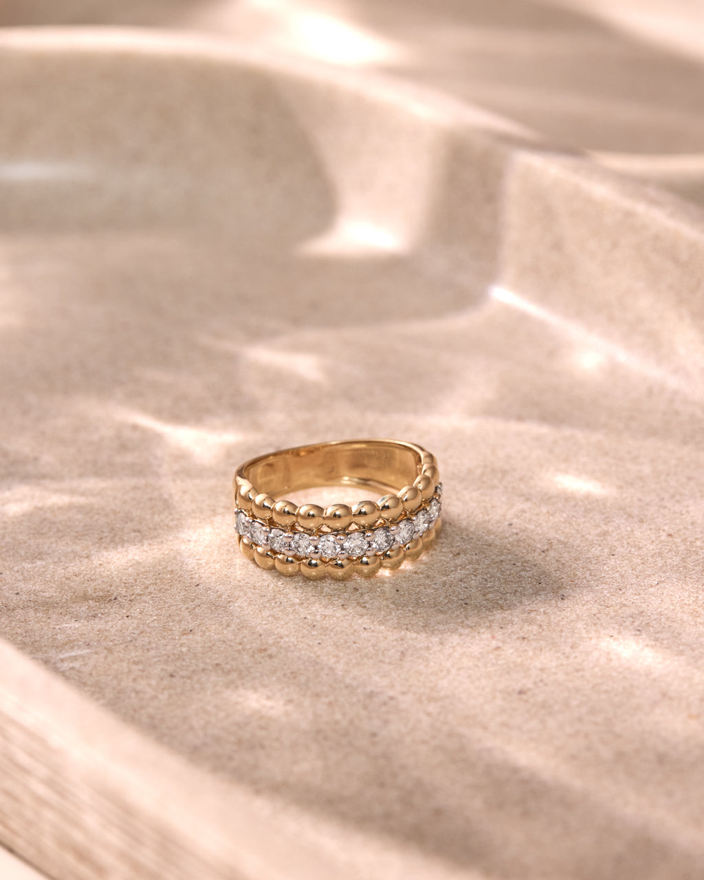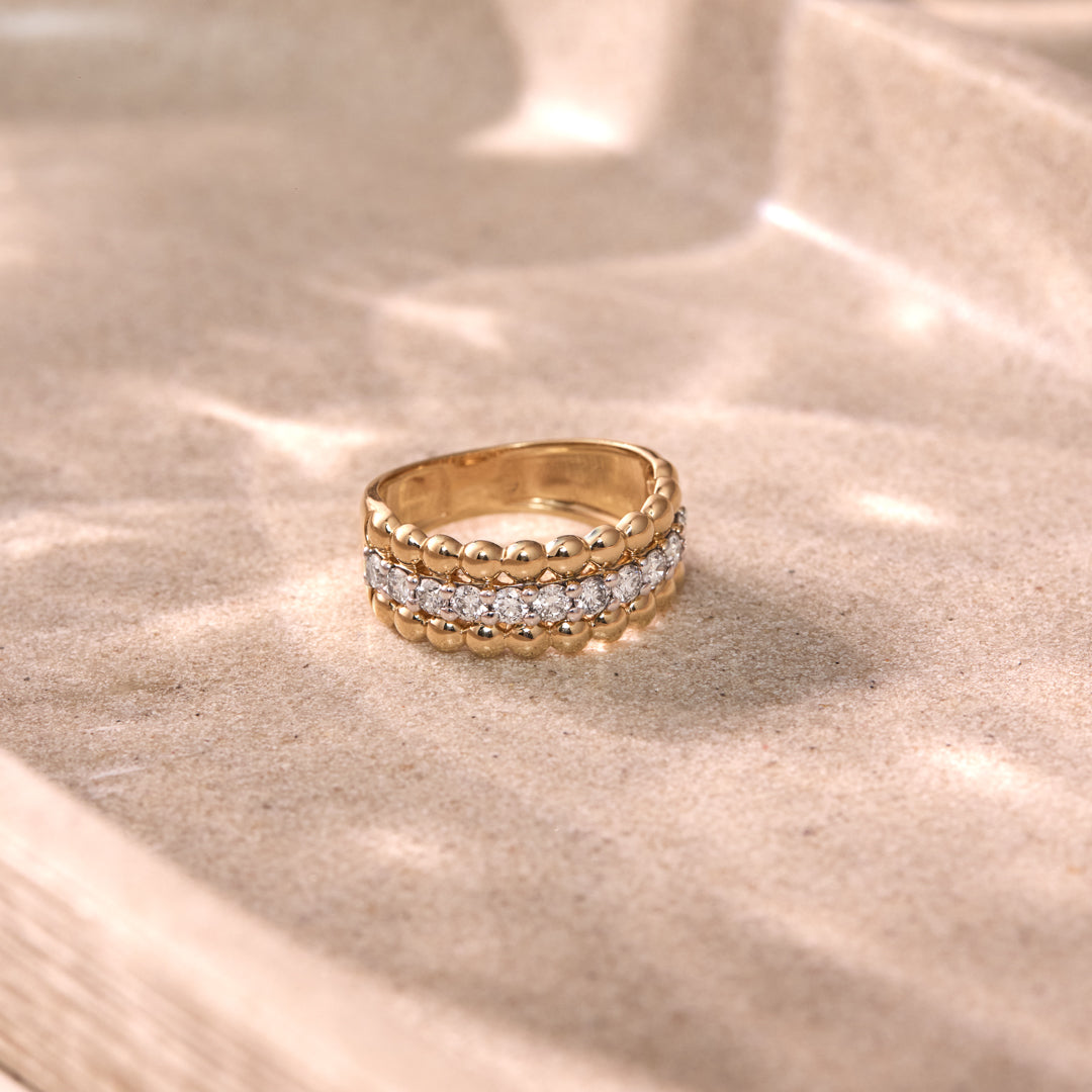 The Circles of Forever Diamond Ring plays with contrast—smooth golden curves on either side of a pavé center, delivering shine with structure.