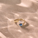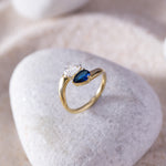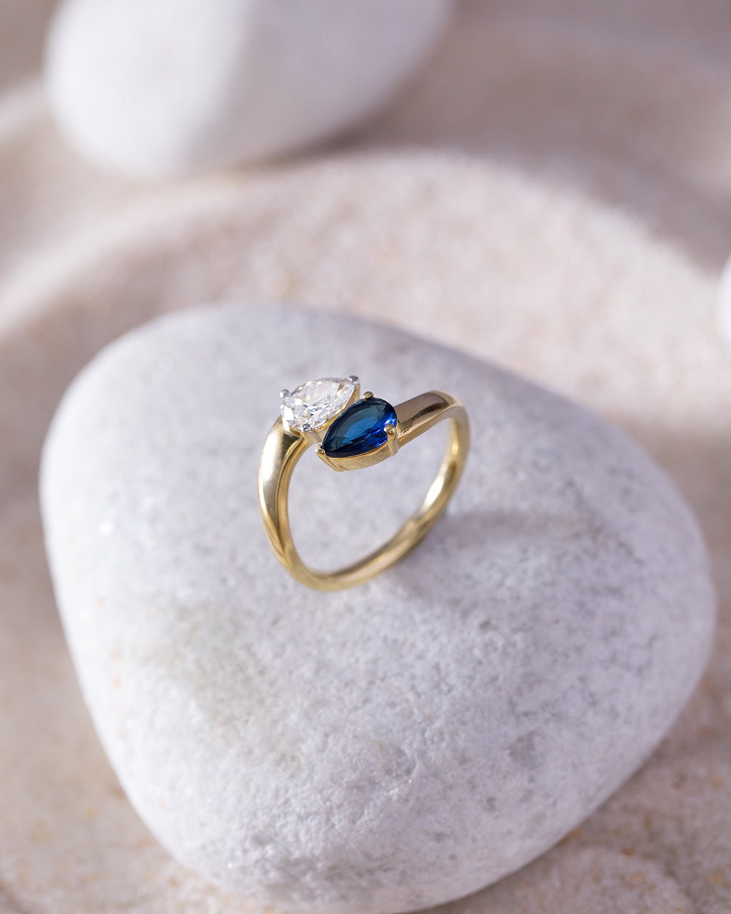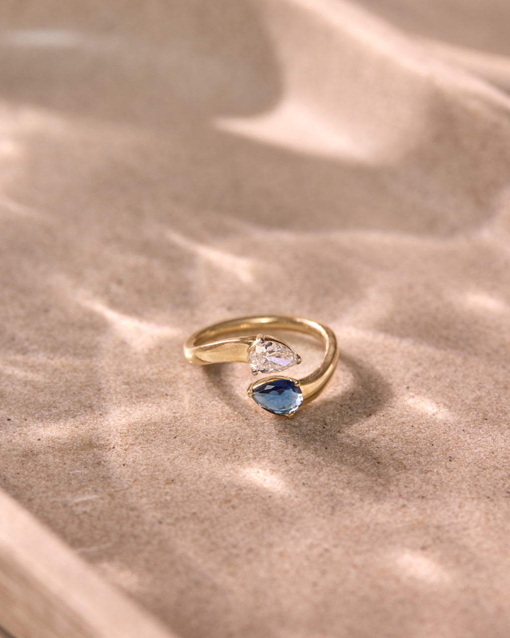 Designed with intention, this open ring pairs a deep blue sapphire with a bright white diamond, creating a sculptural silhouette that feels both modern and magnetic.
