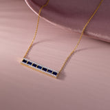 This 14kt gold vermeil bar necklace showcases 0.33 ct of rectangular created blue sapphires—clean, modern, and full of rich color with a minimalist edge.