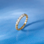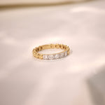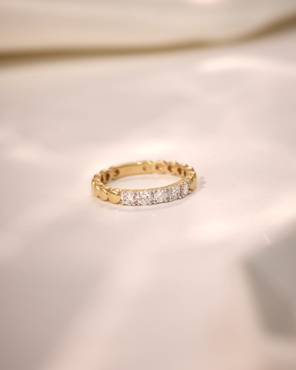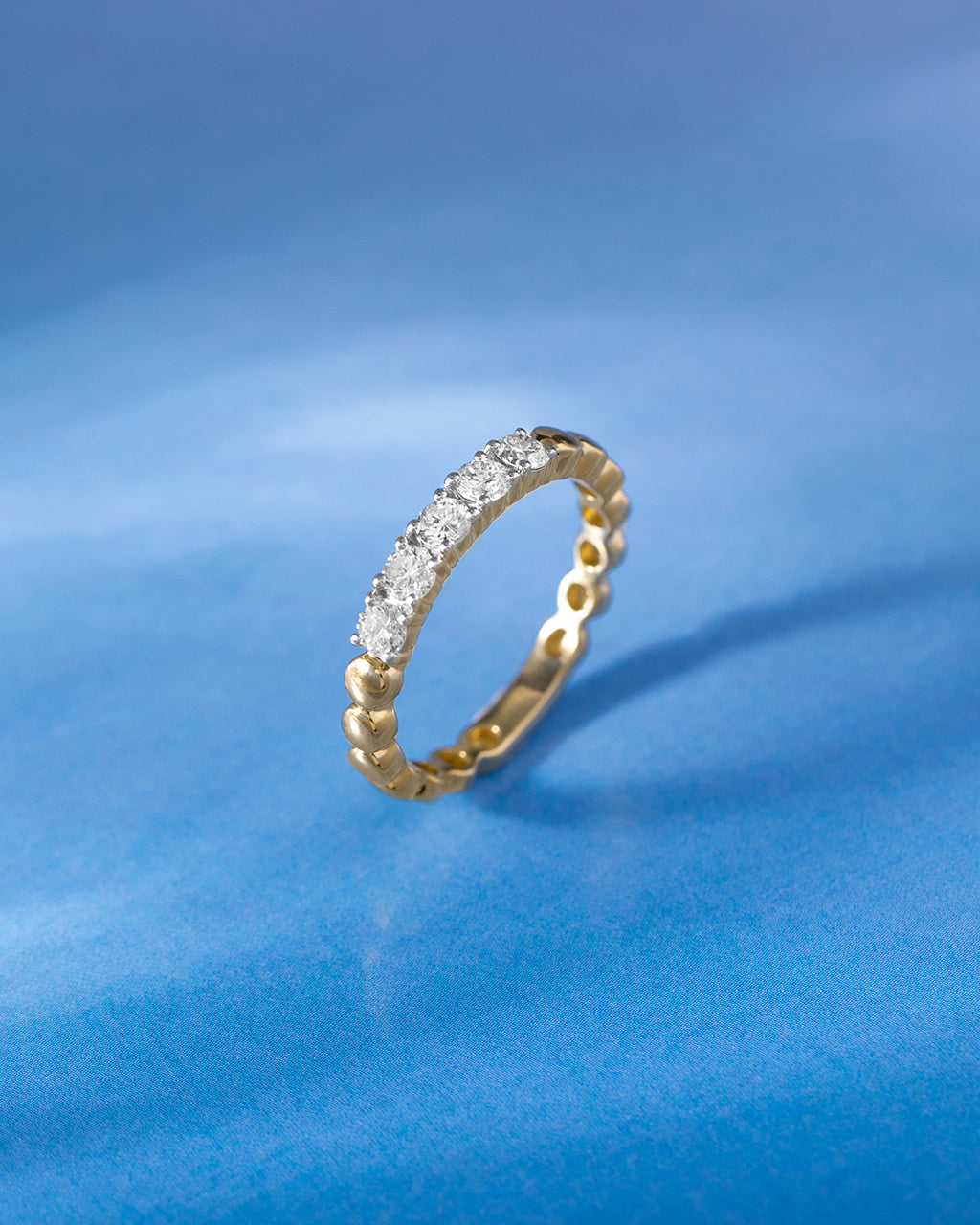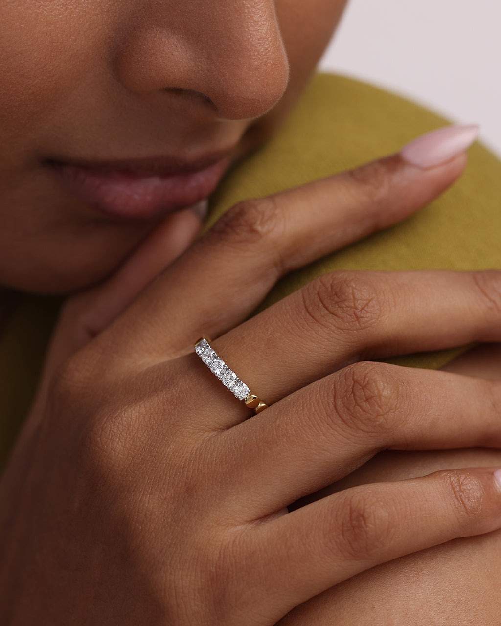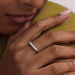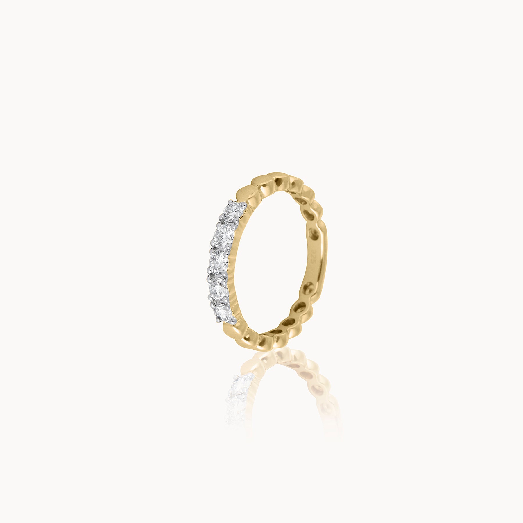 The Diamond Embrace Ring in polished 14kt Gold Vermeil features a row of brilliant-cut diamonds hugged by a sculptural gold band—crafted to feel both soft and strong in every detail.