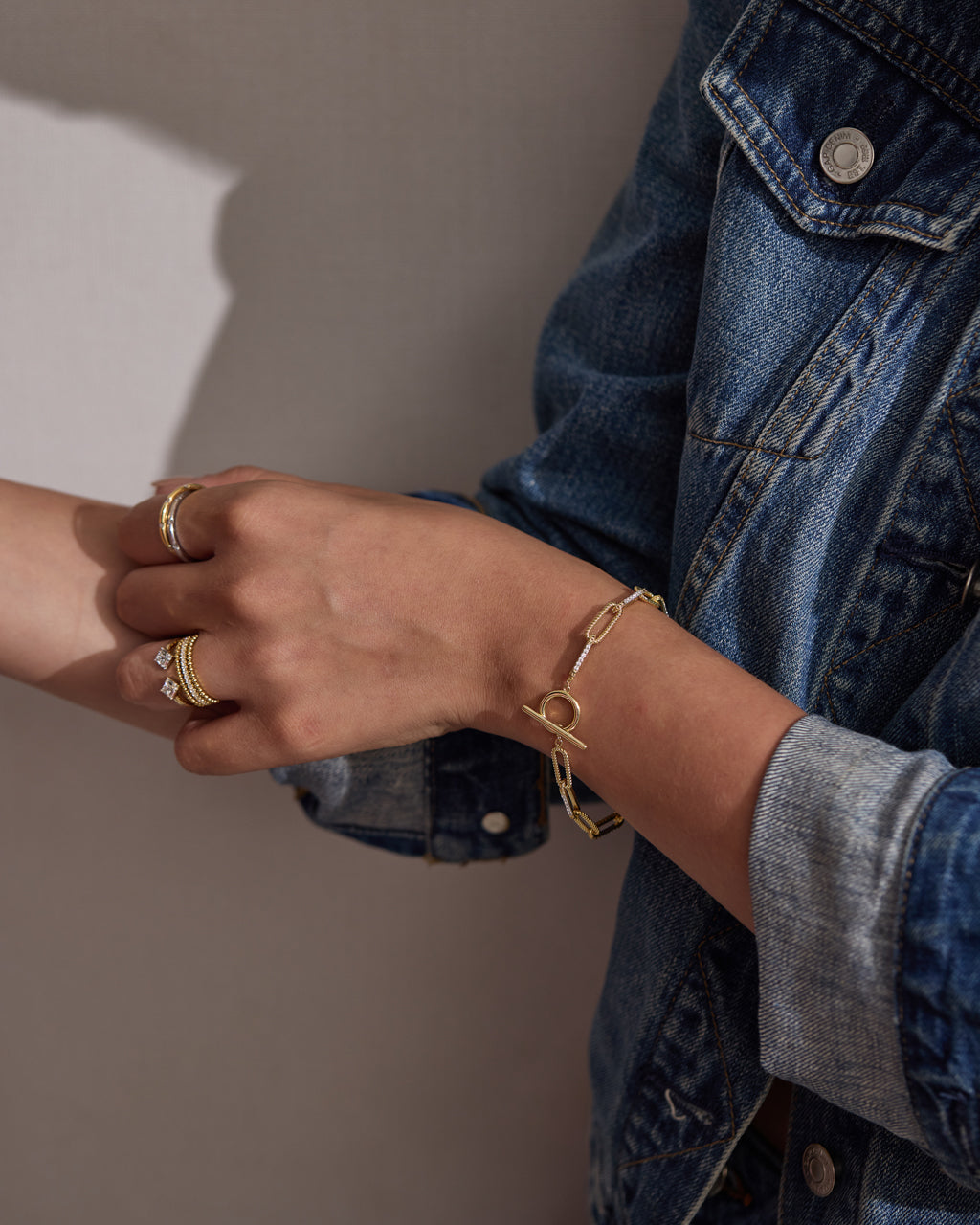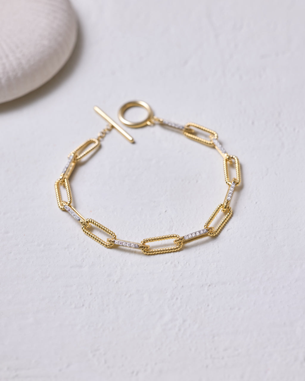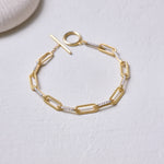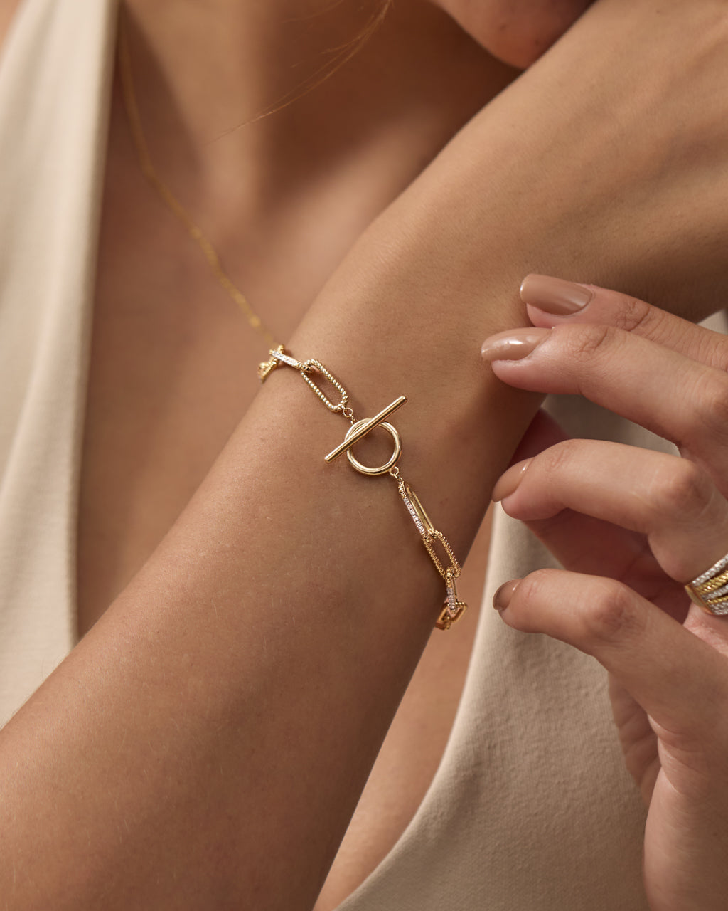 Bold links, effortless shine—the Diamond Paperclip Toggle Bracelet in polished 14kt Gold Vermeil features sleek paperclip-style links accented with sparkling diamonds, finished with an easy toggle clasp for everyday ease and style.