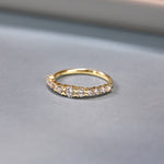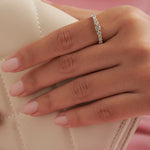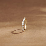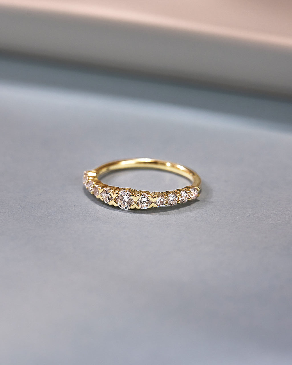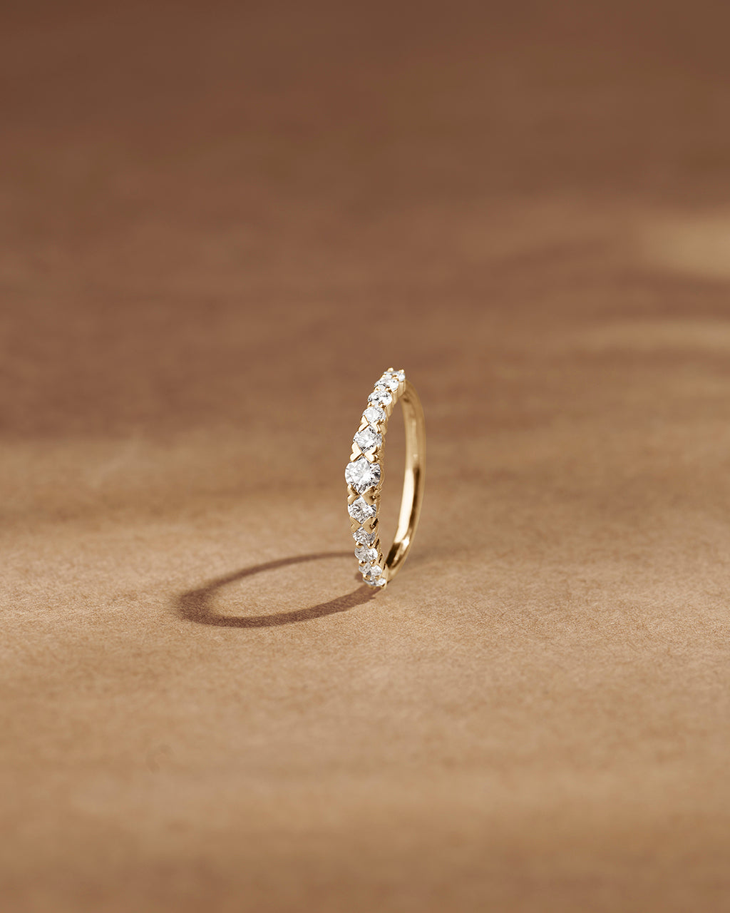 A graceful row of round diamonds, each one slightly larger at the center, creates a subtle horizon of shimmer. Set in 14kt white gold vermeil for an elegant finish.
