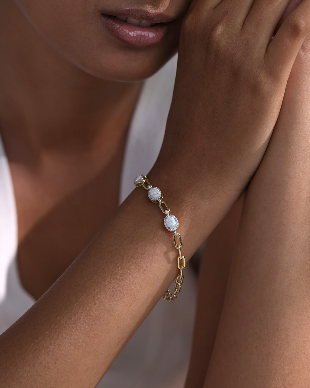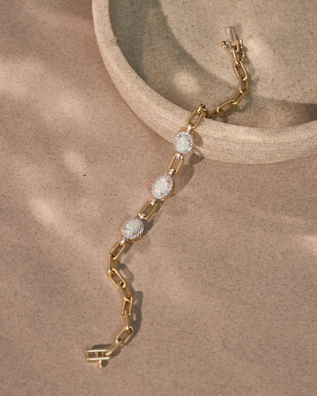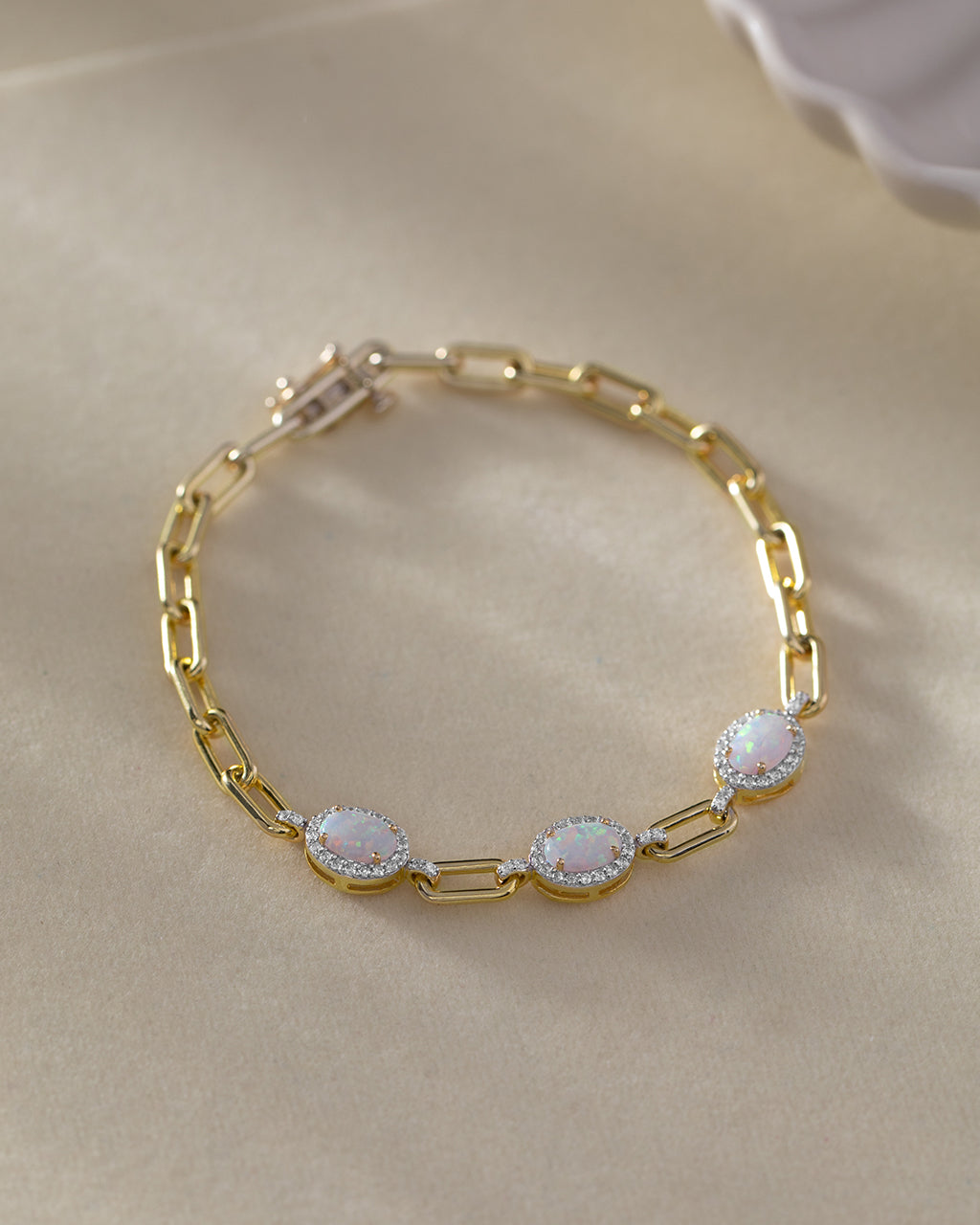 A hint of color, a lot of style—the Opal Paperclip Link Bracelet in polished 14kt Gold Vermeil is a subtle standout, pairing soft iridescence with bold lines.