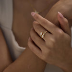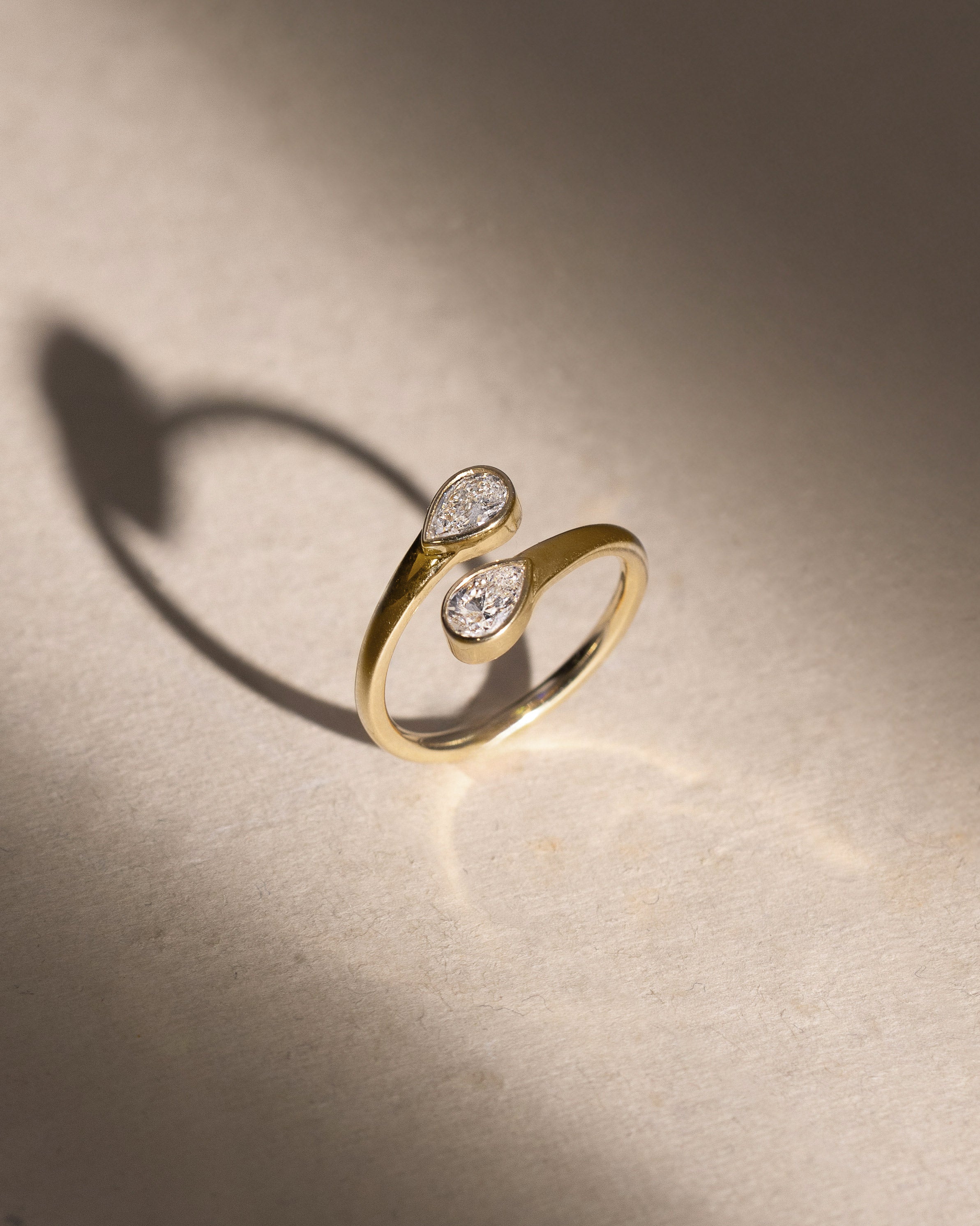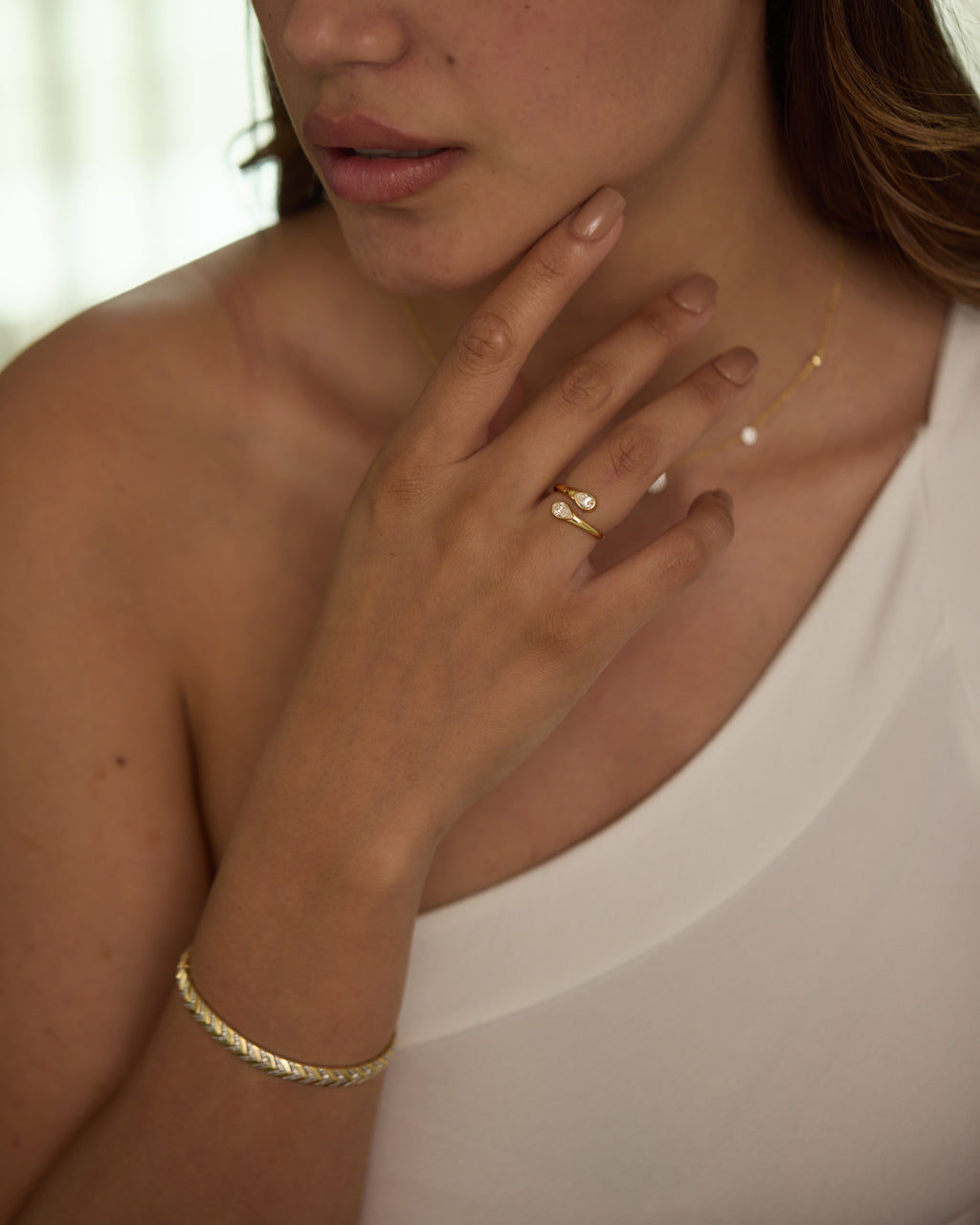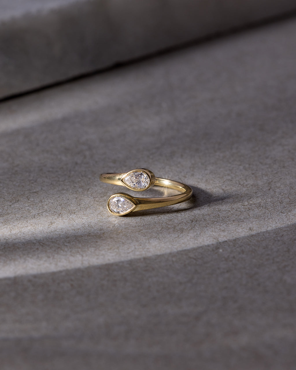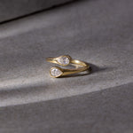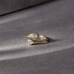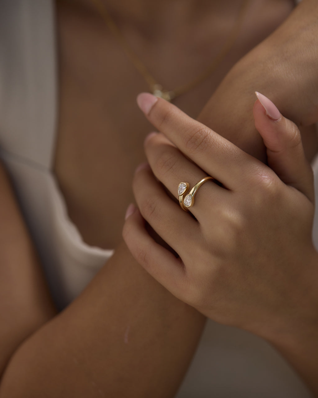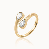 Sculptural and refined—the Pear Diamond Elegant Open Ring in polished 14kt Gold Vermeil features an open silhouette crowned with a shimmering pear-cut diamond, crafted for a graceful statement with a modern twist.