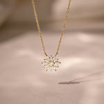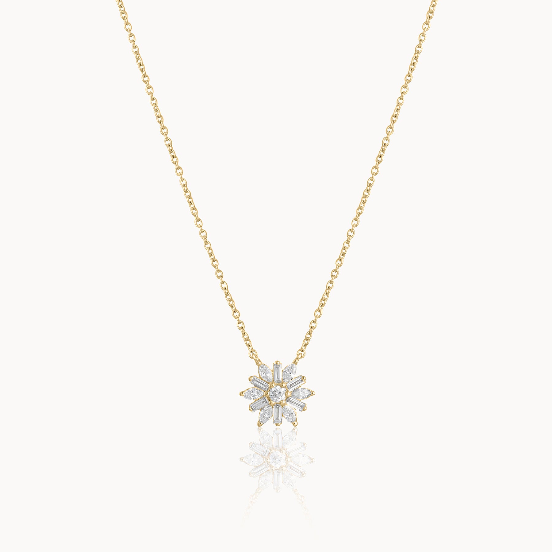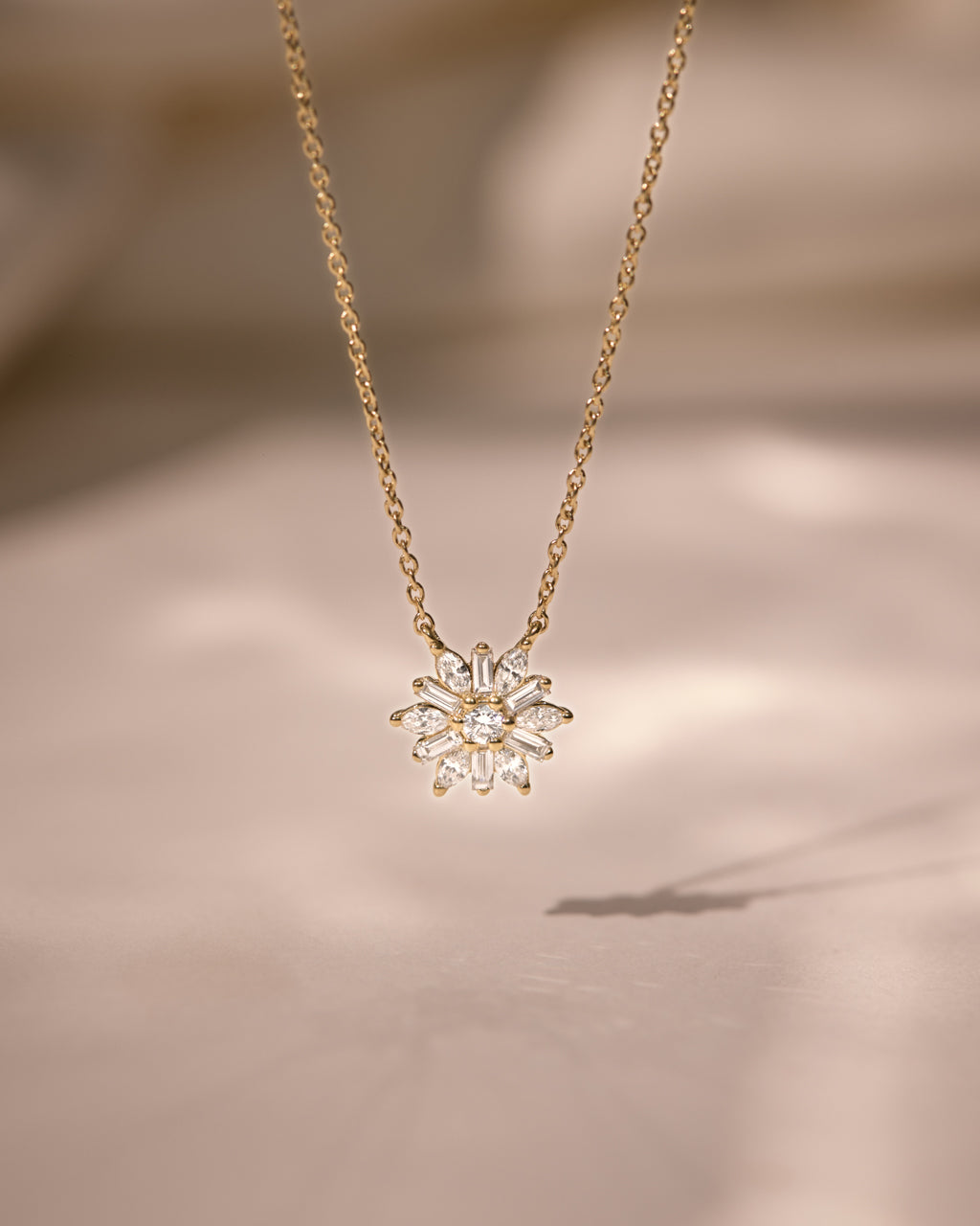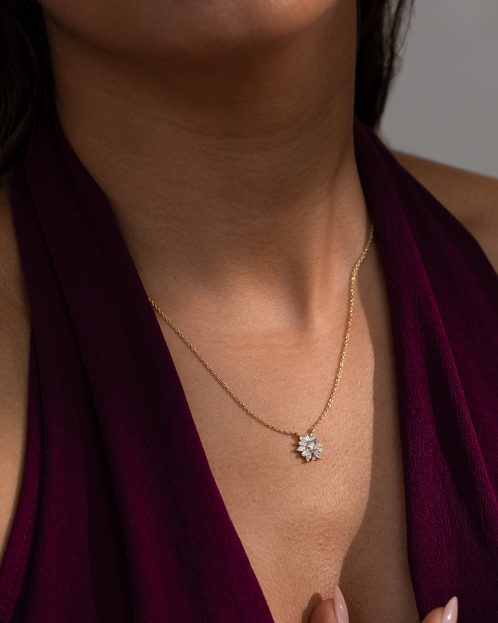 With its intricate, icy form and scattered diamond shimmer, the Snowflake Diamond Necklace brings winter’s quiet beauty into everyday glow.