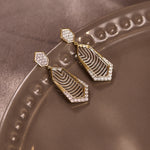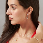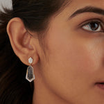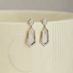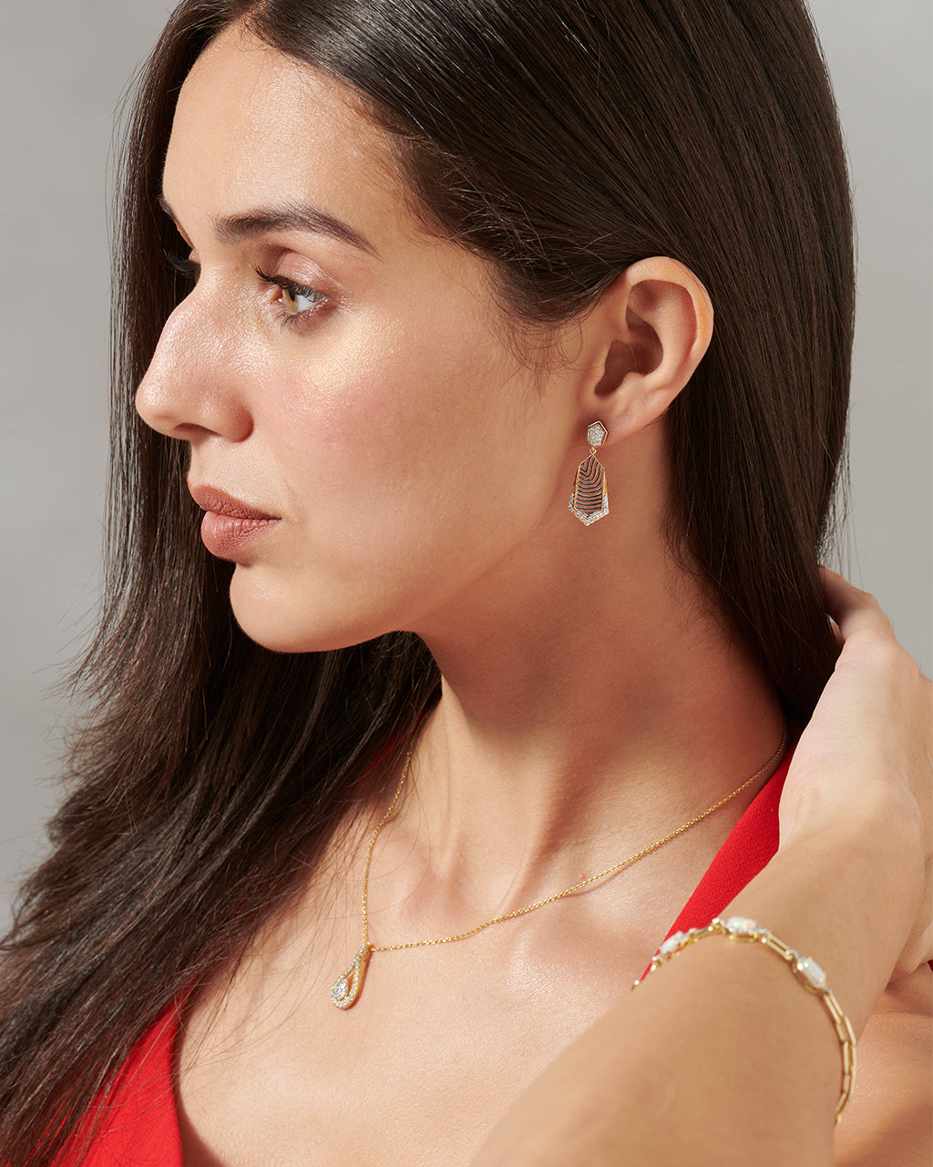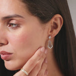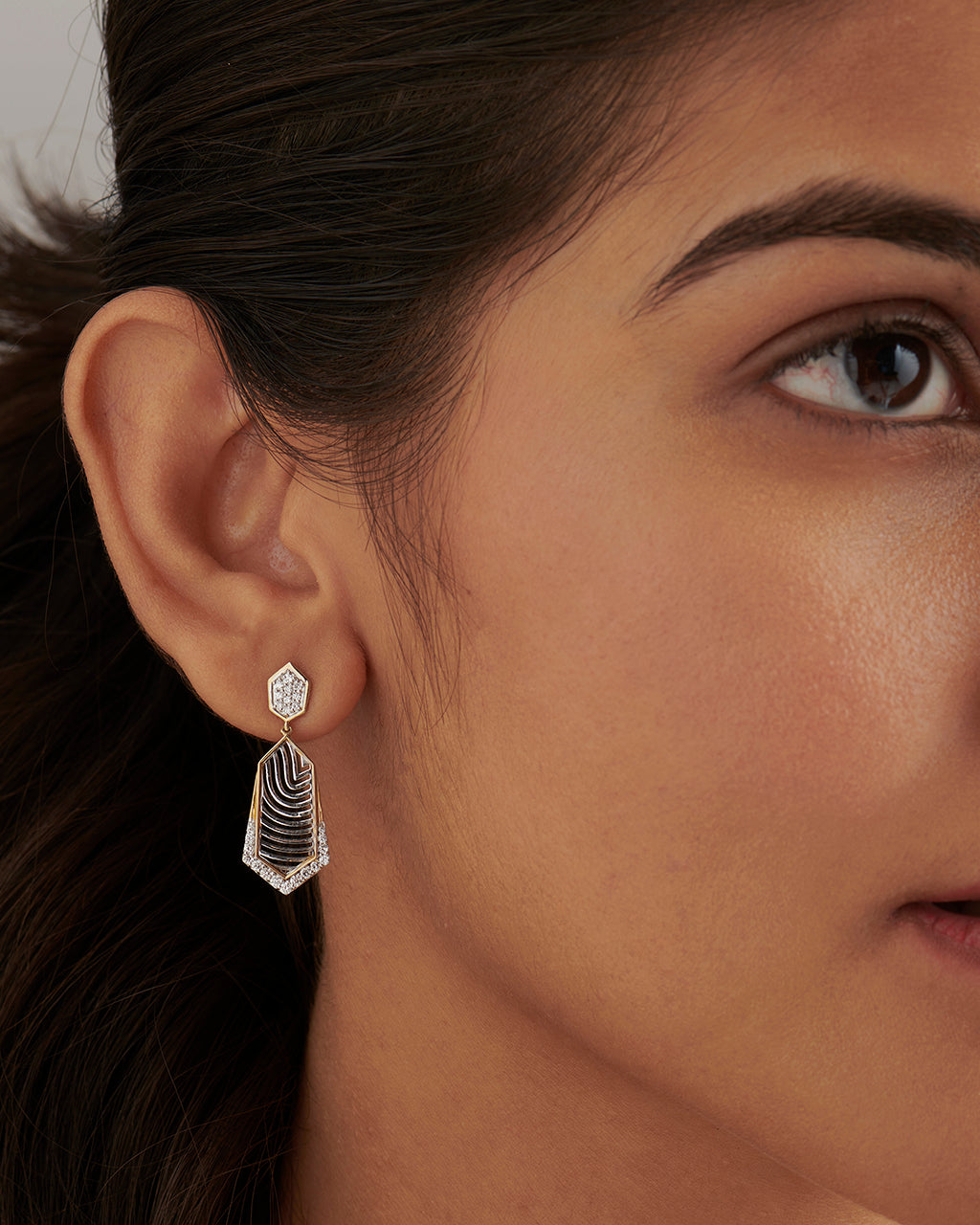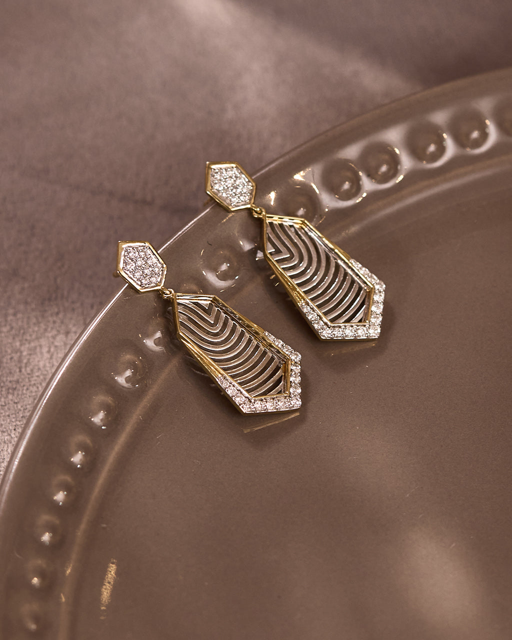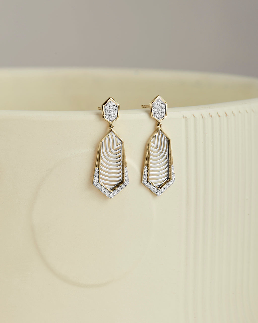 Sharp lines, radiant sparkle. A diamond-accented hexagon leads to an open angular drop framed in gold and edged with diamonds, creating a bold yet refined statement in 14k gold vermeil.