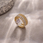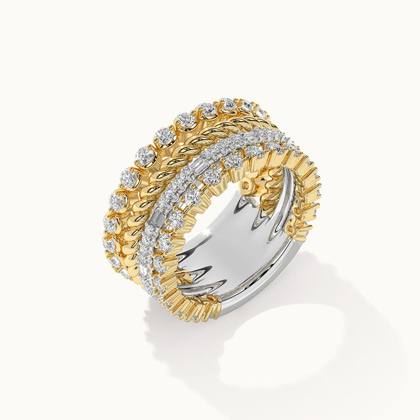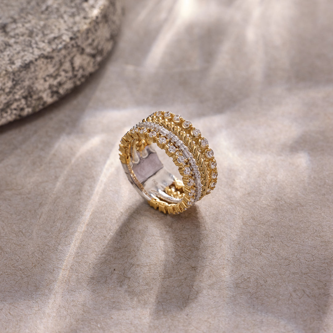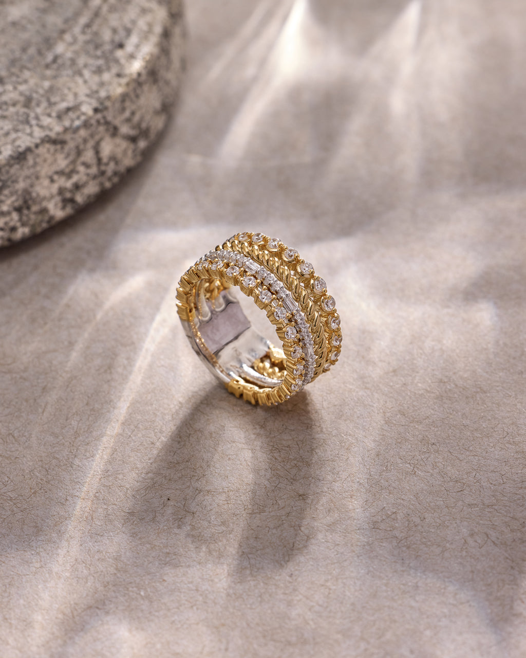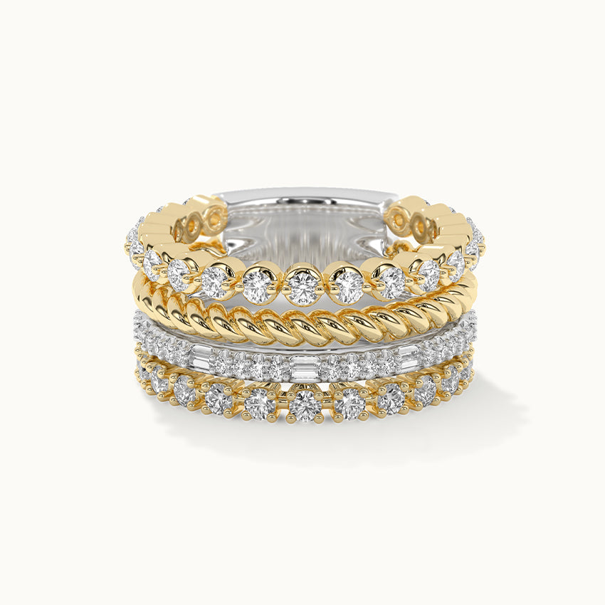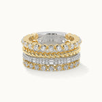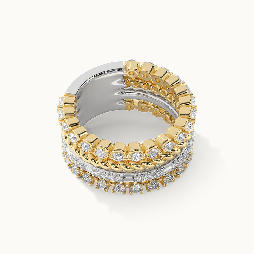 Rich in contrast and character—the Texture Two-Toned Diamond Stacked Band Ring in polished 14kt Gold Vermeil weaves together mixed metals, textured finishes, and shimmering diamonds for a bold, artful statement.