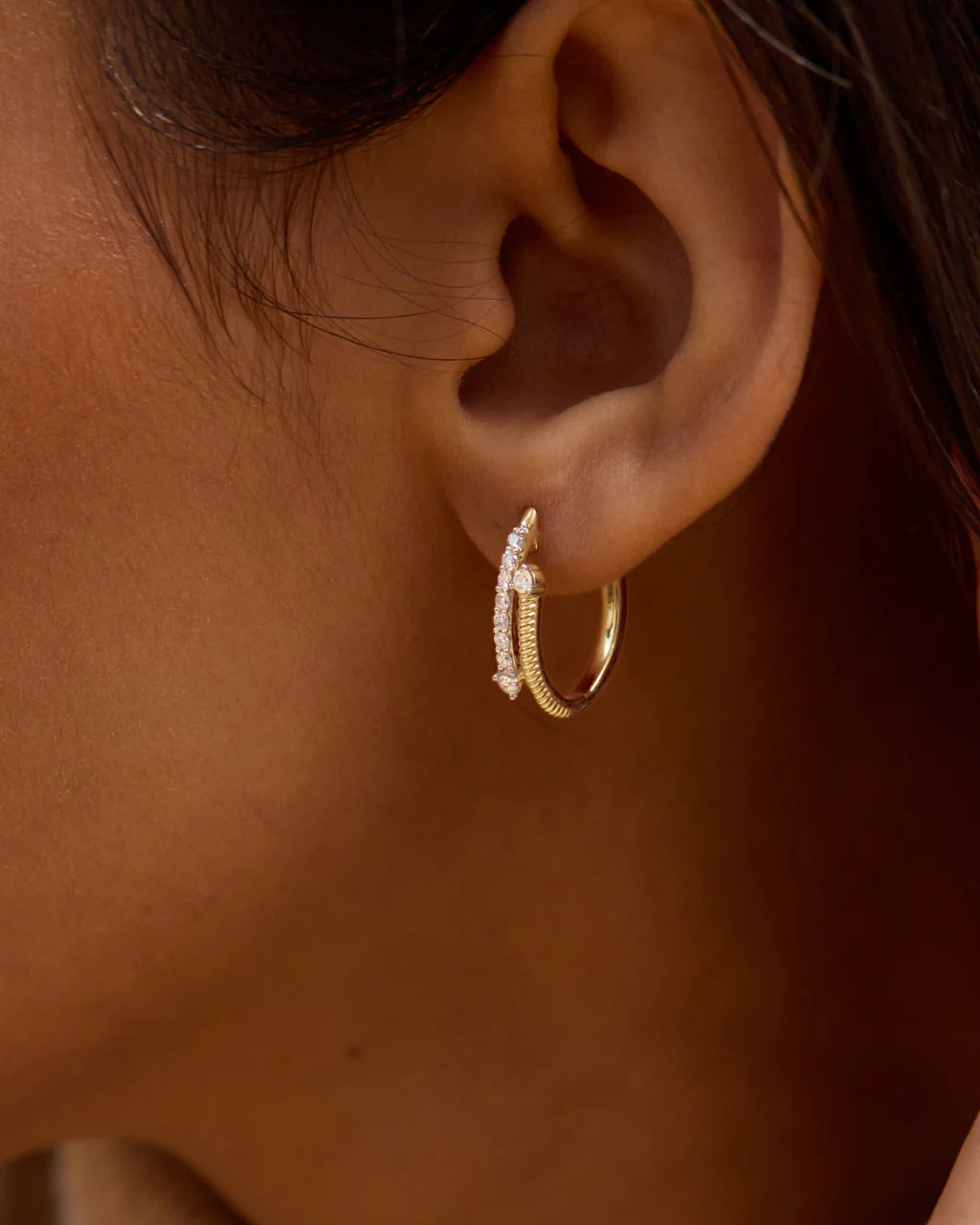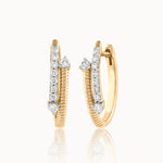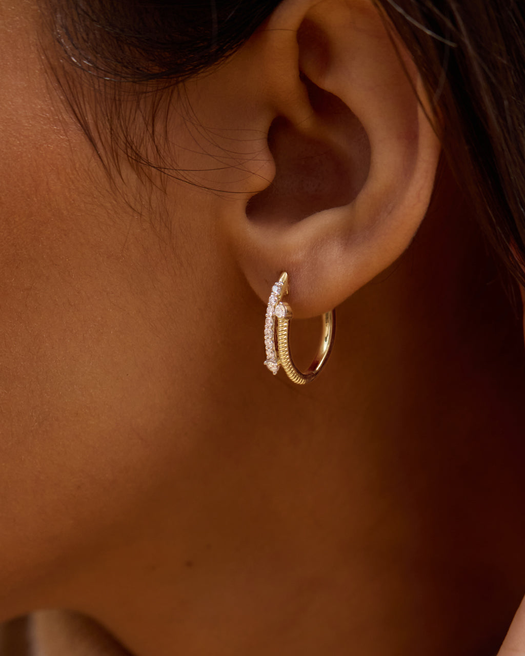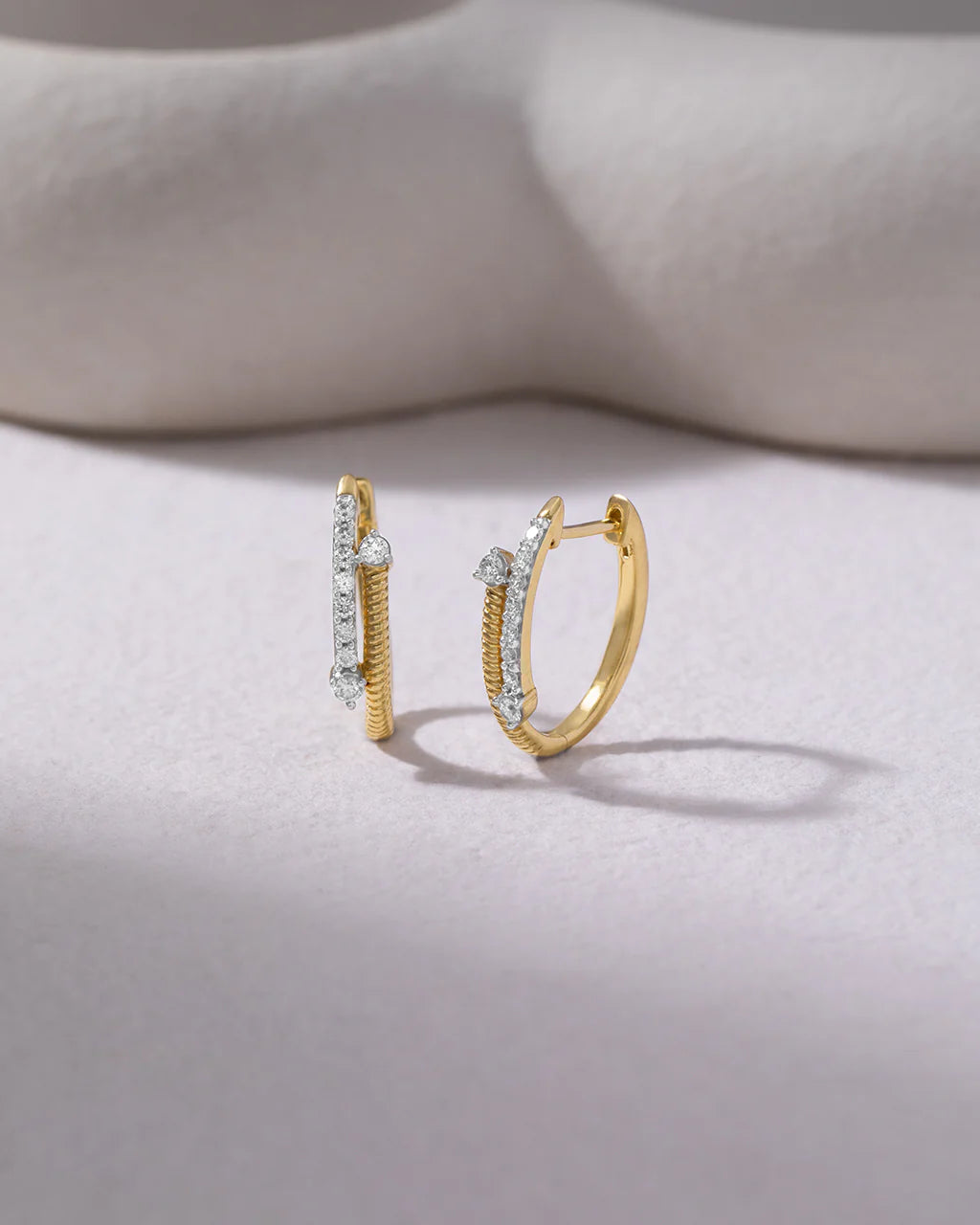 Gold and diamonds in perfect opposition, the Contrast Hoops play with texture and shine, sculpted into a clean form that feels modern, versatile, and endlessly radiant.