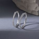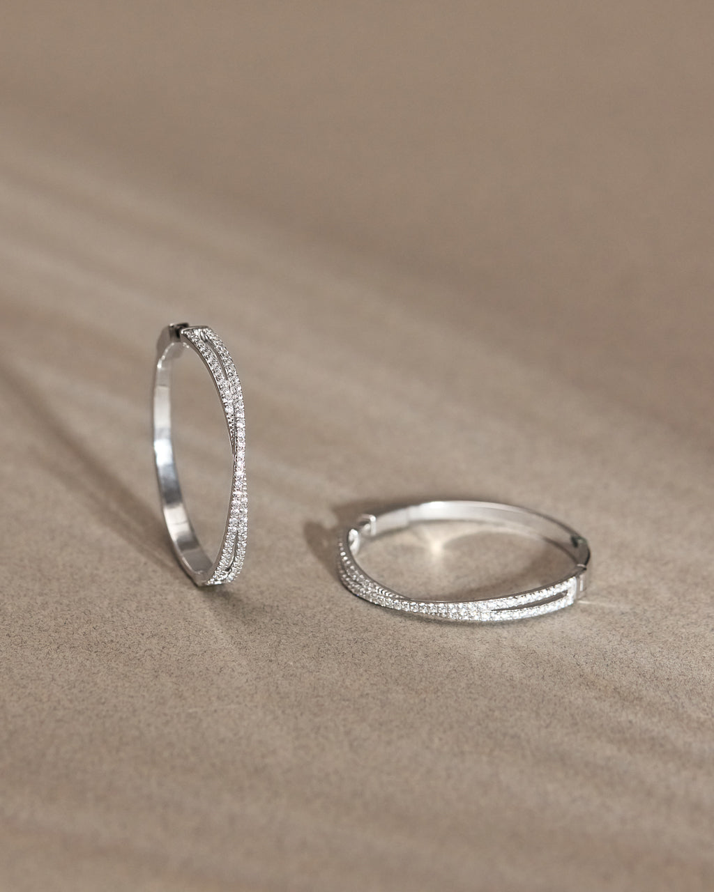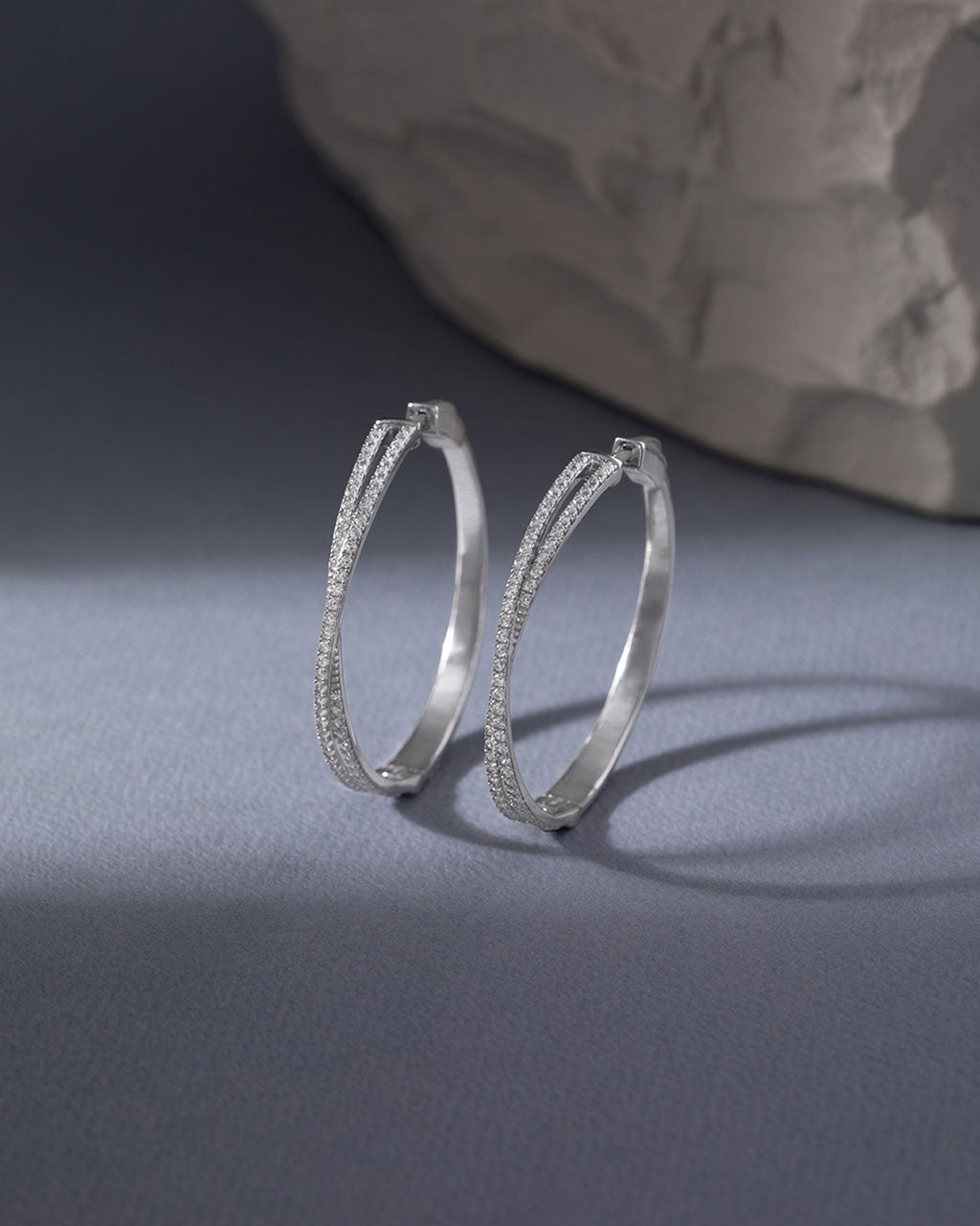 The Crossover Diamond Large Hoops feature overlapping silver bands set with pavé diamonds, forming a sculptural shape that catches light from every angle. Bold yet versatile, they’re the perfect blend of modern design and everyday wearability.